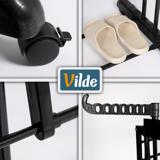 Robusten okvir iz prašno lakiranega kovina je odporen proti vlagi in se zaradi močnih palic pod obremenitvijo ne deformira. Teleskopska širina 75–135 cm prihrani prostor, medtem ko 6 koles (3 z zavoro) zagotavlja enostavno premikanje in zanesljivo fiksiranje na mestu.