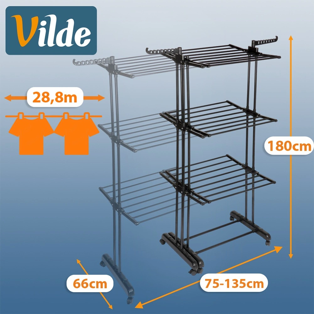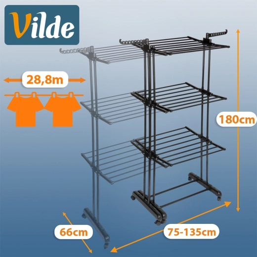 Praktično vertikalno stojalo za sušenje perila s teleskopsko širino 75–135 cm ponuja 3 sušilne ravni, 47 palic in do 28,8 m sušilne površine. Zahvaljujoč stabilni kovinski konstrukciji, 6 kolesom z zavoro in zložljivim stranskim rokam za obešalnike zlahka posušite velike in majhne količine perila ter prihranite prostor.