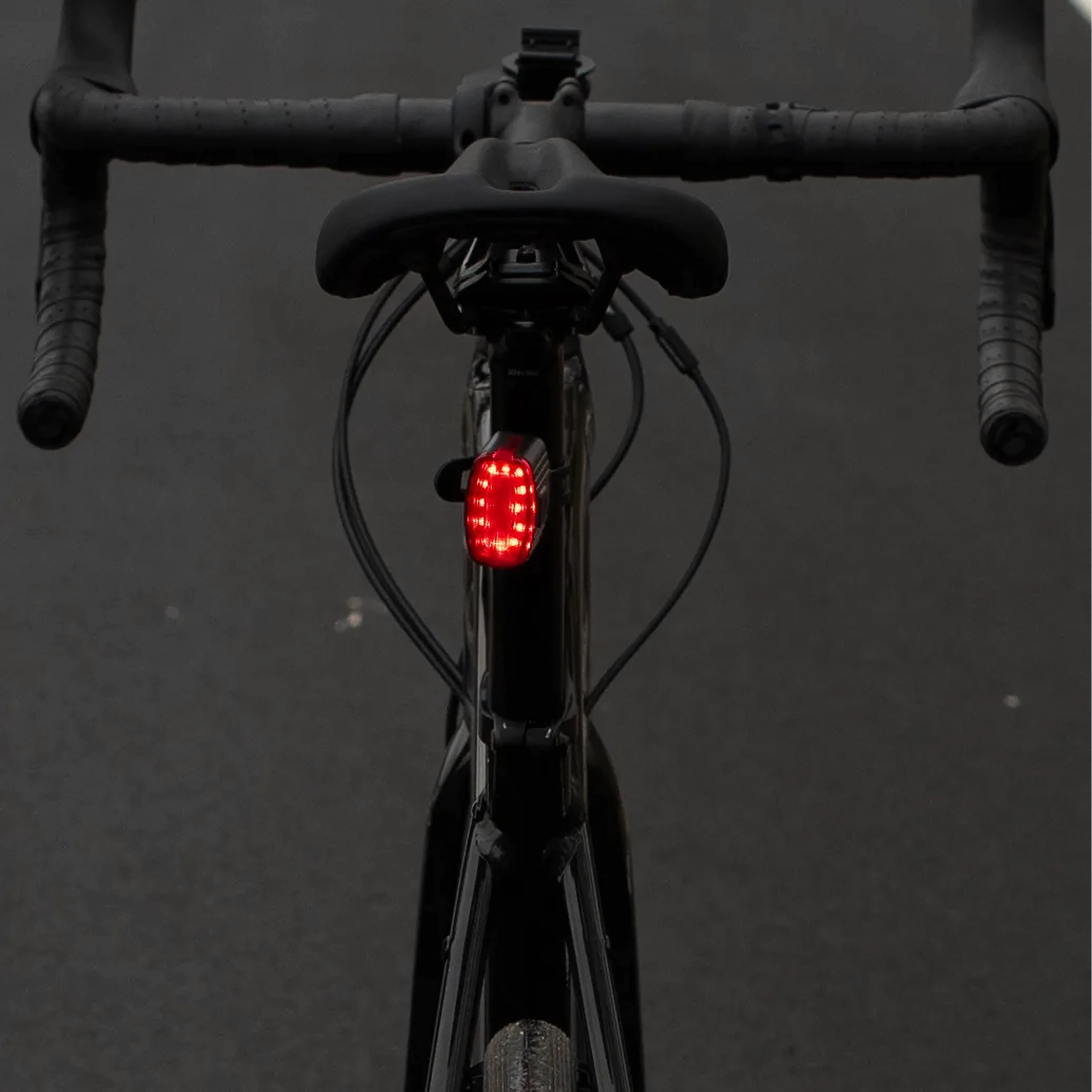 Rdeča LED luč z več načini izrazito opozori voznike in kolesarje za vami. Enostavna pritrditev na sedežno oporo z elastičnim trakom.