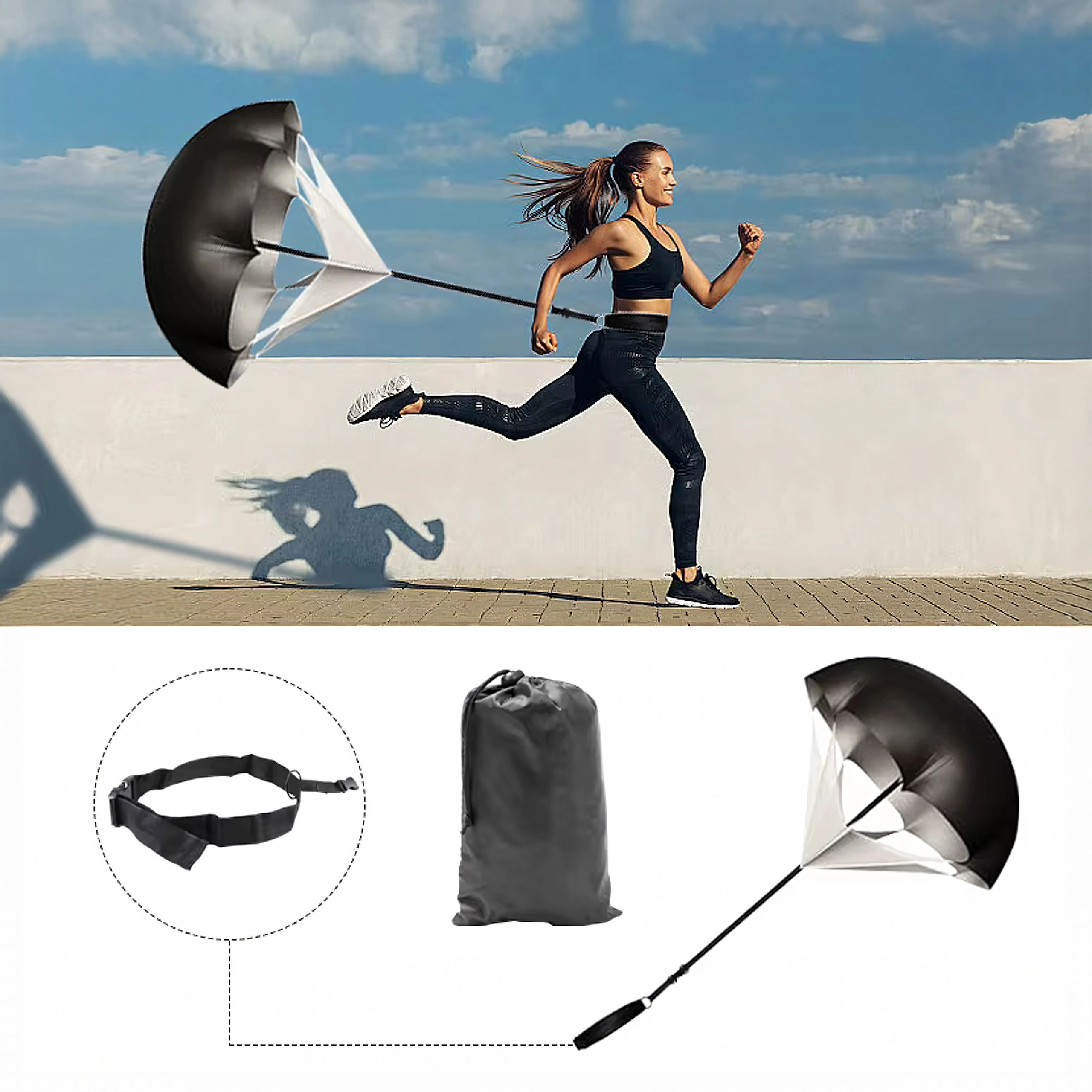 Lahka padalska obtežitev poveča upor pri sprintu in pomaga razvijati pospešek ter maksimalno hitrost. Nastavljiv pas ostane trdno na mestu, padalo pa se zlahka zloži v priloženo vrečo.