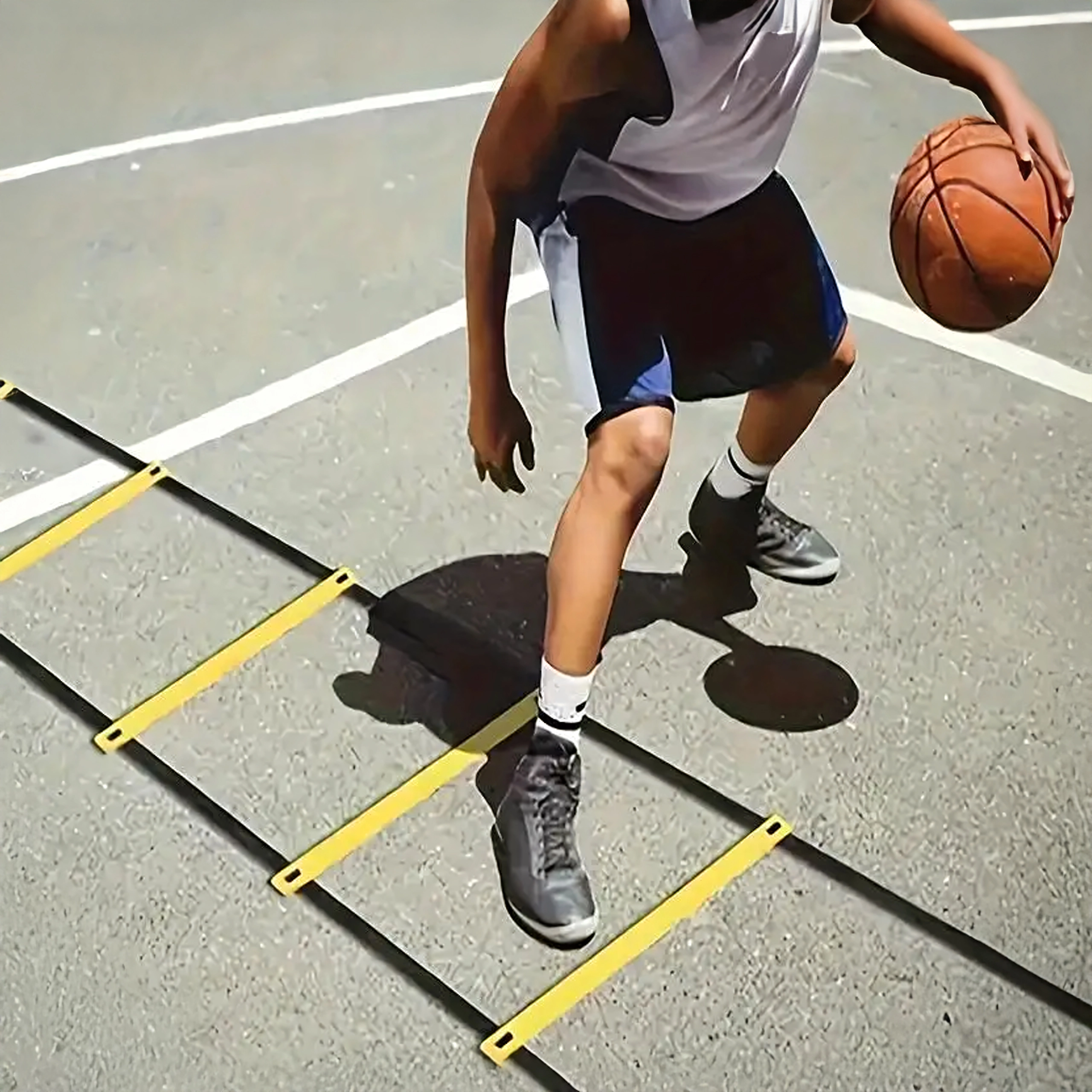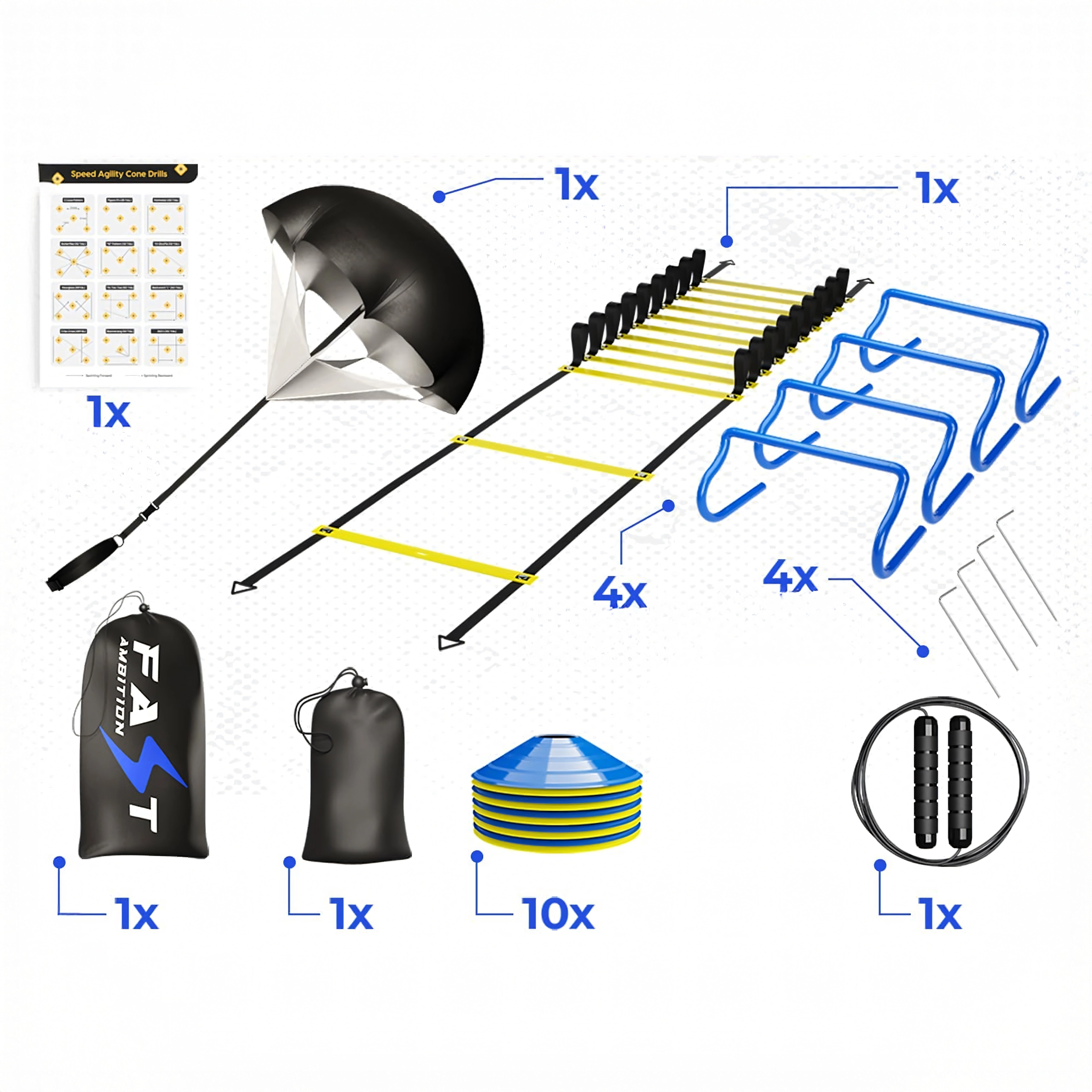 Koordinacijska lestev z nastavljivimi ploščatimi prečkami izboljšuje tehniko koraka in stabilnost gležnjev. Nizkoprofilni stožci in mini ovire povečajo intenzivnost drilov brez nepotrebnega tveganja spotikanja. Uporno padalo doda spremenljivo obremenitev za hitrostno-moč tek, kolebnica pa dopolni kardio del treninga.