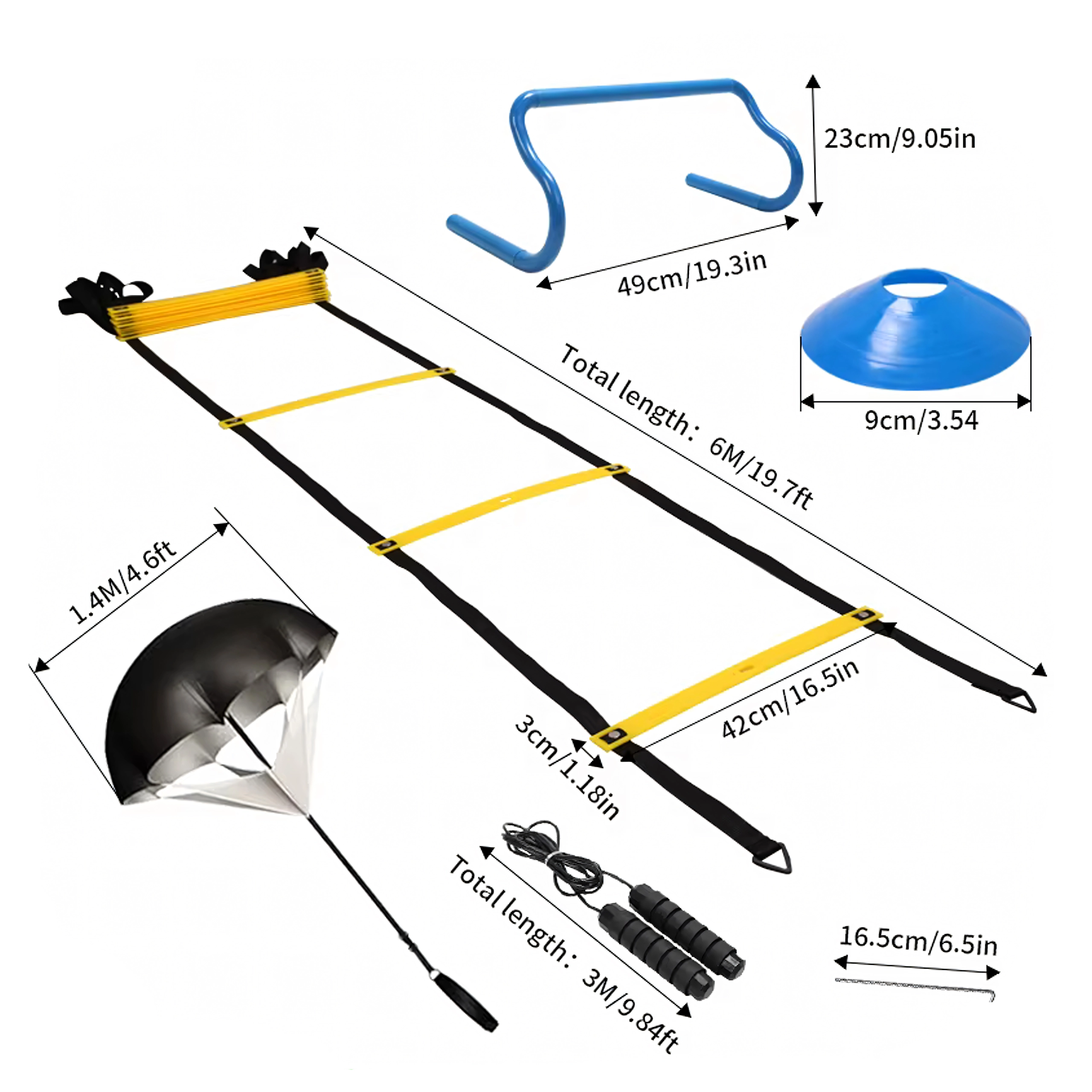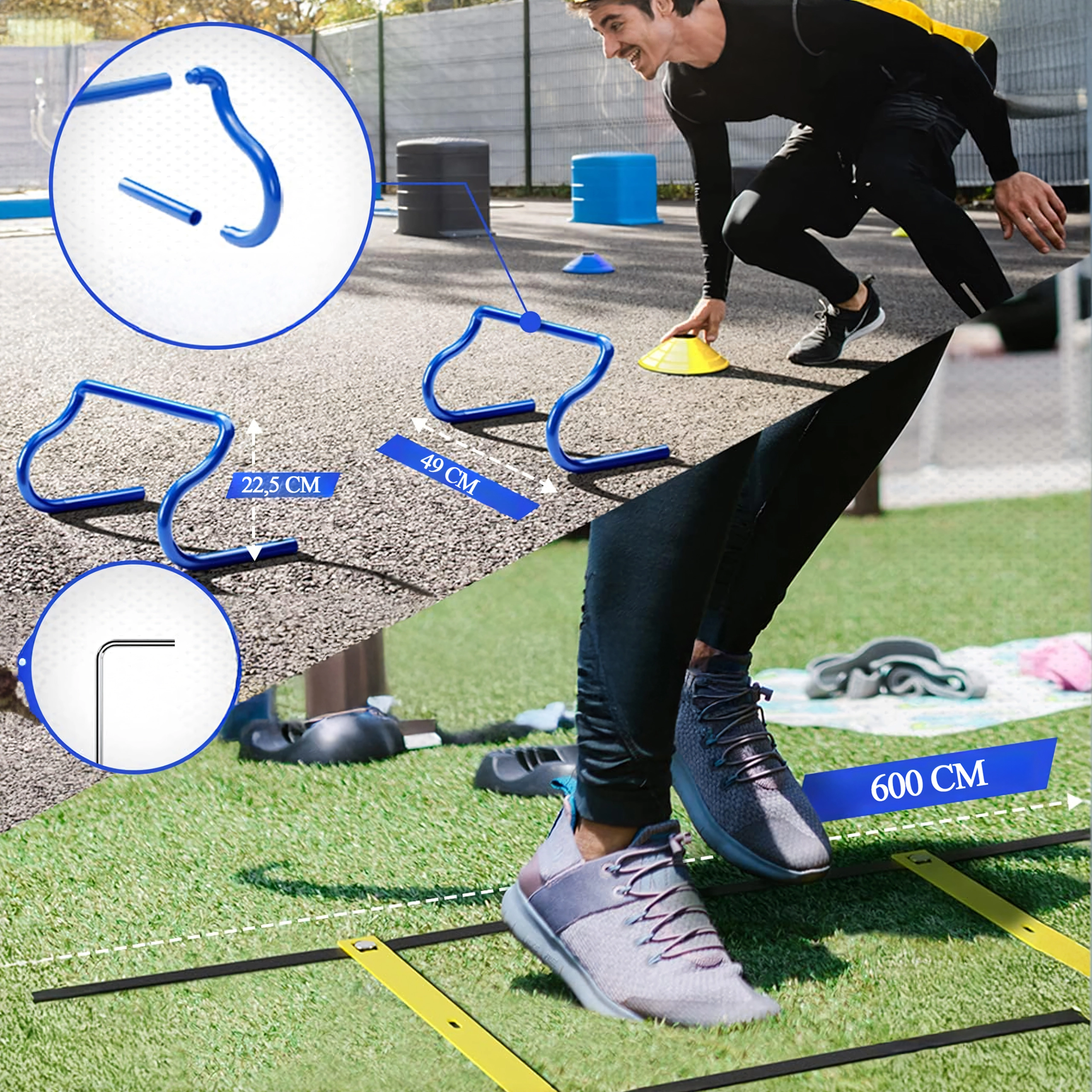 Ta univerzalni trening komplet XXL je zasnovan za športnike vseh ravni. Učinkovito pomaga razvijati hitrost nog, pospešek, spremembe smeri in koordinacijsko natančnost. Vsi elementi so lahki, vzdržljivi in hitro pripravljeni za uporabo tako na igrišču kot v telovadnici.