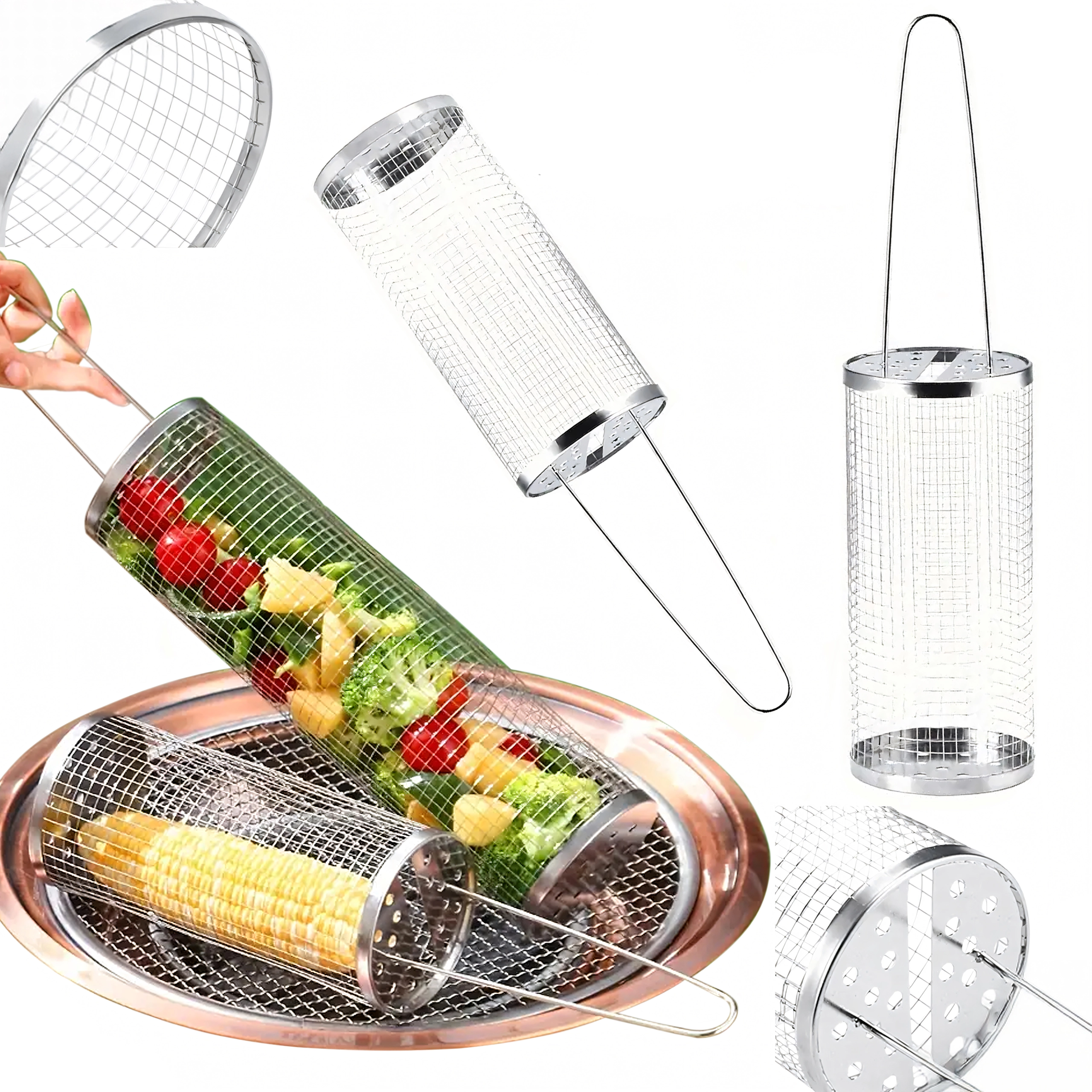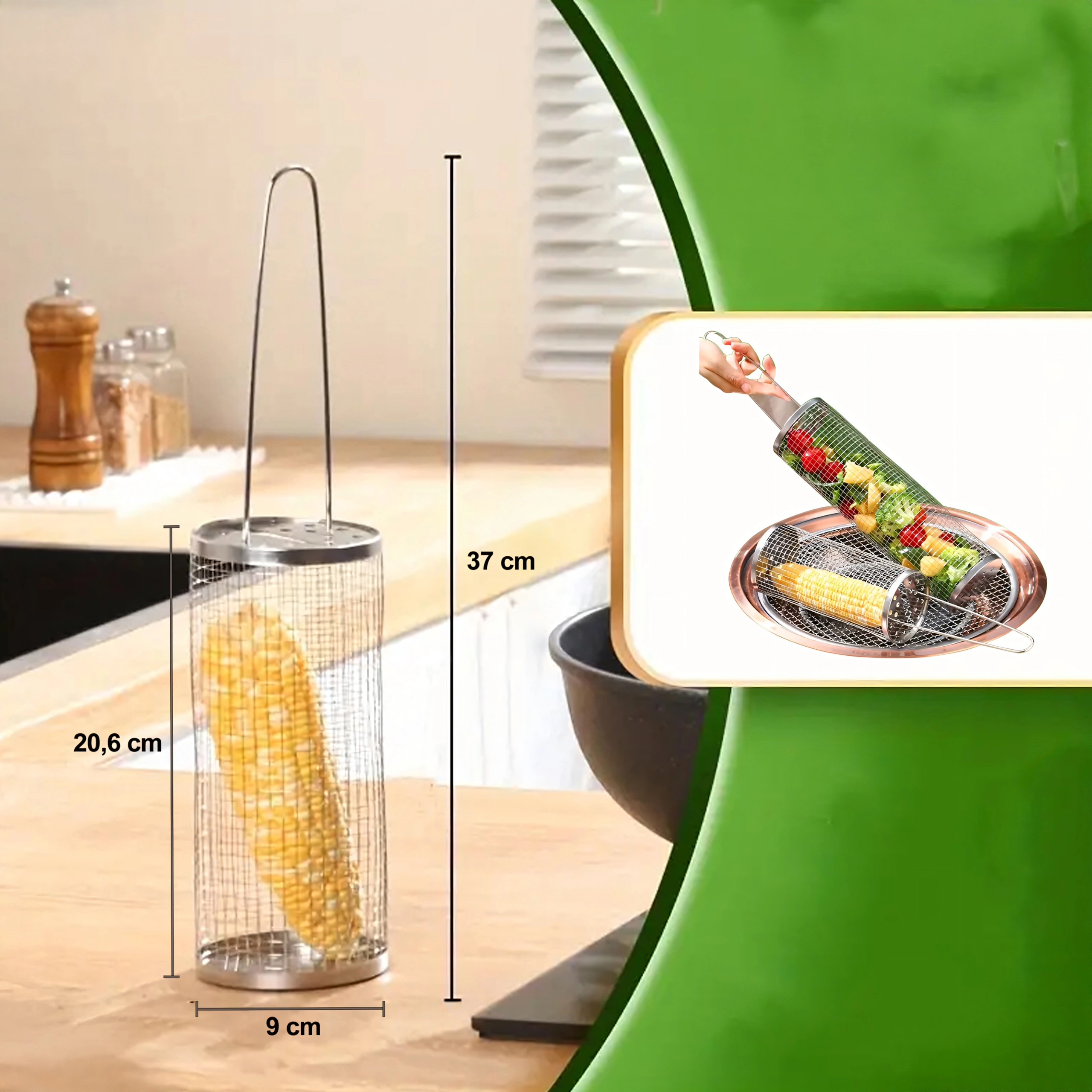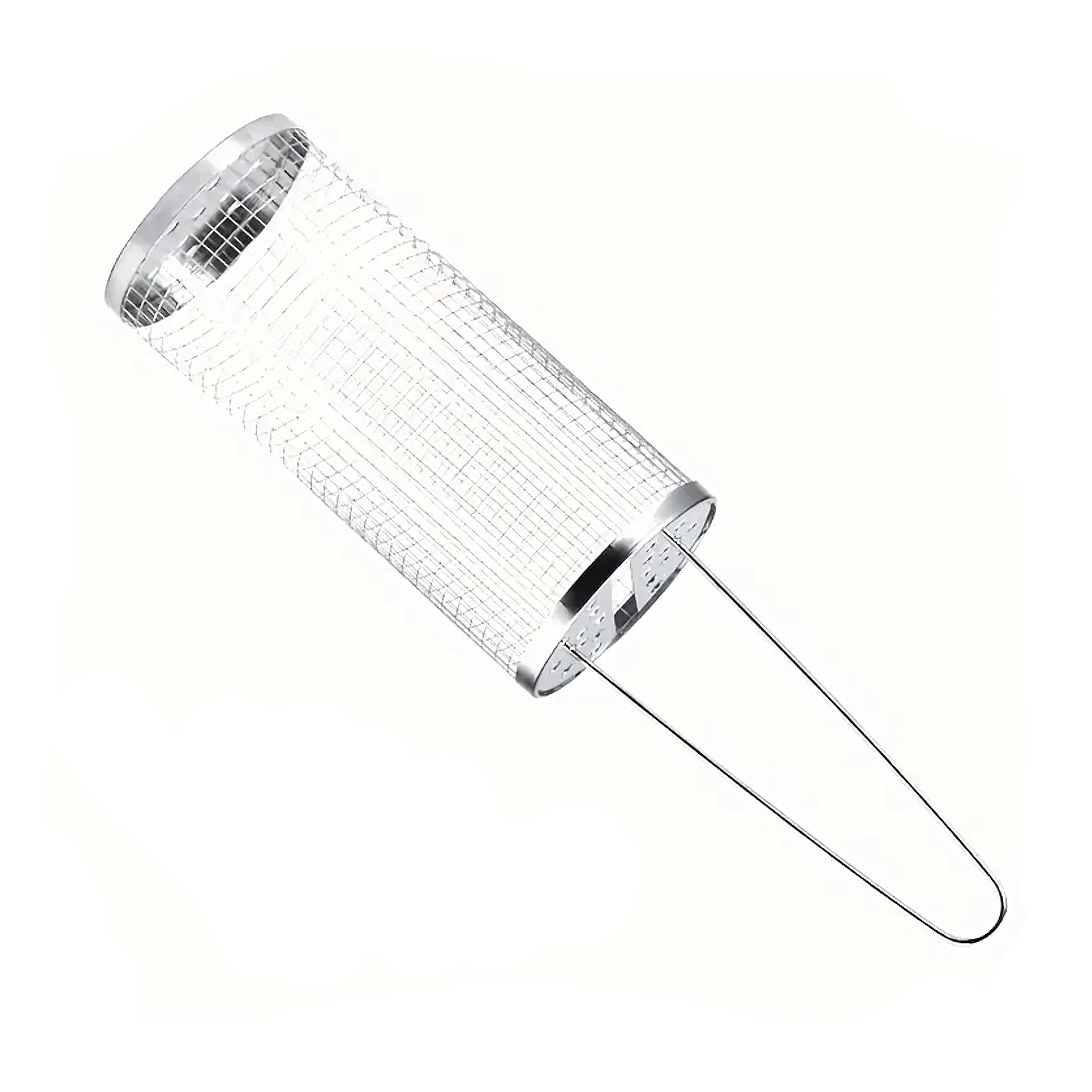 Valjasti koš iz nerjavne mrežice je idealen za peko drobnih sestavin, ki bi sicer padle skozi rešetko. Fine perforacije prepuščajo toploto in dim, zato dosežete hrustljavo skorjico in sočno sredico brez nereda na žaru. Vrtljiva zasnova olajša enakomerno zapečenost brez potrebe po obračanju posameznih kosov.