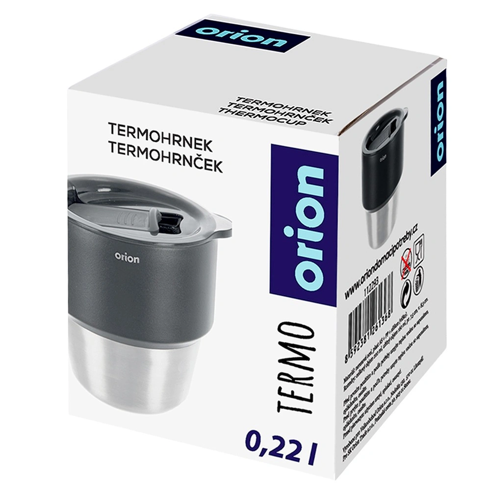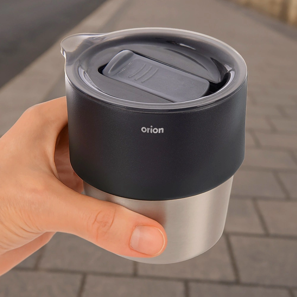 Kompakten termo lonček 220 ml za kavo in čaj na poti ohranja pijačo dlje toplo ali hladno zahvaljujoč dvojni steni z vakuumsko izolacijo. Notranjost iz nerjavnega jekla, praktičen drsni pokrov in oblika, ki se prilega držalom v avtomobilu. Originalen izdelek znamke ORION za vsakodnevno uporabo.