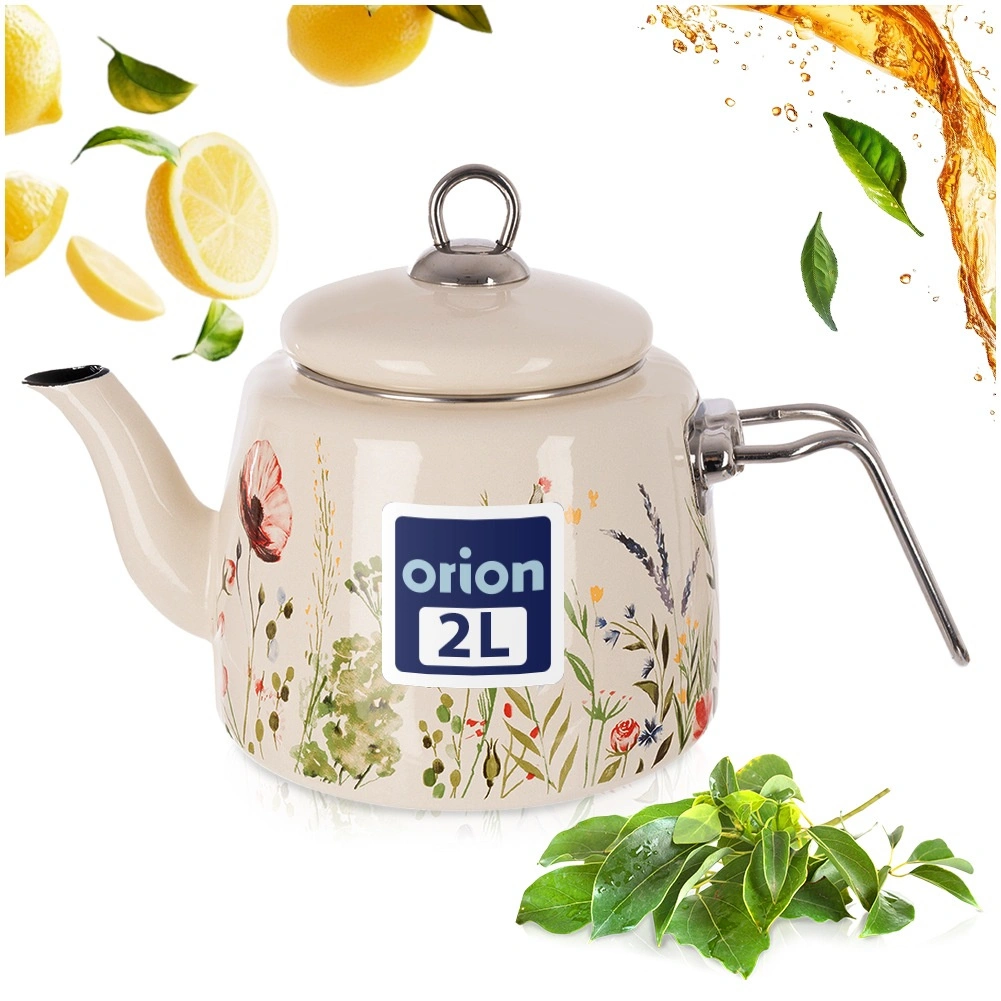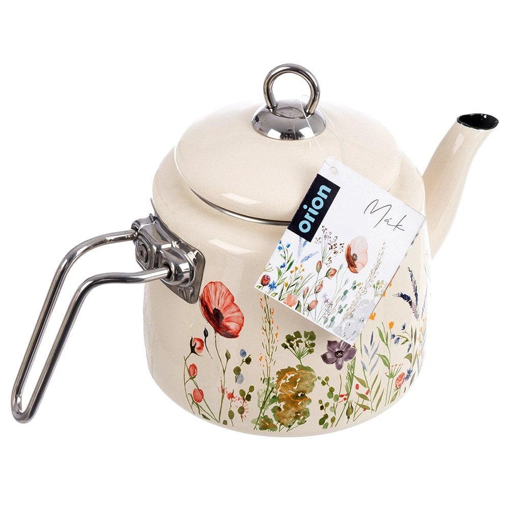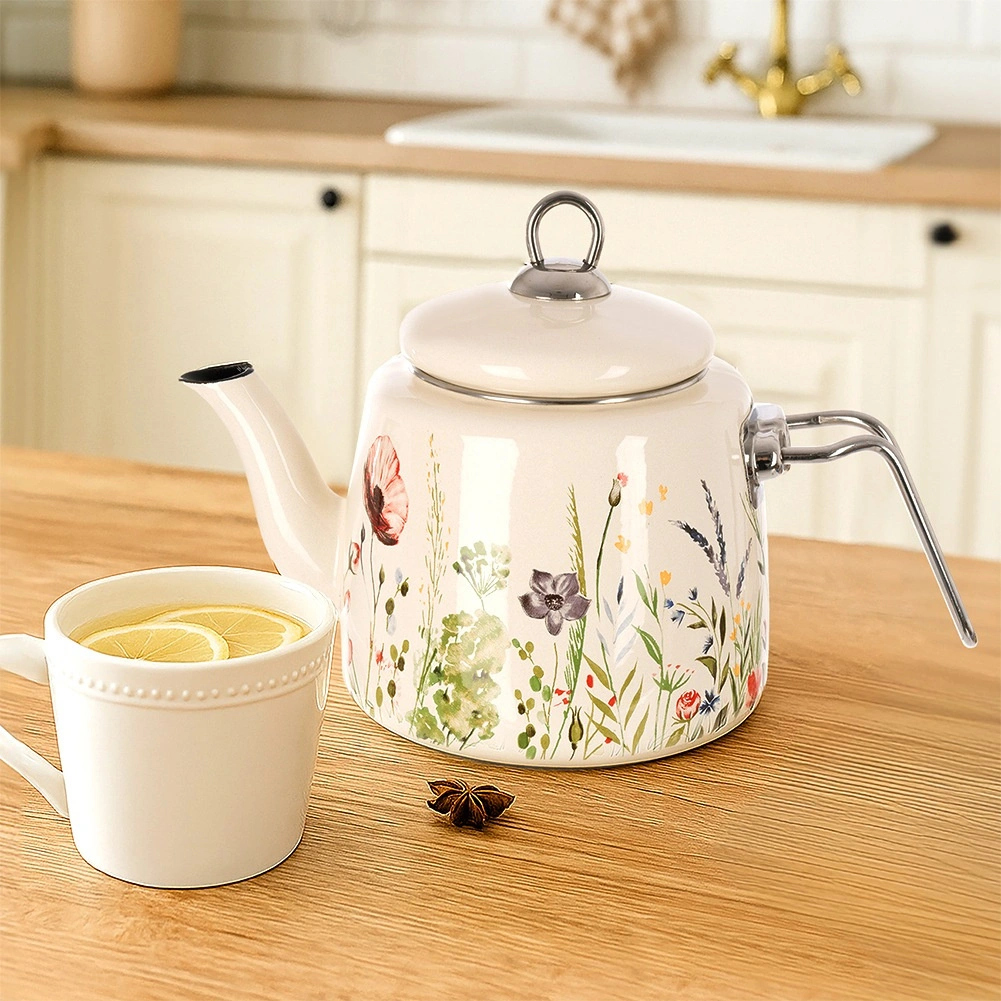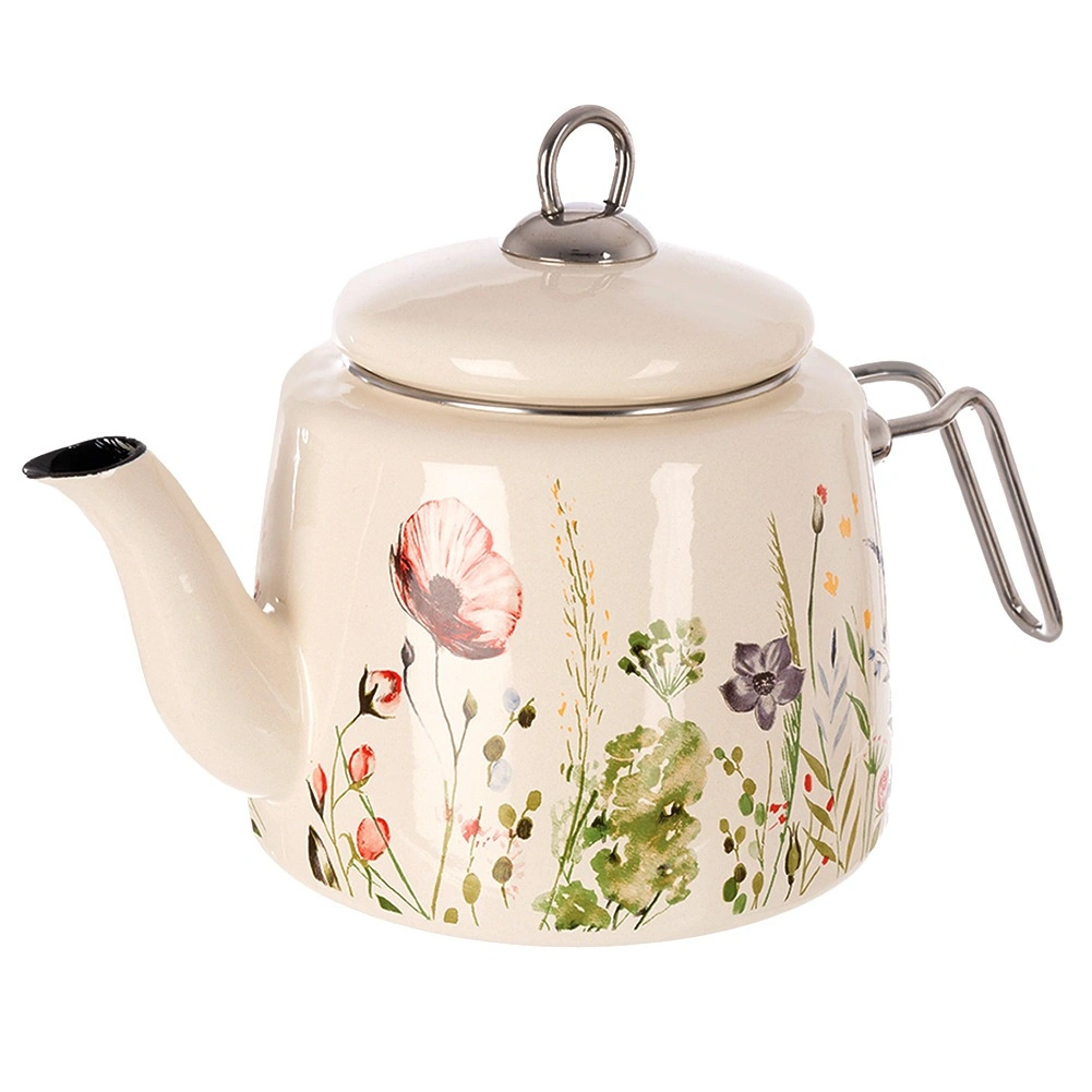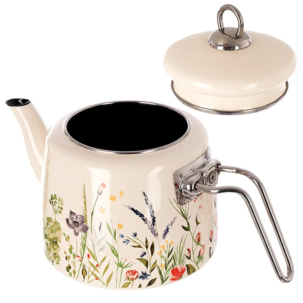 Eleganten emajliran čajnik s prostornino 1,6 l v kremni barvi z motivom travniških cvetov. Izdelan iz kakovostnega emajliranega jekla z nerjavnimi ročaji, primeren za vse vrste štedilnikov, vključno z indukcijo, in primeren za pomivalni stroj. Praktičen dobro prilegajoč se pokrov pomaga ohranjati toploto in omogoča udobno nalivanje.