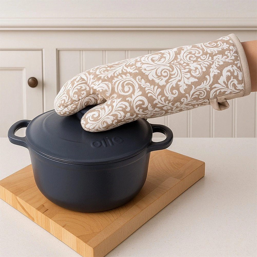 Prešita polnila in oblikovanje s palcem zagotavljajo zanesljiv oprijem vročih posod ter zaščito roke in zapestja.