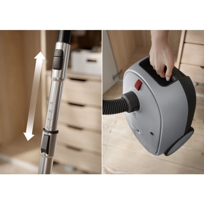 Praktično upravljanje z nogo omogoča brezkontaktno navijanje kabla, vklop/izklop in spreminjanje moči. Vrtljiva in zelo okretna kolesa zagotavljajo gladko premikanje po različnih vrstah tal. Dolg 12 m doseg zmanjšuje potrebo po preklapljanju med vtičnicami. Model je zasnovan z mislijo na trajnost – do 50 % uporabljenih plastik je recikliranih, dokumentacija pa je natisnjena na recikliranem papirju.