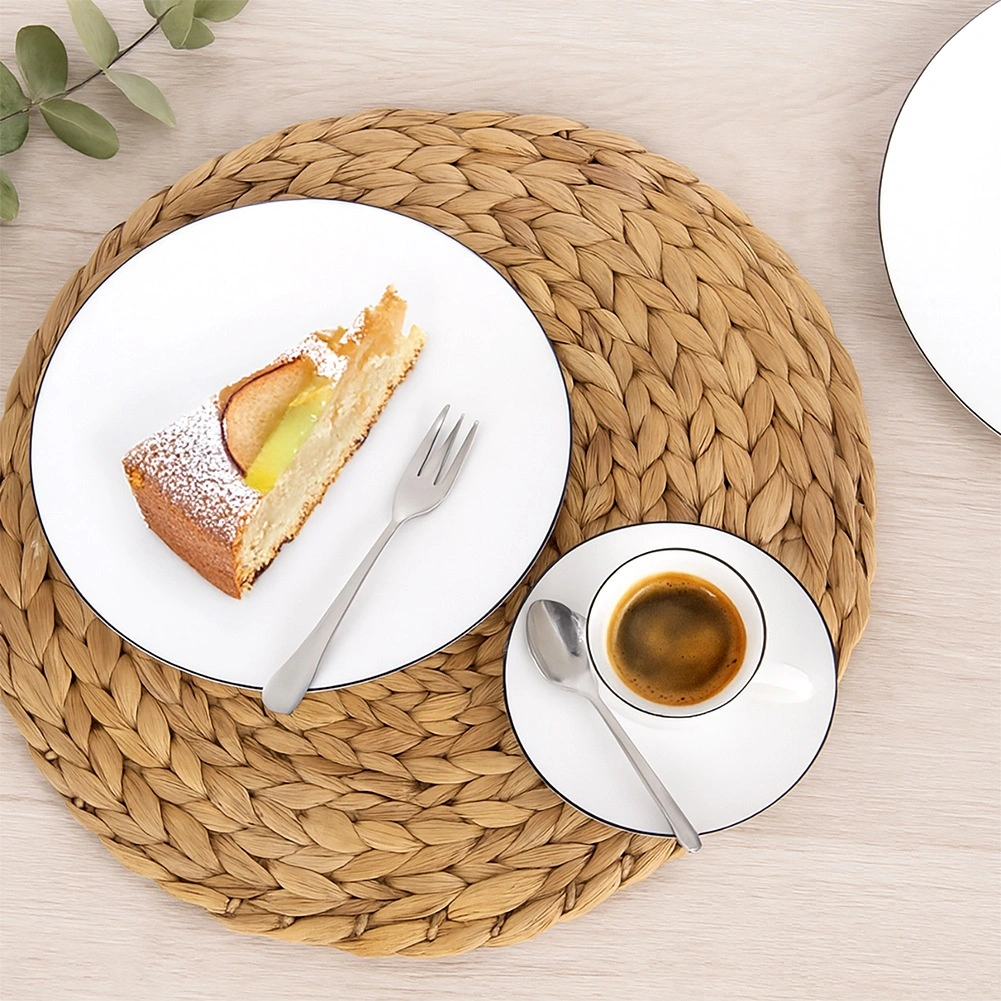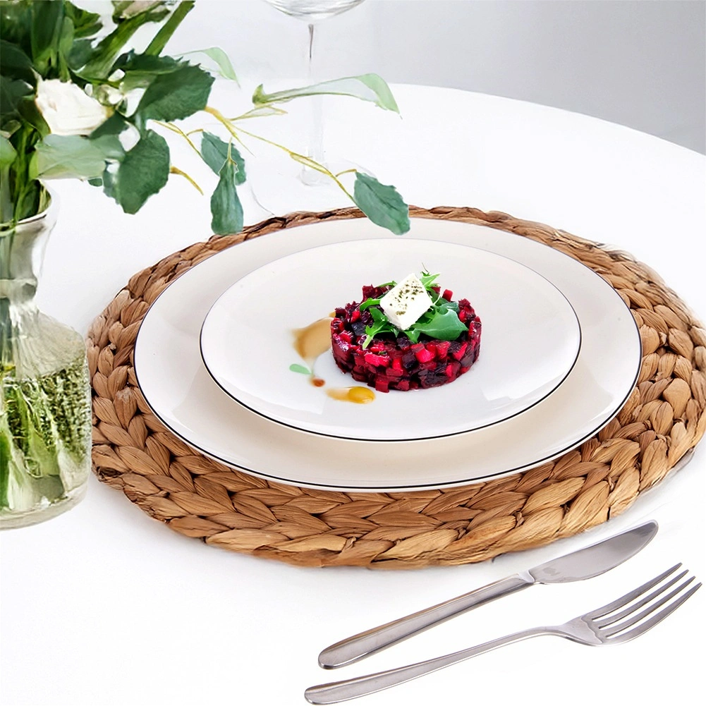 Beli porcelan s tankim črnim robom doda pogrinjku eleganten in sodoben videz, ki ga zlahka uskladite z ostalimi kosi posode.