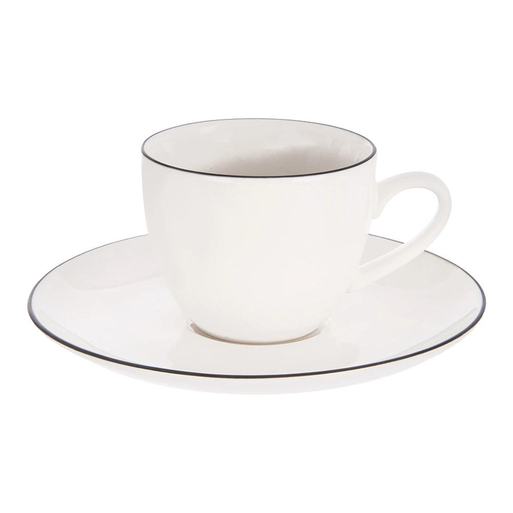 Eleganten porcelanasti krožniček s premerom 13 cm za espresso. Minimalistična zasnova s tankim temnim robom, brezčasen videz, primeren za pomivalni stroj in mikrovalovko, stabilna opora za skodelico ter univerzalna uporaba za serviranje drobnih sladic.