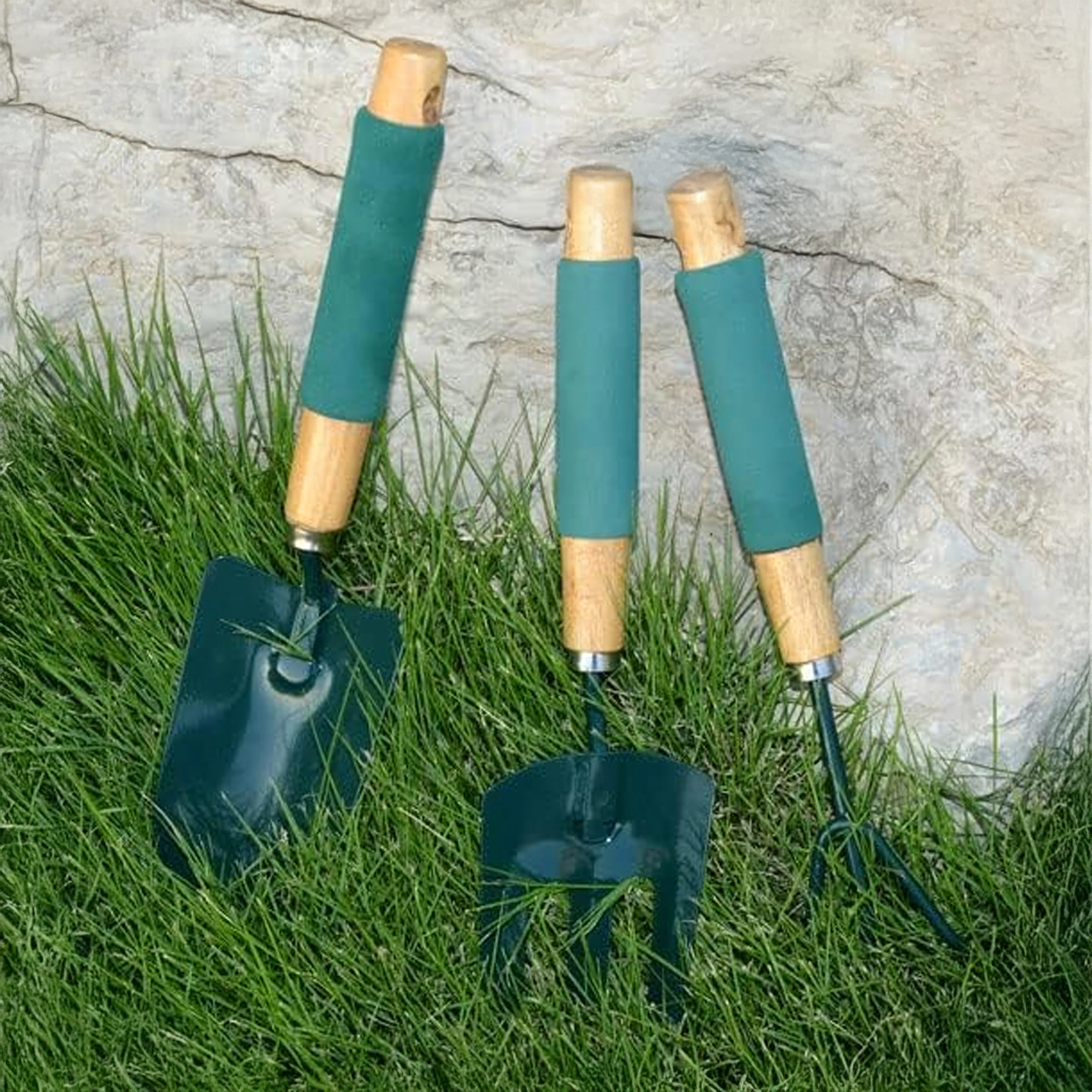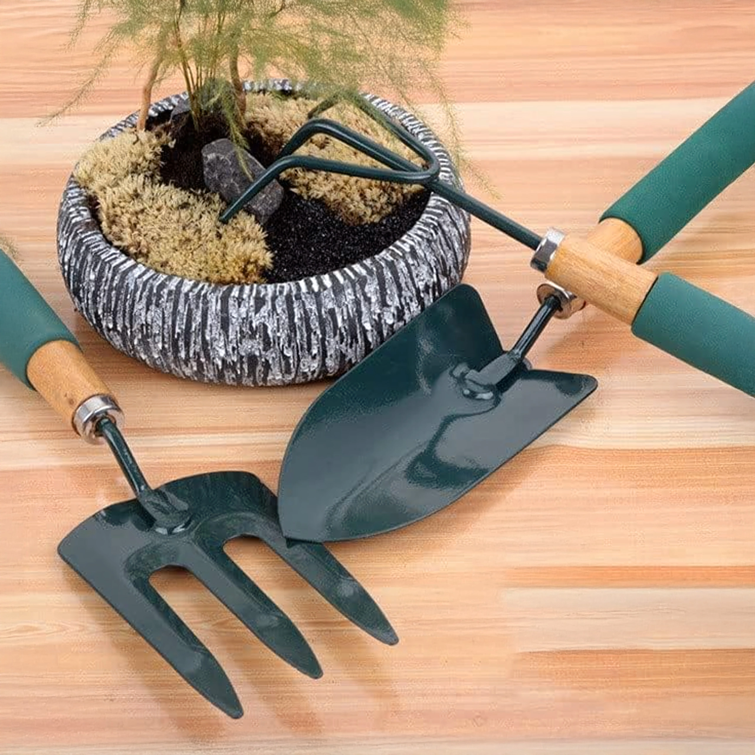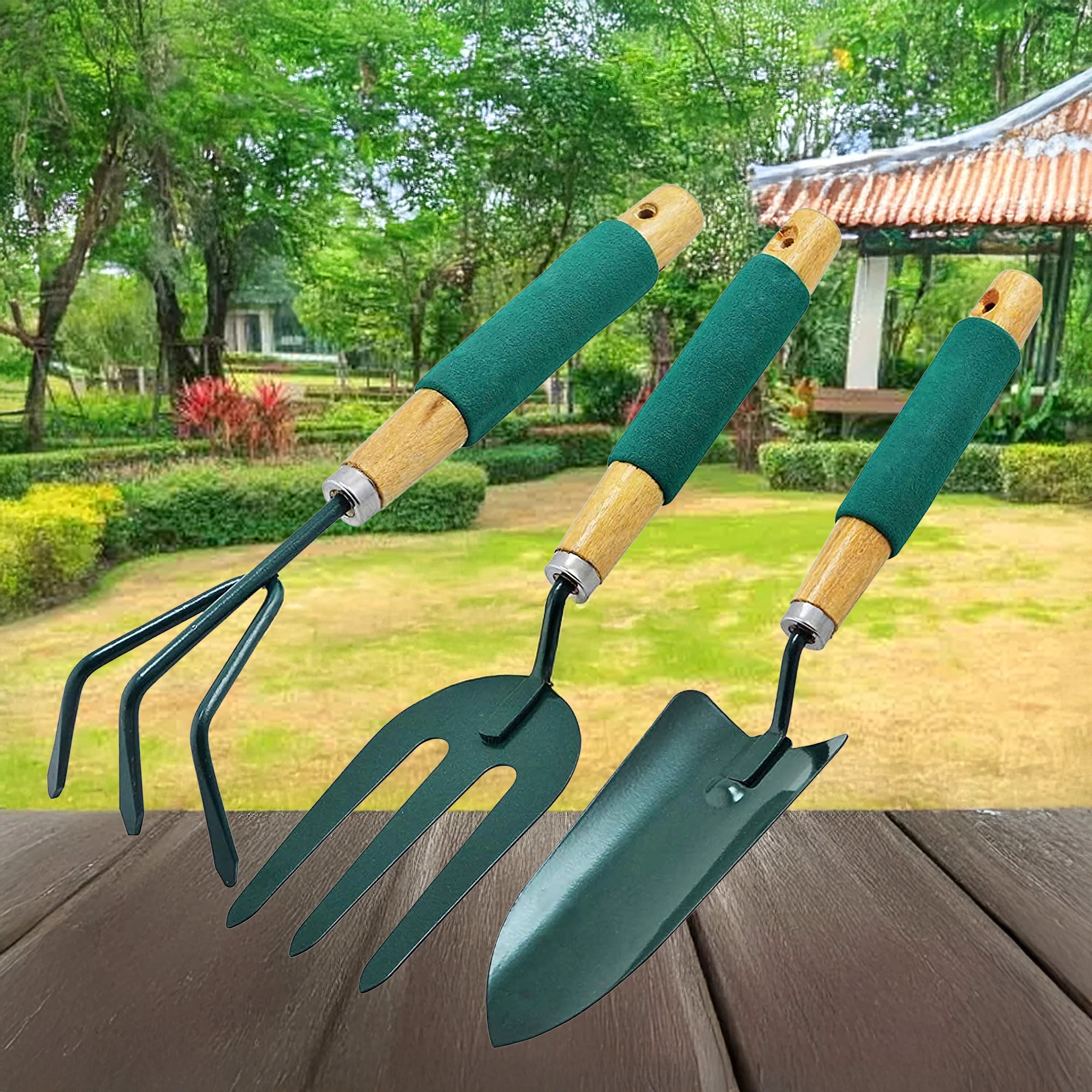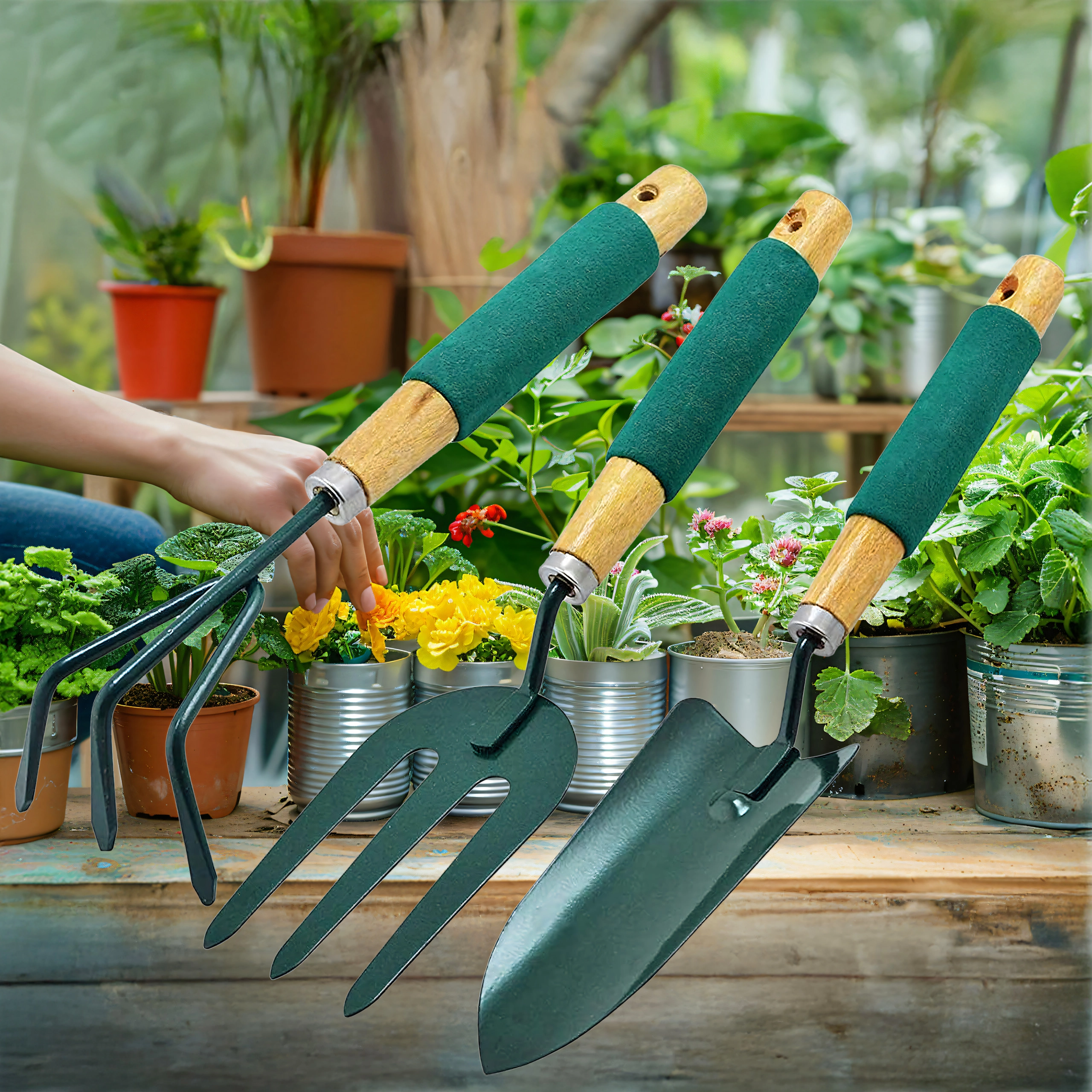 Praktičen komplet treh ročnih orodij za nego gredic in lončnic – lopatka, kultivator/mini grabljice in vrtnarske vilice. Vzdržni kovinski delovni deli ter ergonomski, nedrseči ročaji zagotavljajo udobno delo pri kopanju, rahljanju tal in presajanju.