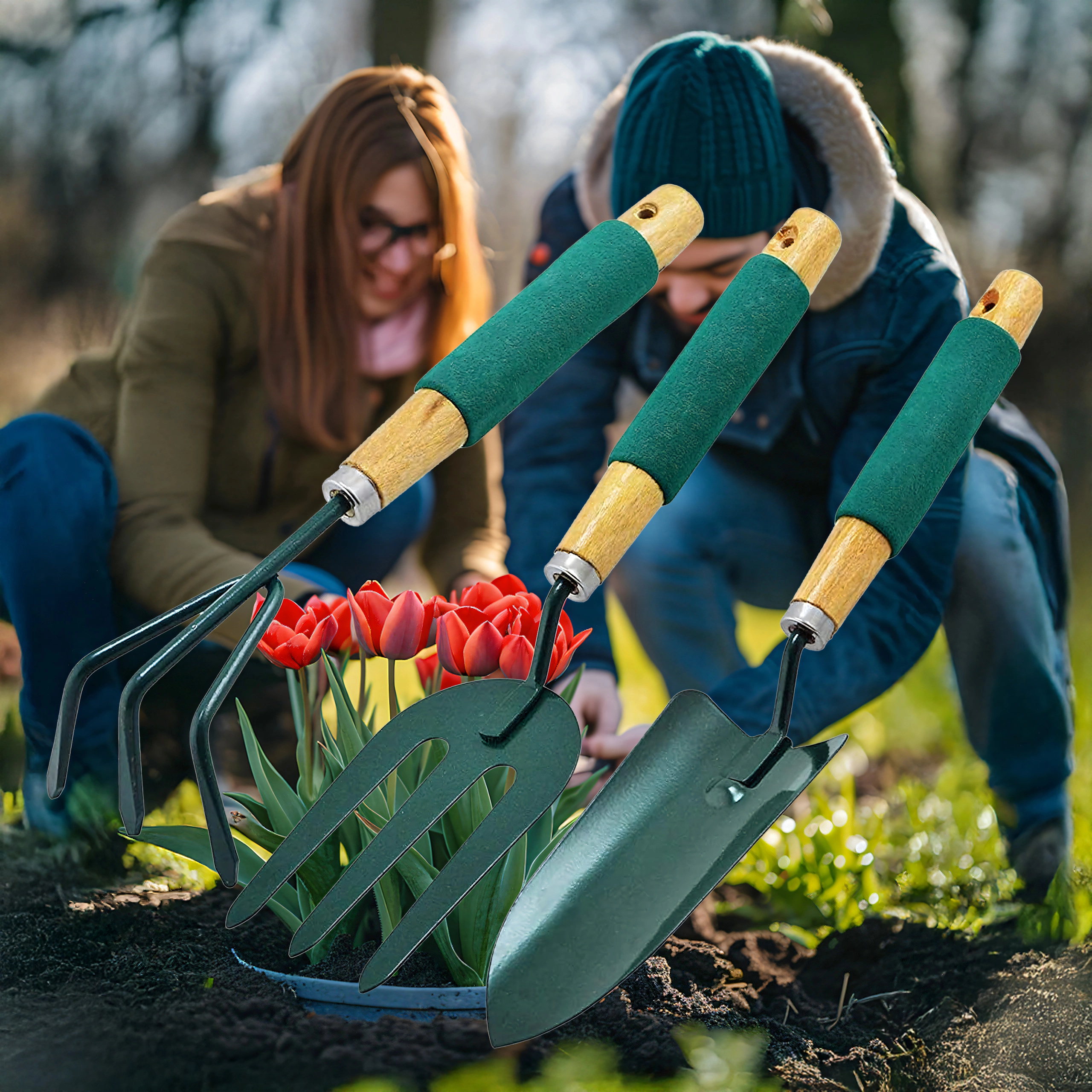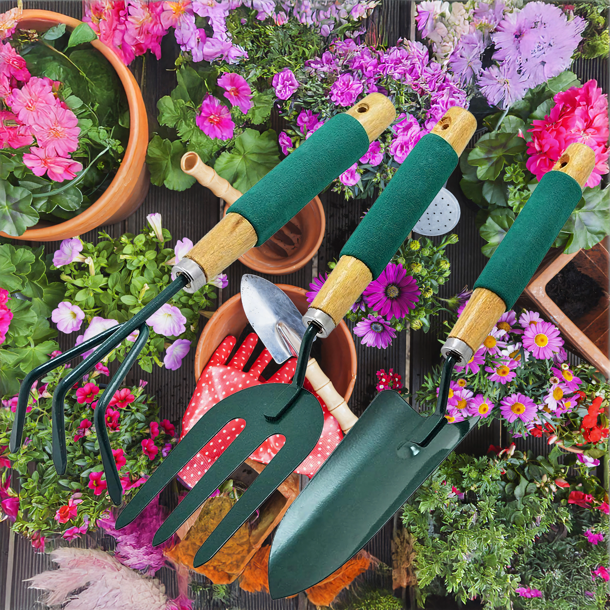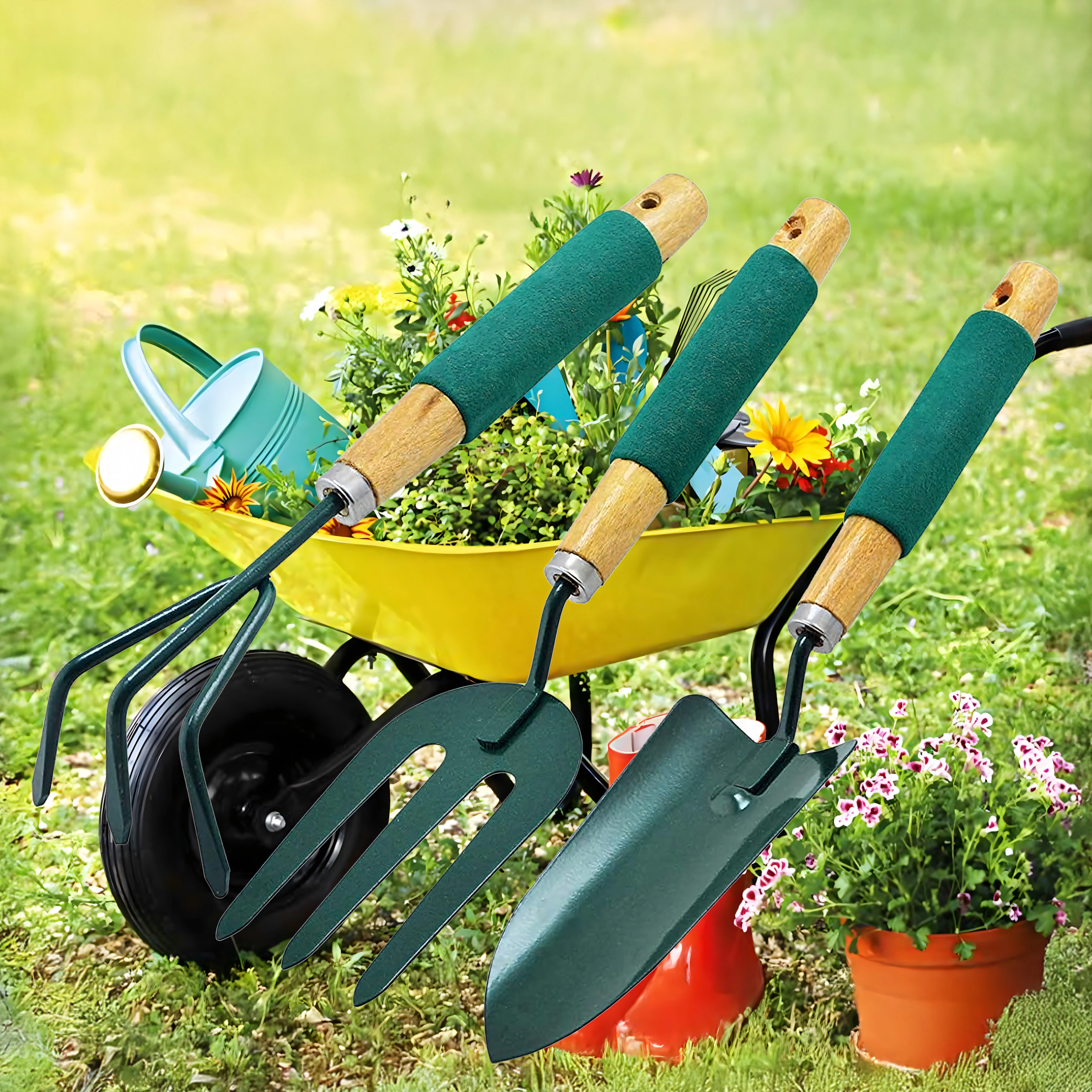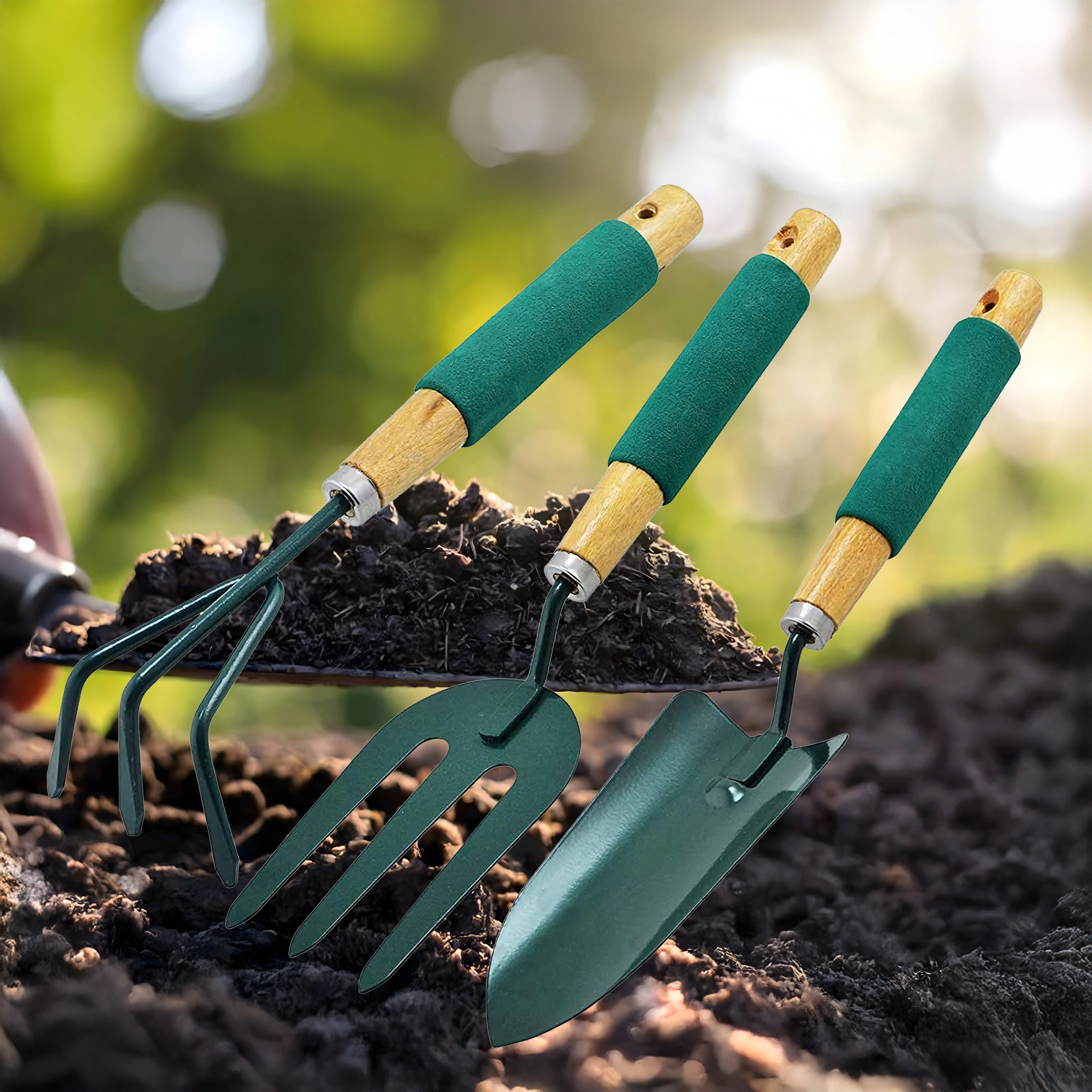 Praktičen komplet treh ročnih orodij za nego gredic in lončnic – lopatka, kultivator/mini grabljice in vrtnarske vilice. Vzdržni kovinski delovni deli ter ergonomski, nedrseči ročaji zagotavljajo udobno delo pri kopanju, rahljanju tal in presajanju.