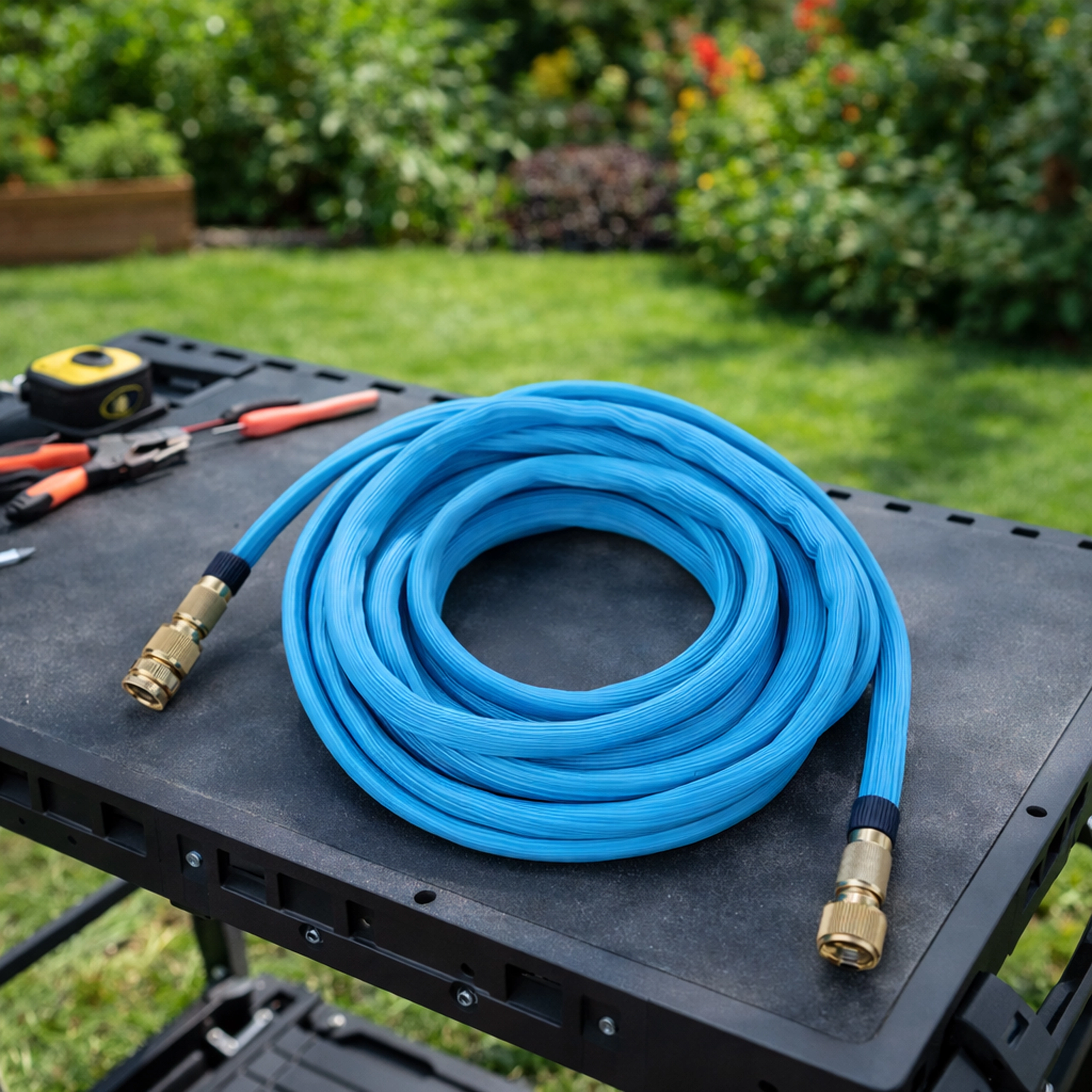 Ta raztegljiva cev združuje nizko težo in visoko trpežnost. Po napolnitvi se samodejno podaljša do 22,5 m, po izpustu pa se vrne na kompaktno dolžino, zato jo zlahka shranite na nosilec ali v škatlo. Medeninasti konektorji z rebrastim oprijemom zagotavljajo trden, tesen in proti koroziji odporen spoj.