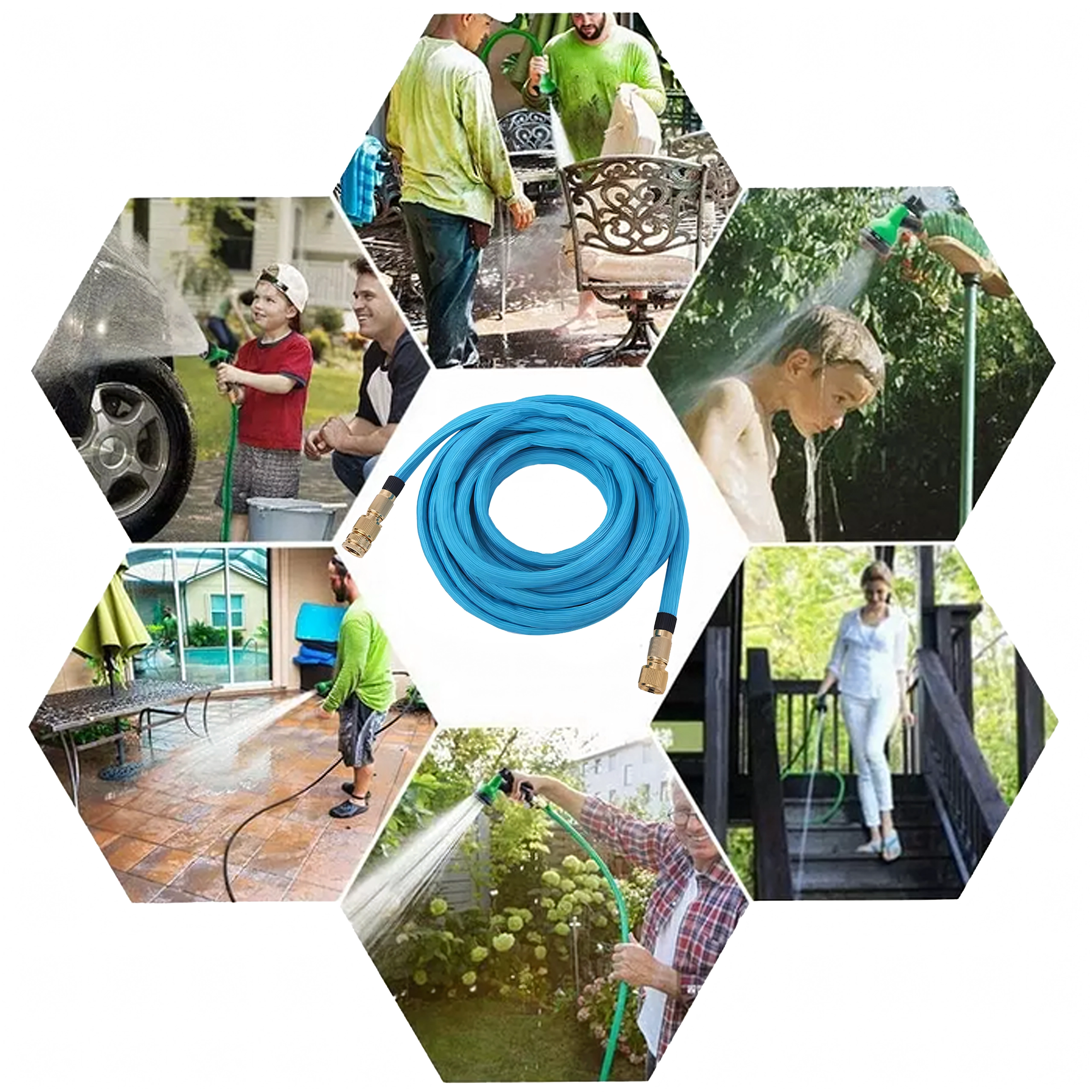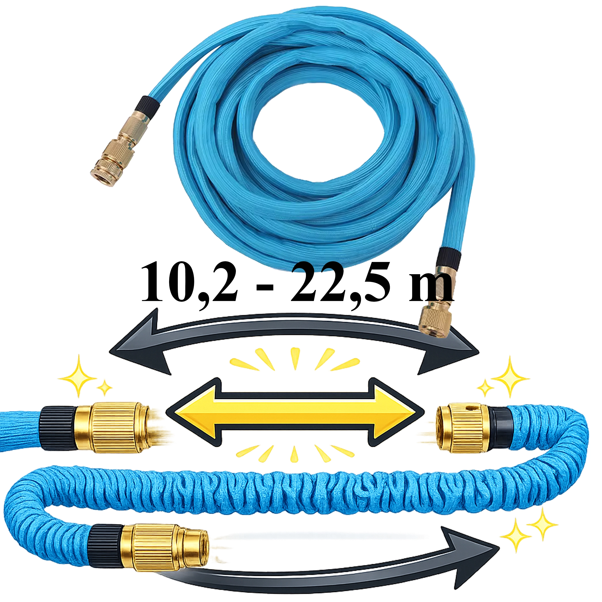 Lahka in trpežna raztegljiva vrtna cev, ki se pod pritiskom vode podaljša z 10 na do 22,5 m, je idealna za zalivanje, pranje avtomobila in čiščenje okoli hiše. Opremljena je z medeninastimi hitrimi spojkami 1/2 in 3/4 za univerzalno priključitev, z nepuščajočo zasnovo s tesnili O-obročki ter z fleksibilnim opletom za enostavno navijanje in shranjevanje.