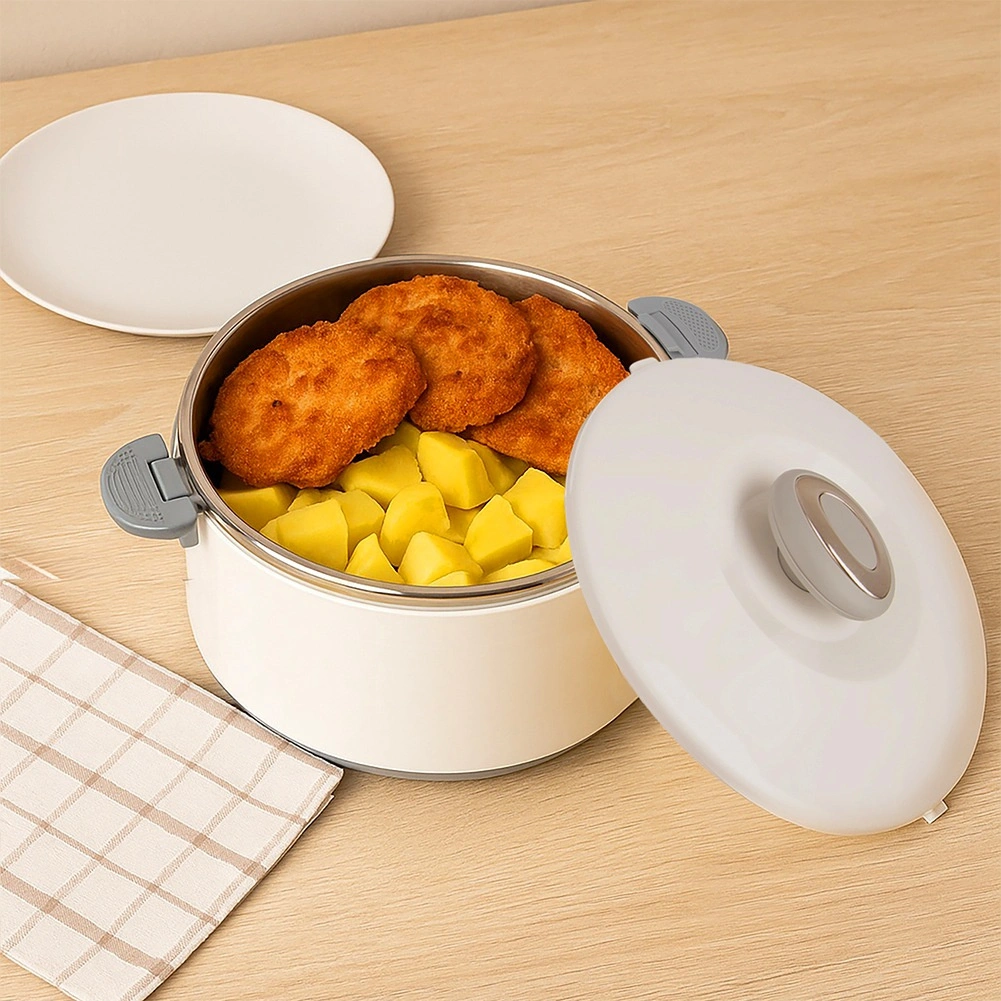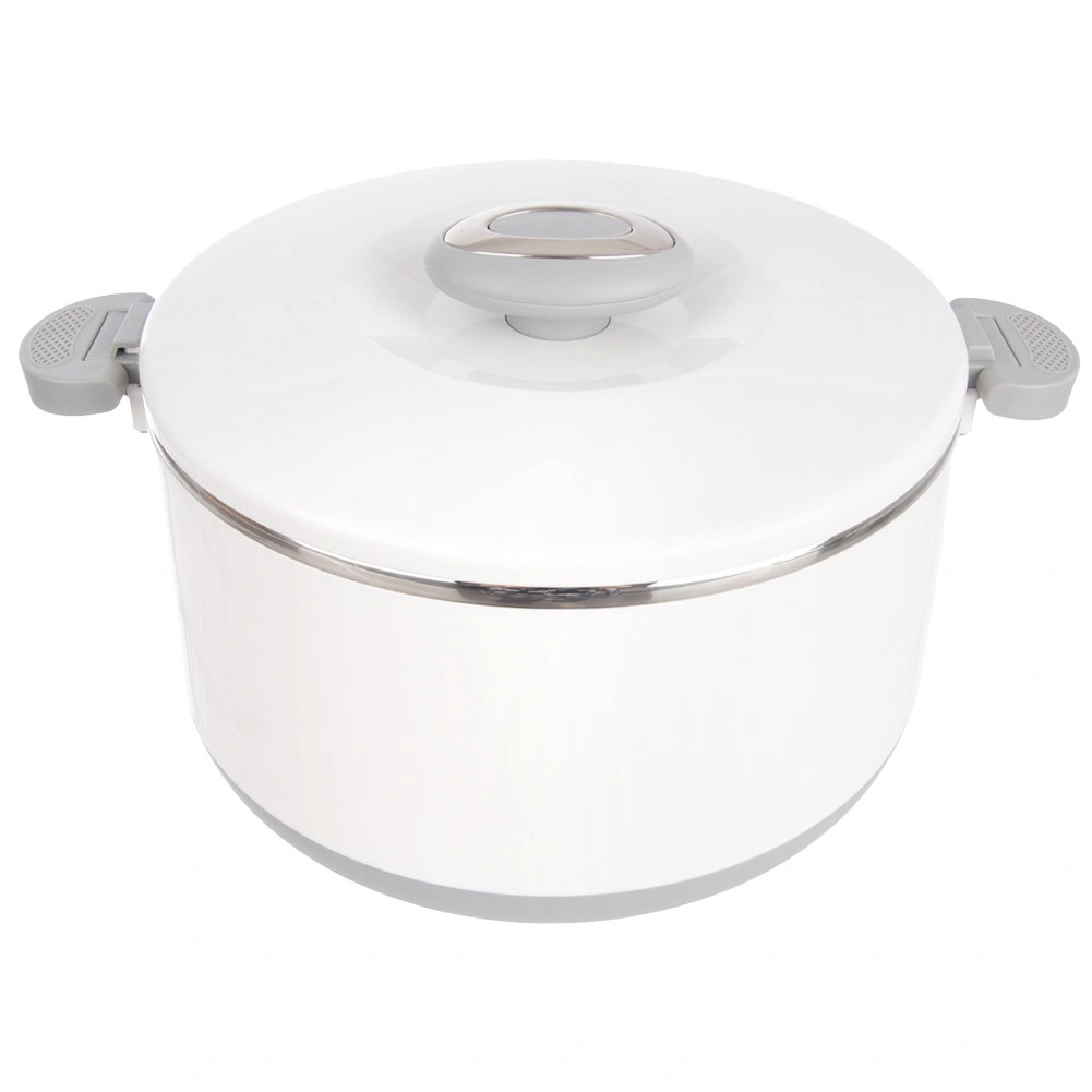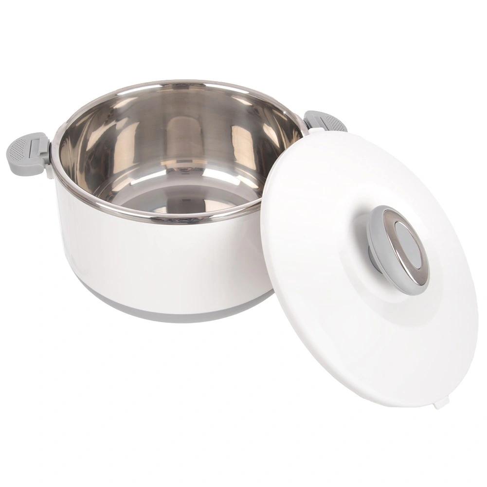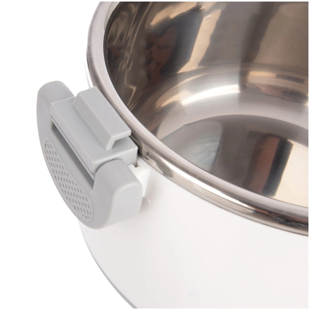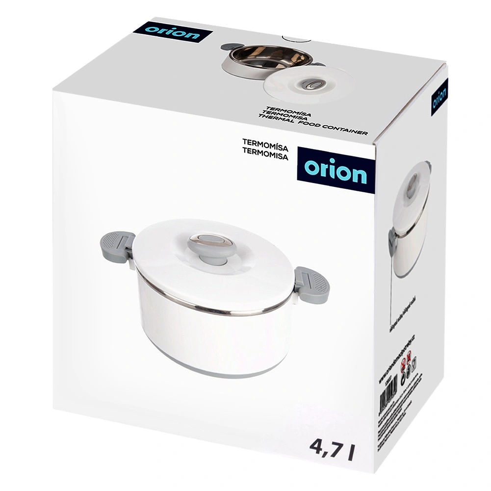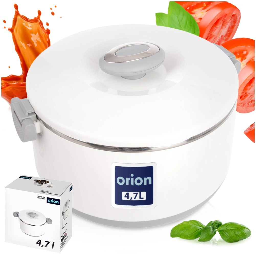 Velika prostornina 4,2 l zadošča za celotna kosila, priloge in sladice. Notranji del iz nerjavečega jekla dobro zadržuje temperaturo, medtem ko trpežen bel zunanji plašč iz plastike in sivi ročaji zagotavljajo udobno in varno rokovanje. Pokrov se zapira z zasukom, stranski klipi pa povečajo varnost pri prenašanju.