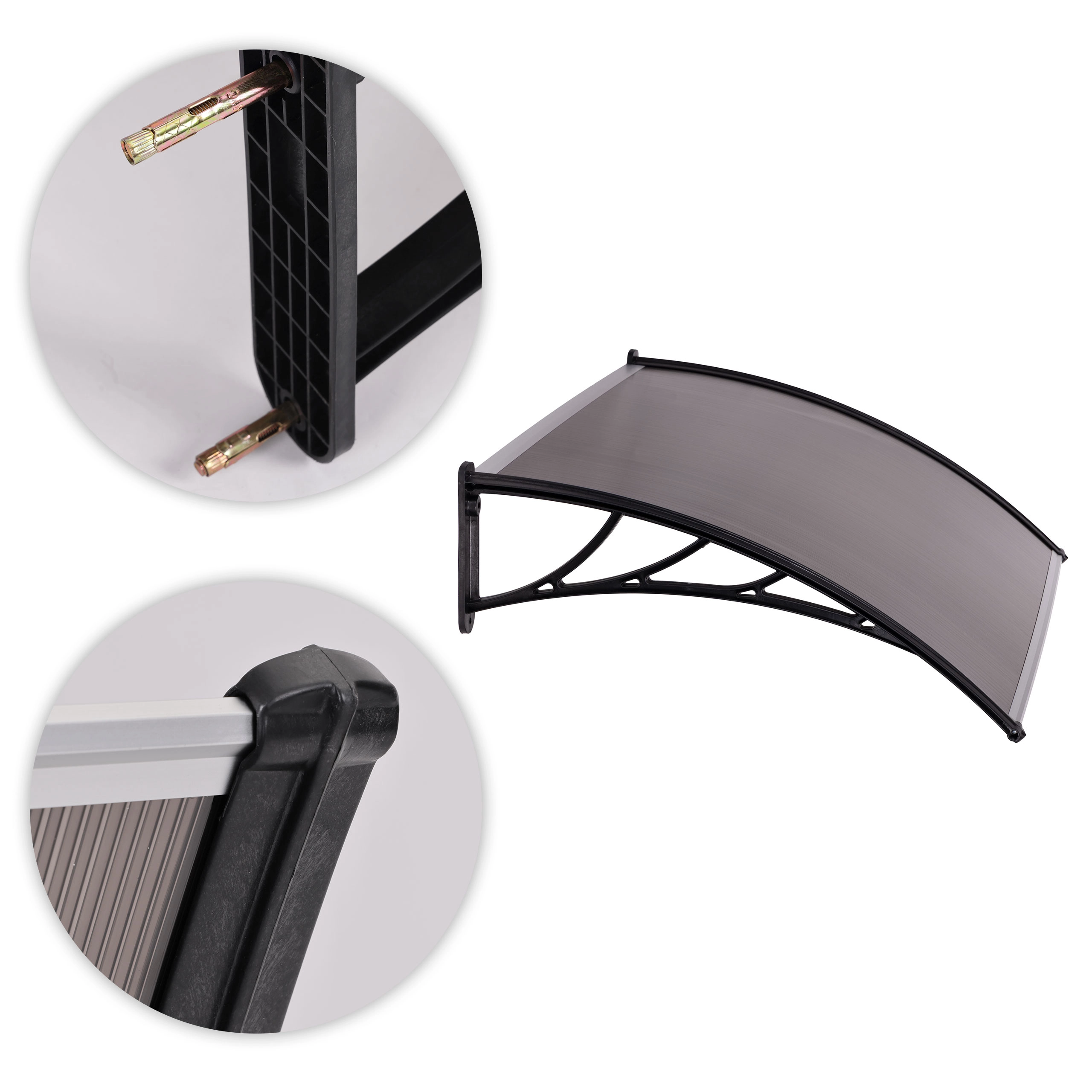 Eleganten nadstrešek za vhod iz polikarbonata nudi vašim vratom zanesljivo zaščito pred vremenskimi vplivi. Zahvaljujoč odporni plastični konstrukciji in prozornemu polikarbonatnemu panelu (5 mm) učinkovito ščiti pred dežjem, snegom in soncem. Modularna zasnova omogoča povezovanje več nadstreškov v daljše sklope. Priložen je kompleten montažni komplet s 3 tipi sider za različne podlage, zato je namestitev hitra in varna.