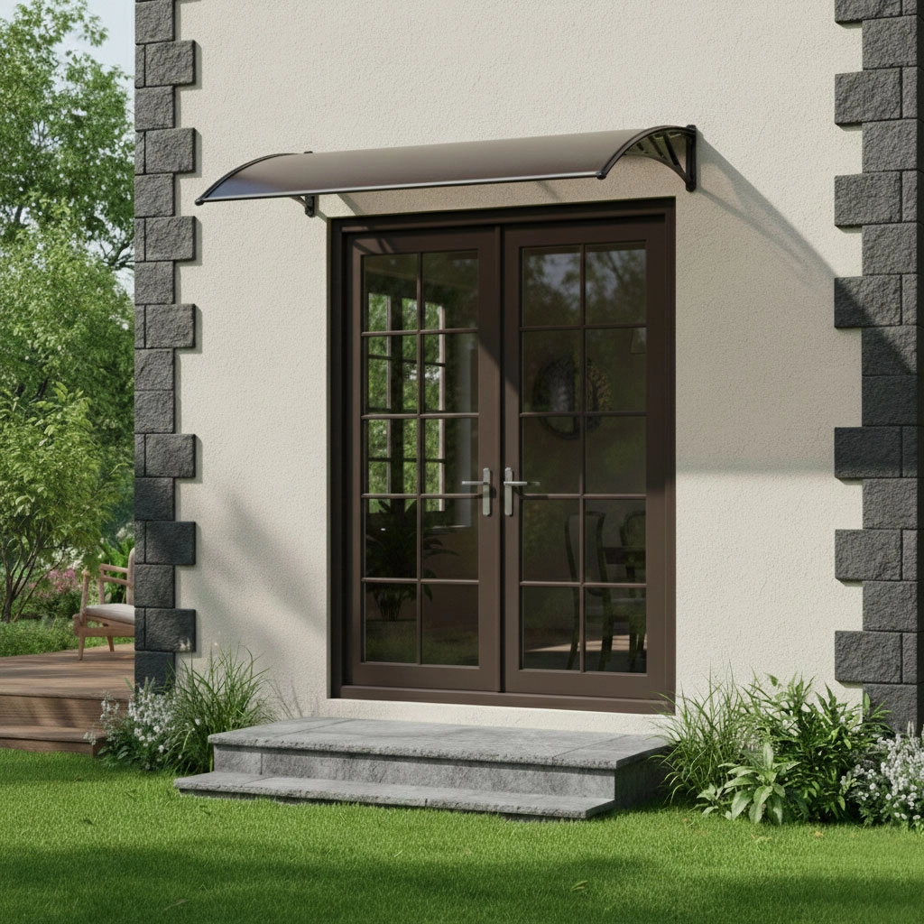 Ukrivljen, prozoren nadstrešek pokriva vrata in okolico, prepušča dnevno svetlobo ter hkrati ščiti pred padavinami in UV-sevanjem. Primeren za domove in poslovne prostore.