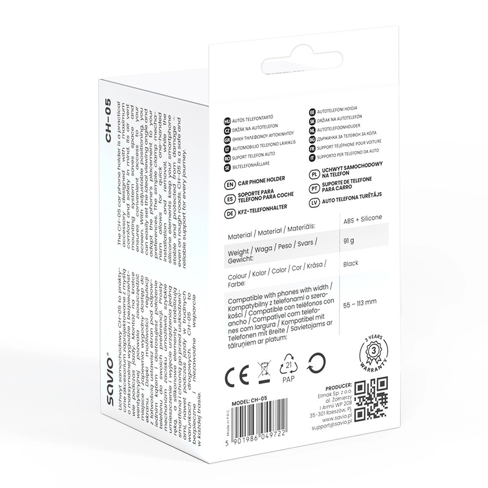 Praktični avtomobilski nosilec SAVIO CH-05 se pritrdi neposredno na rešetko prezračevanja, zato ne ovira pogleda in telefon vedno ohrani na dosegu. Ponuja hitro montažo brez priseskov in lepila, vrtljivo glavo za navpični in vodoravni položaj ter varno pritrjevanje z eno roko zahvaljujoč silikonskim vložkom. Združljiv z večino pametnih telefonov s širino 55–113 mm.