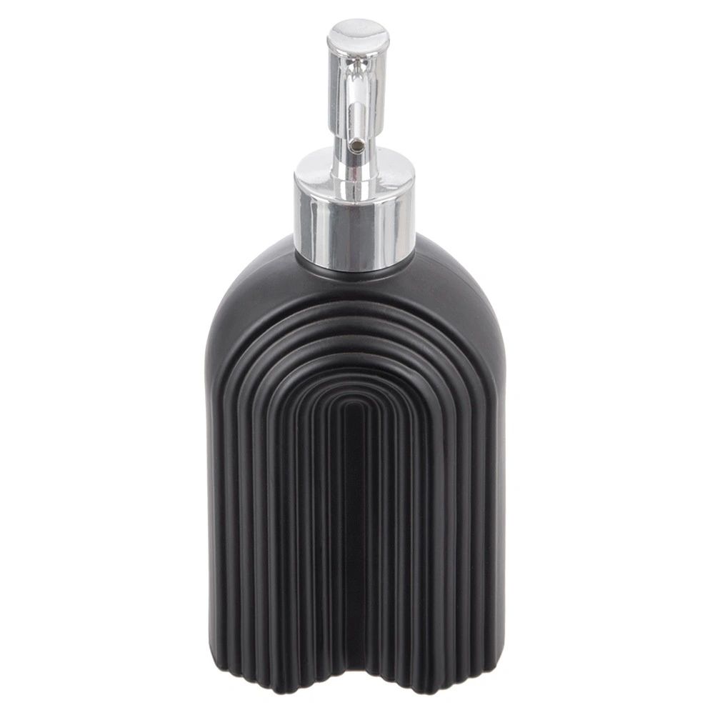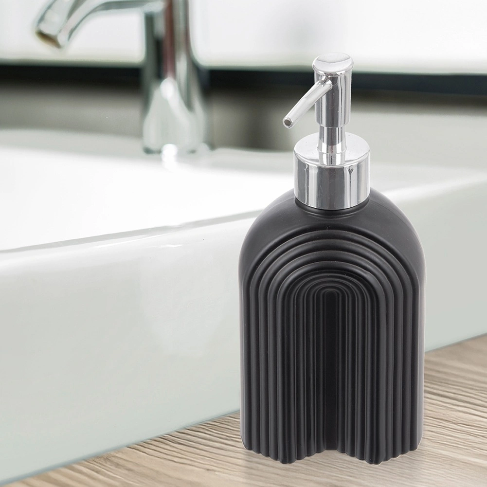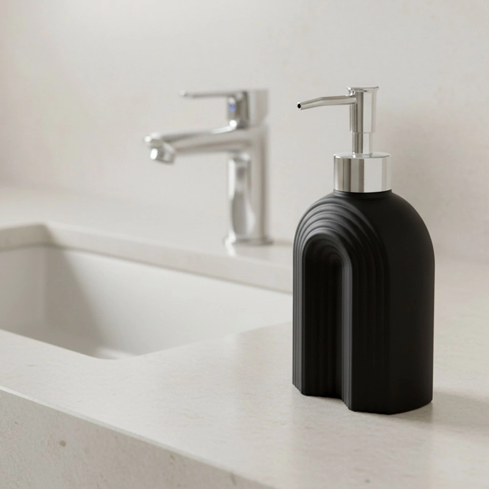 Stilski dozirnik iz kakovostnega stekla v mat črni barvi ponuja brezčasen videz in praktično uporabo pri vsakodnevni negi doma. Rebrasto, zaobljeno oblikovanje stekleničke zagotavlja zanesljiv oprijem in deluje kot dekorativni element, medtem ko kovinsko sijoča pumpica natančno dozira milo ali kremo brez zapravljanja.