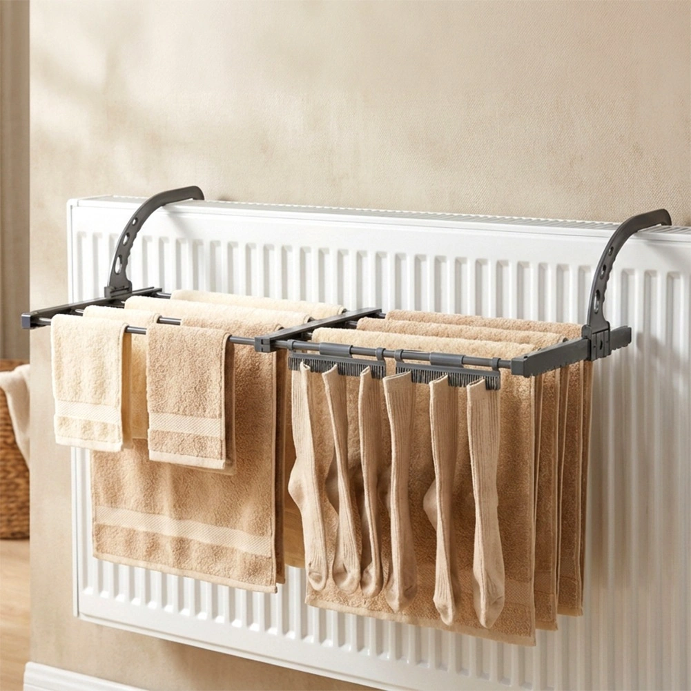 Praktičen raztegljiv sušilnik za radiator prihrani prostor in pospeši sušenje z izkoriščanjem toplote ogrevanja. Ponuja nastavljivo širino 45–83 cm, čvrsto kovinsko konstrukcijo in zložljive kavlje za enostavno namestitev na različne tipe radiatorjev ali ograj. Idealen za majhna stanovanja, kopalnice in balkone.