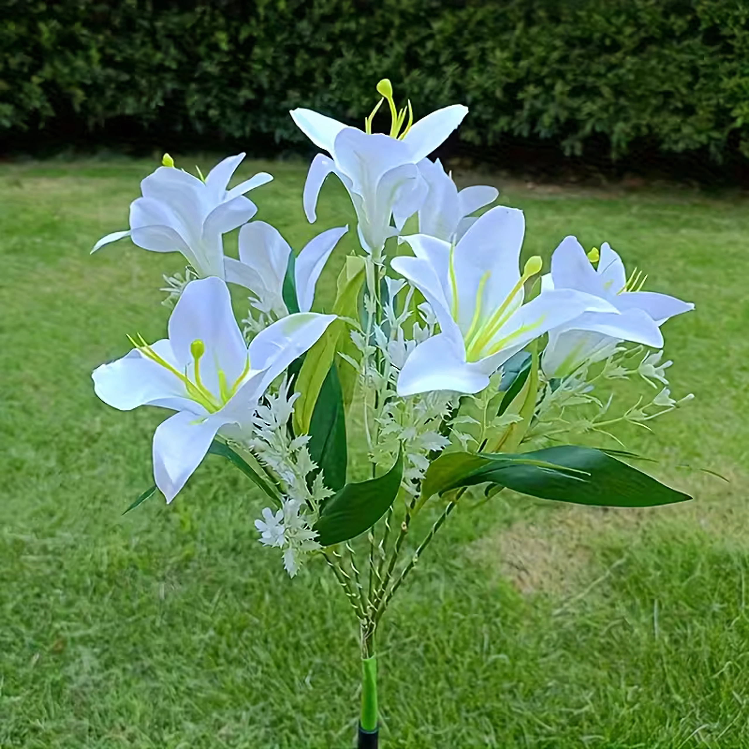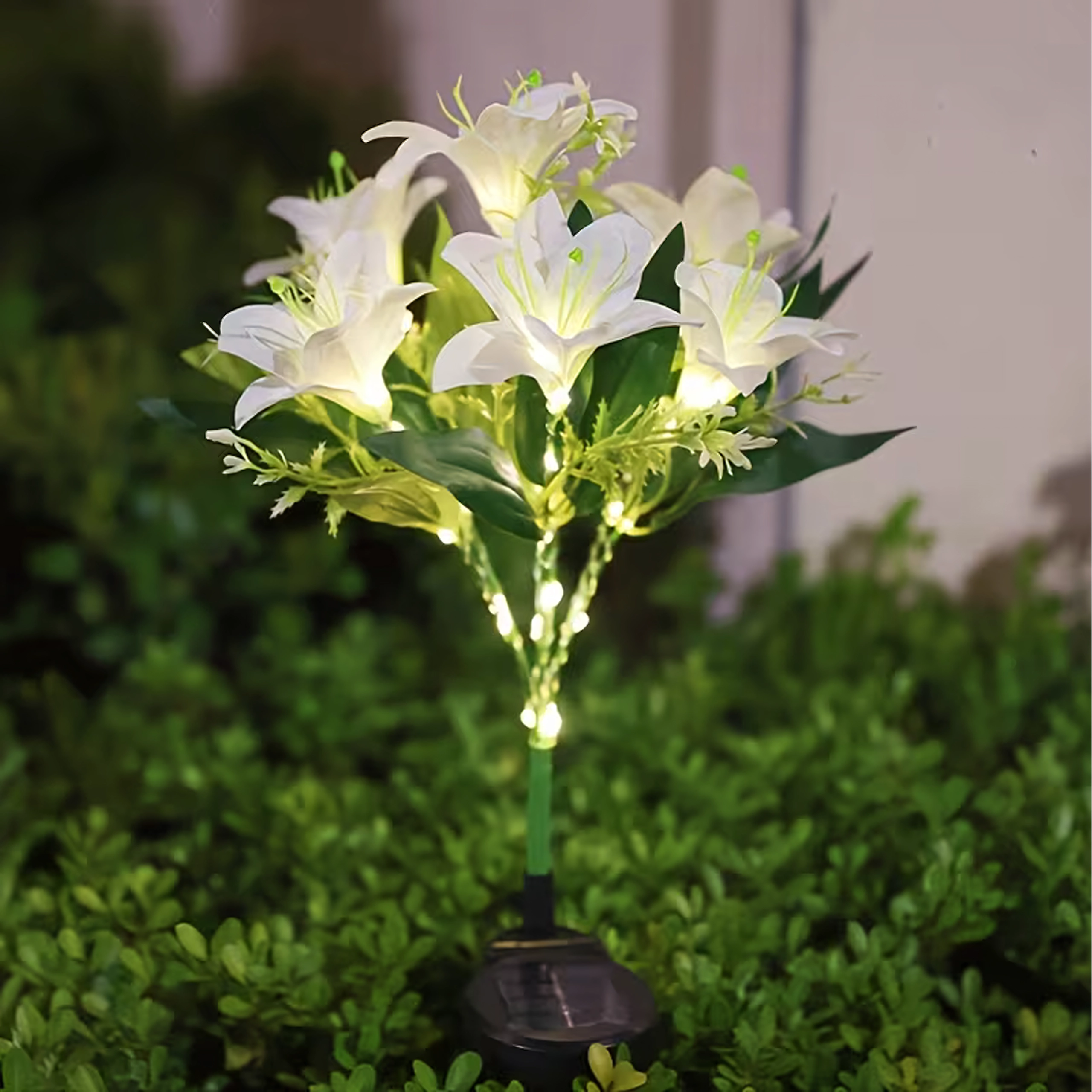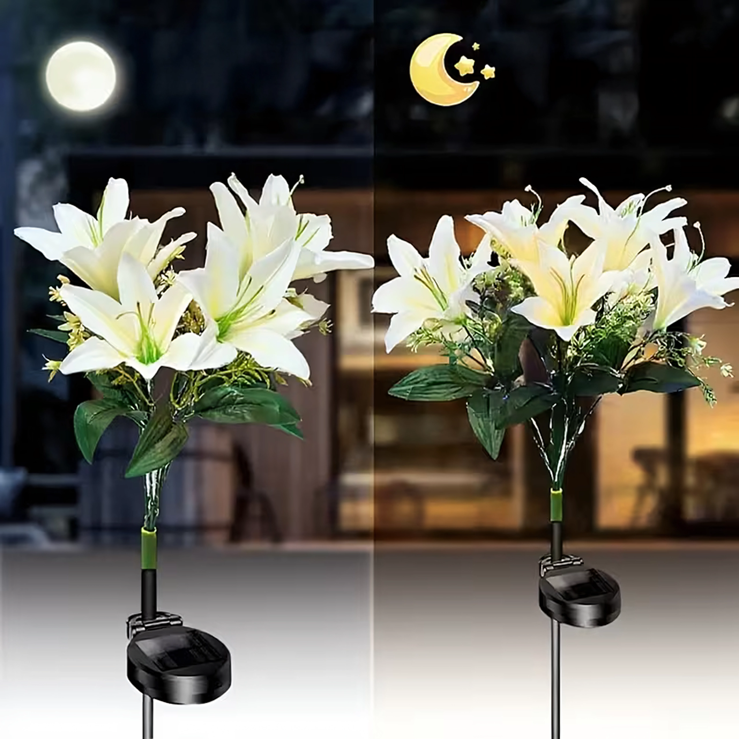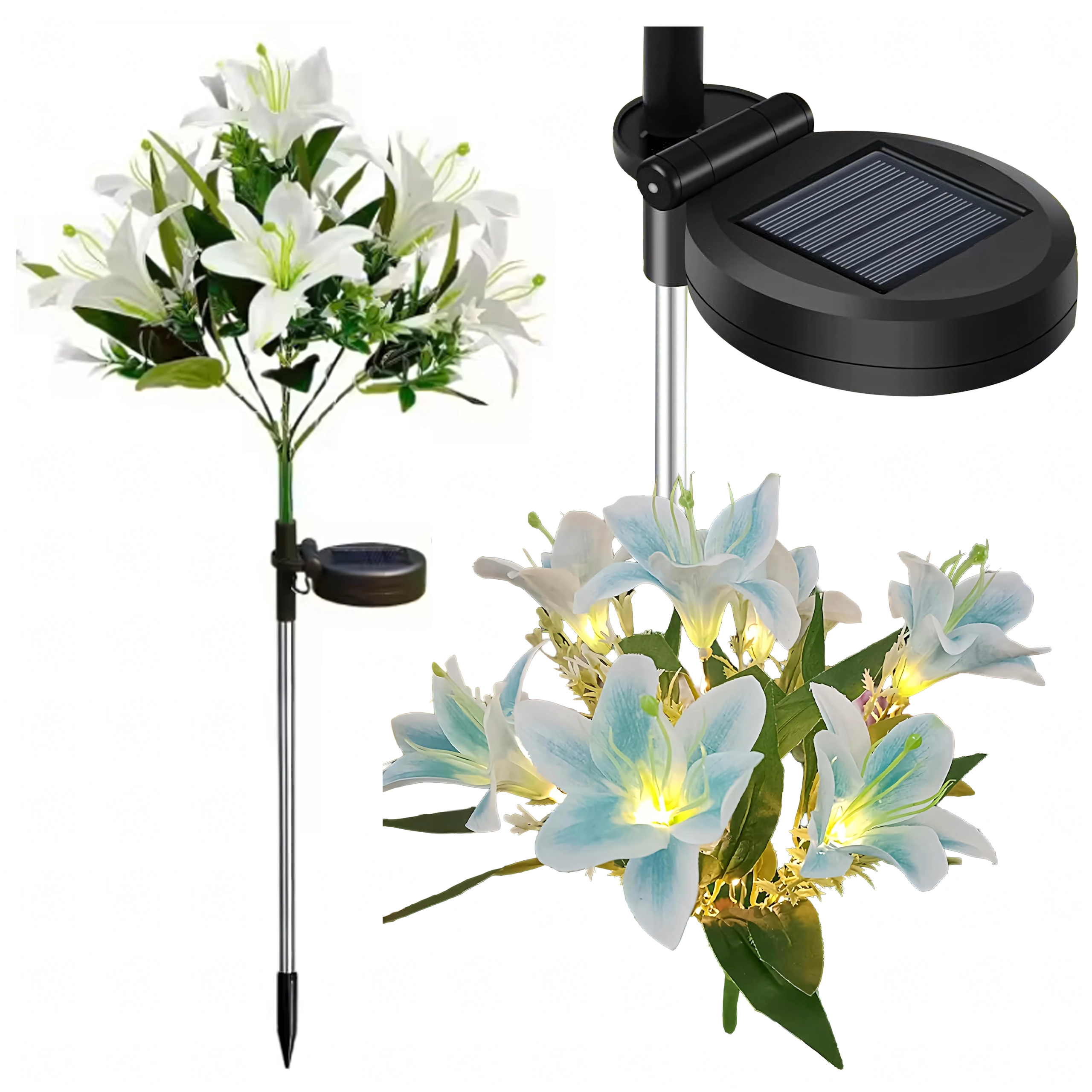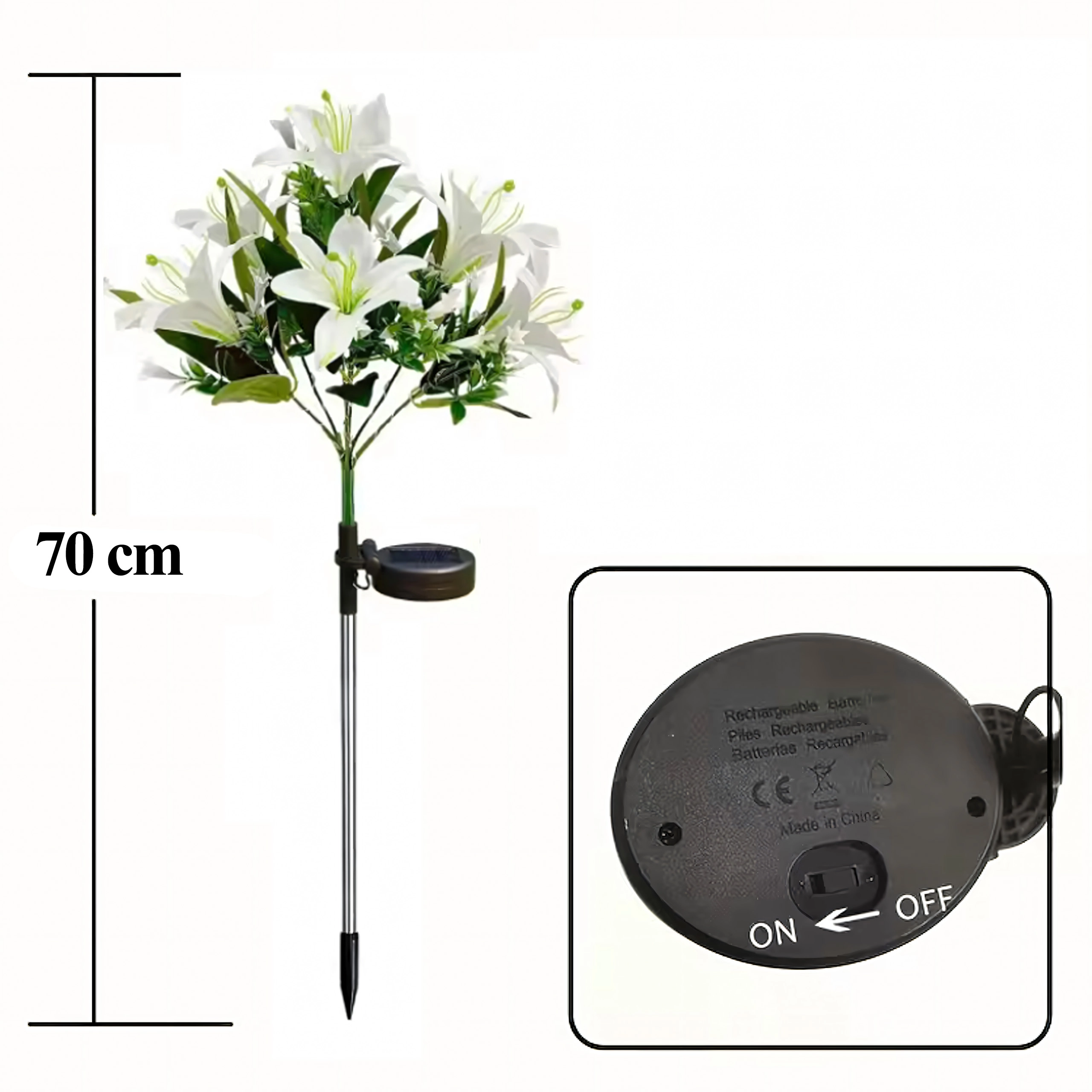 Dekorativna sončna svetilka v obliki lilije bo vašo vrt, balkon ali teraso osvetlila s prijetno toplo svetlobo. Zahvaljujoč sončnemu napajanju se podnevi polni, zvečer pa se samodejno prižge. Trpežna zasnova, realistični cvetovi in enostavna namestitev z enostavnim zabijanjem v zemljo naredijo to svetilko za stilsko in brezvzdrževalno zunanjo dekoracijo z varčnimi LED in samodejnim svetenjem v temi.