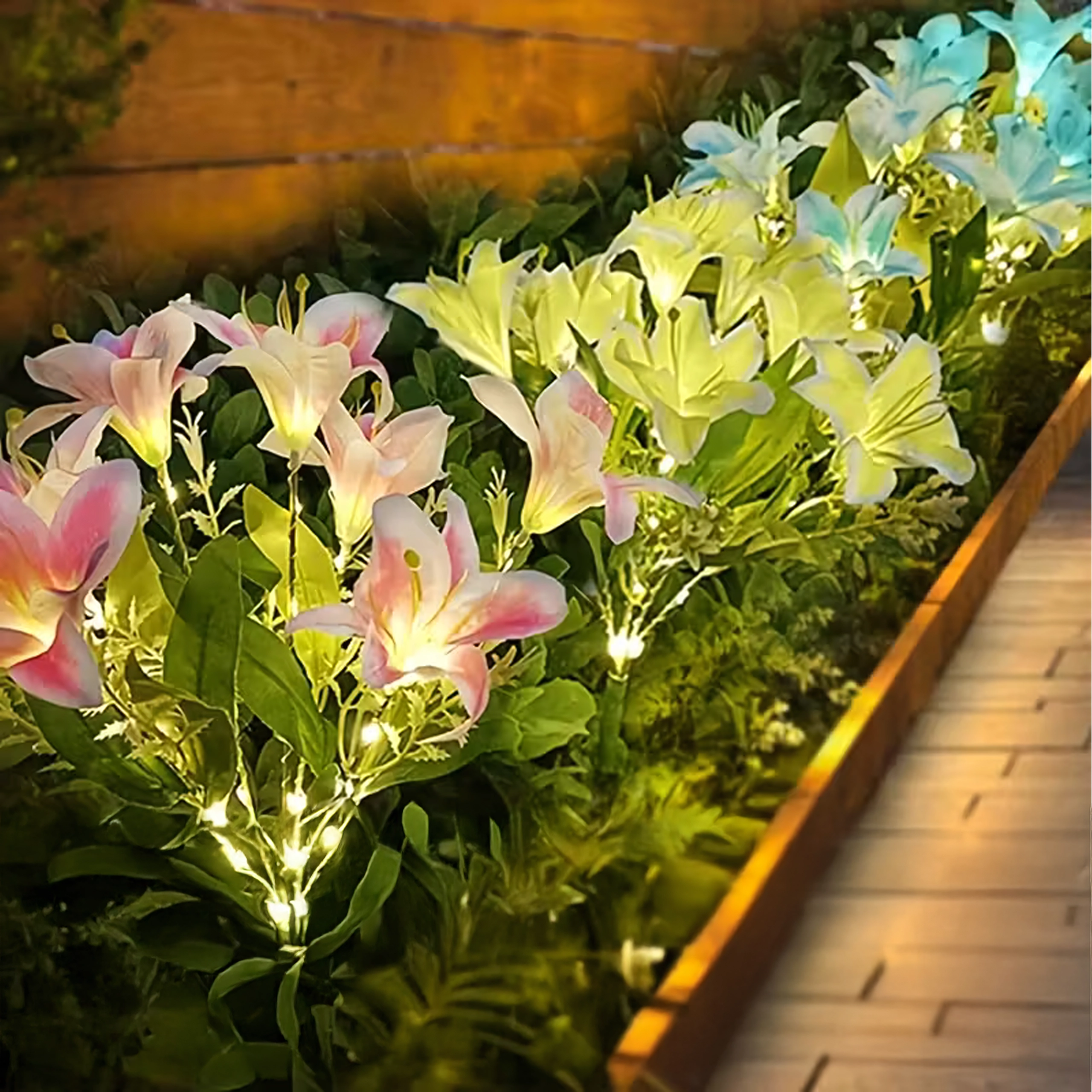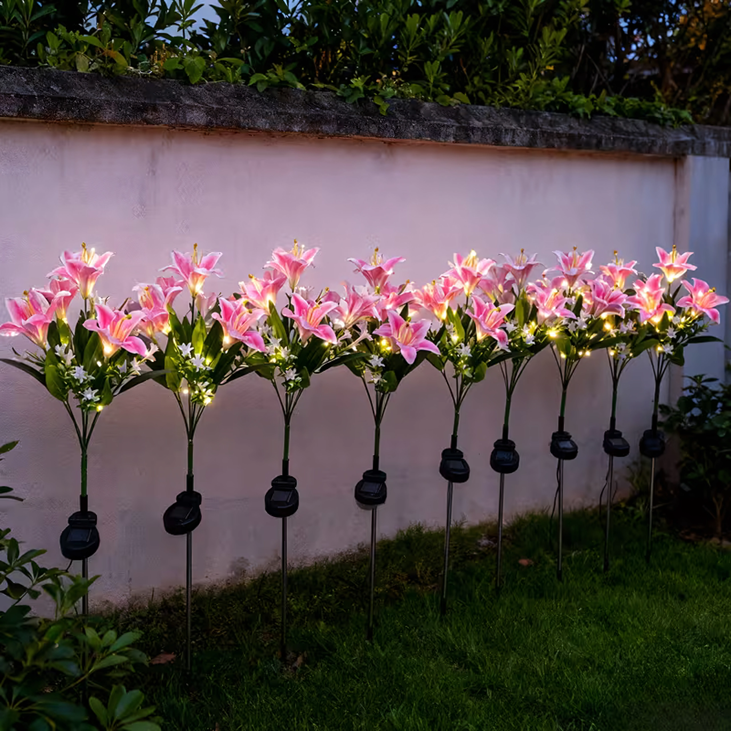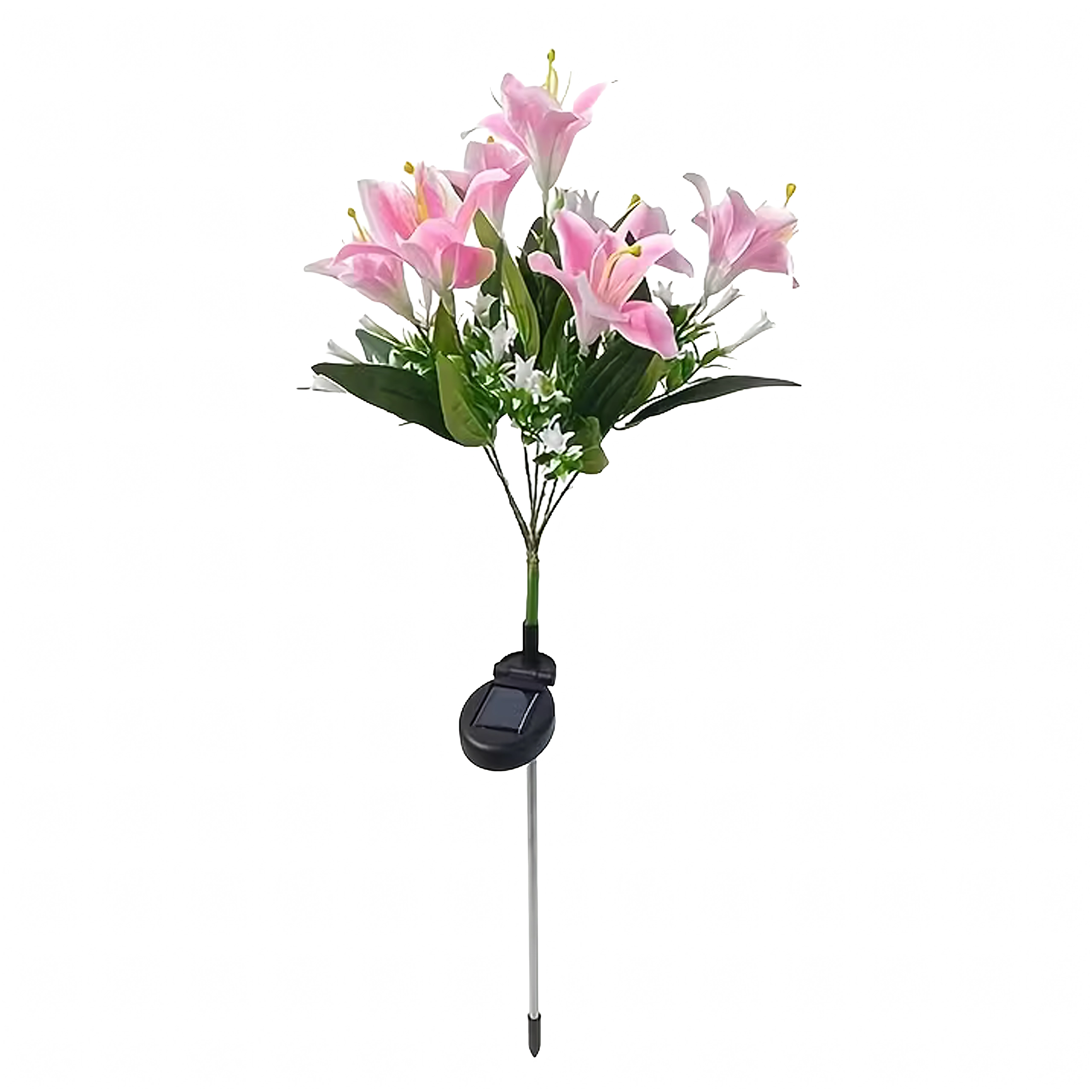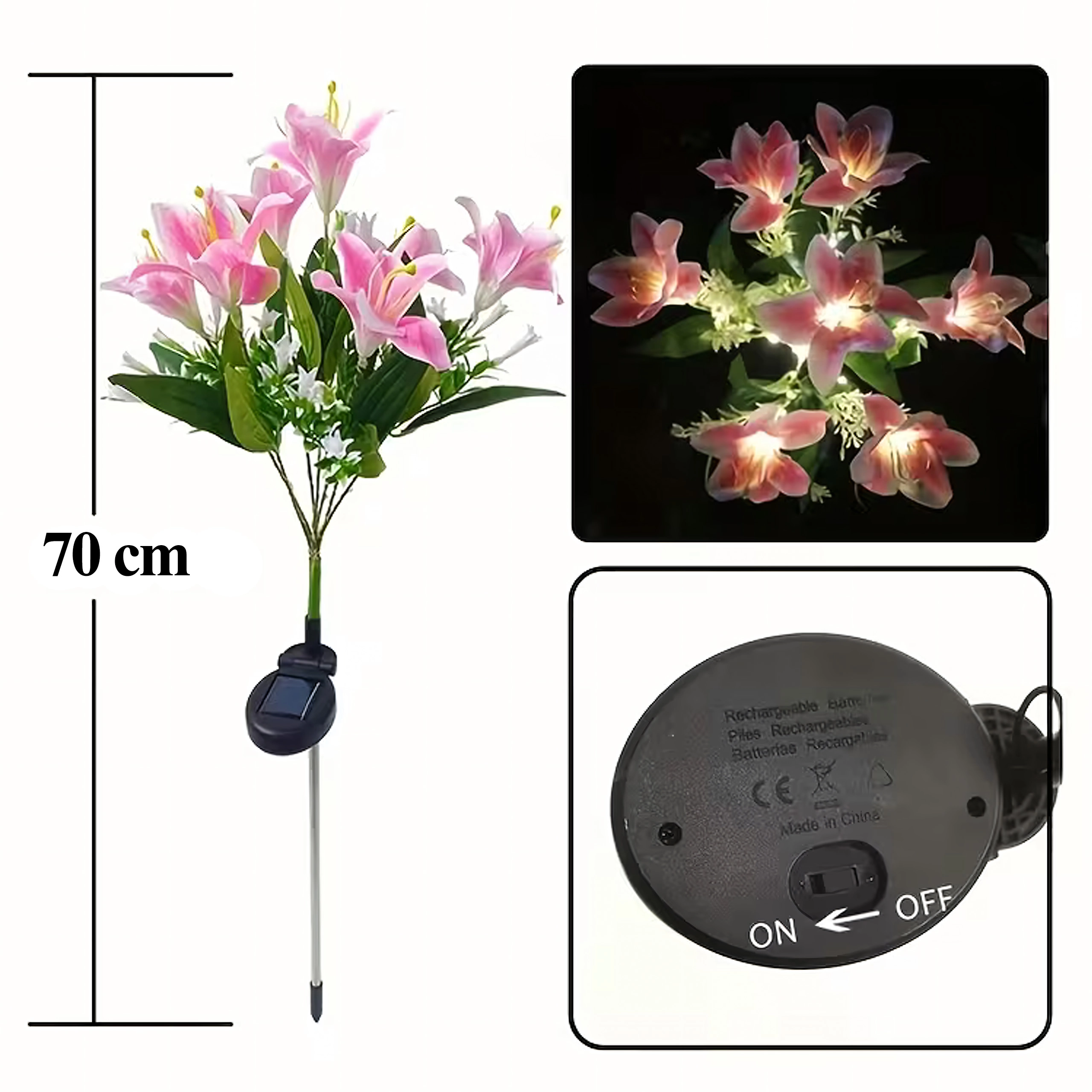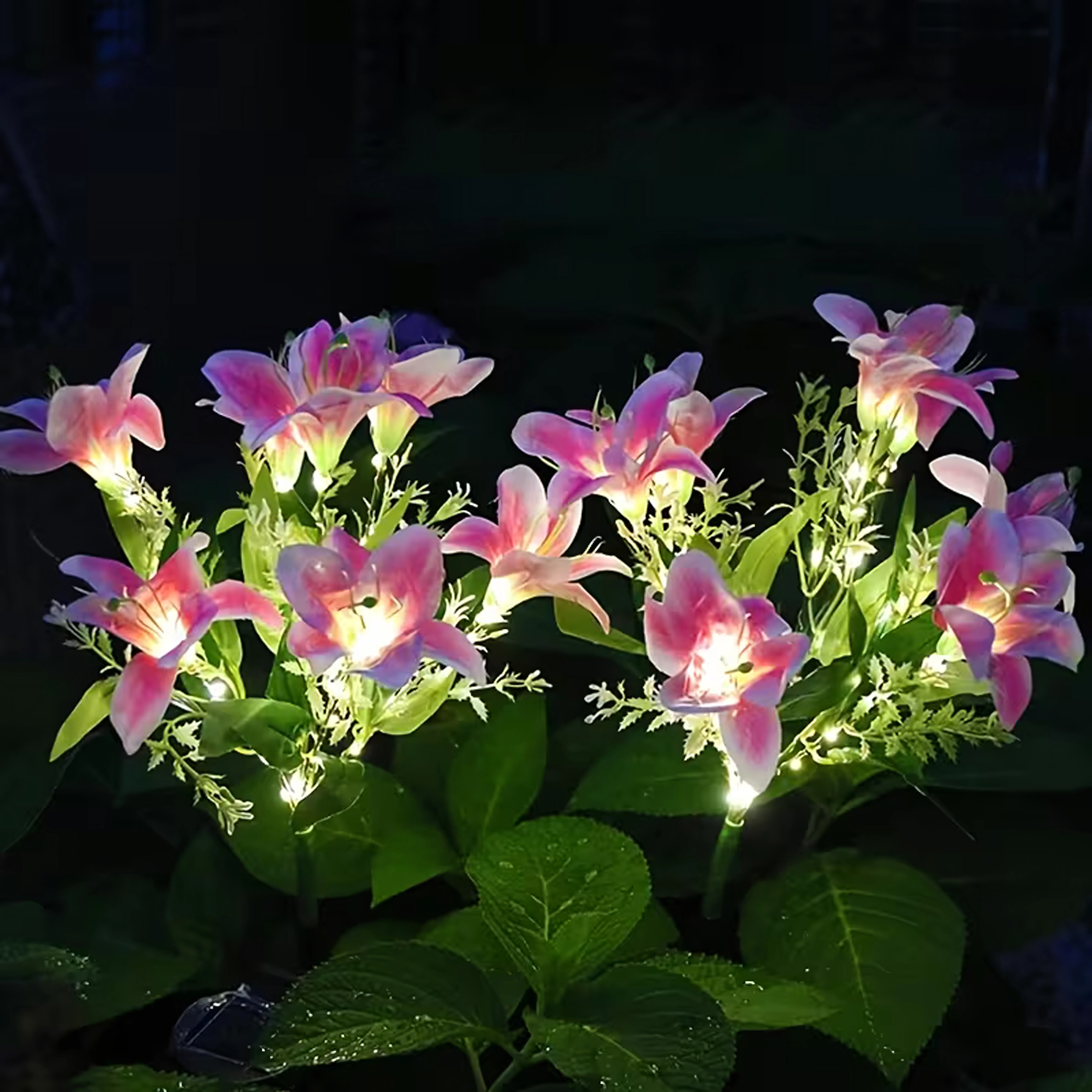 Osvetlite svojo gredo ali pot s stilsko dekoracijo – ta sončna vrtna svetilka v obliki lilije združuje realistične cvetove, toplo bele LED in brezvzdrževalno sončno delovanje. Preprosta namestitev z zabijanjem v tla, podnevi se polni, ponoči pa samodejno sveti. Odporna na vremenske vplive za celoletno zunanjo uporabo.