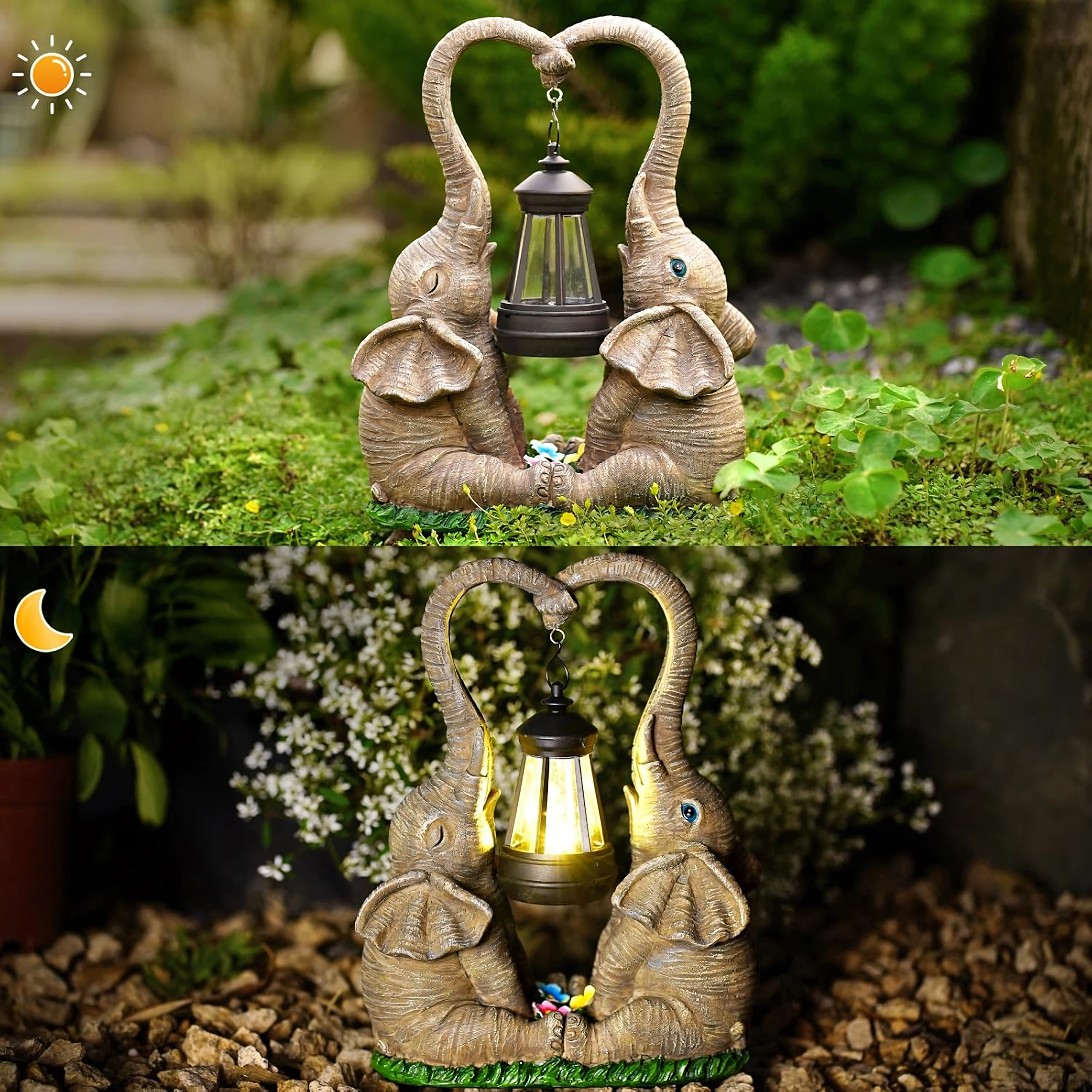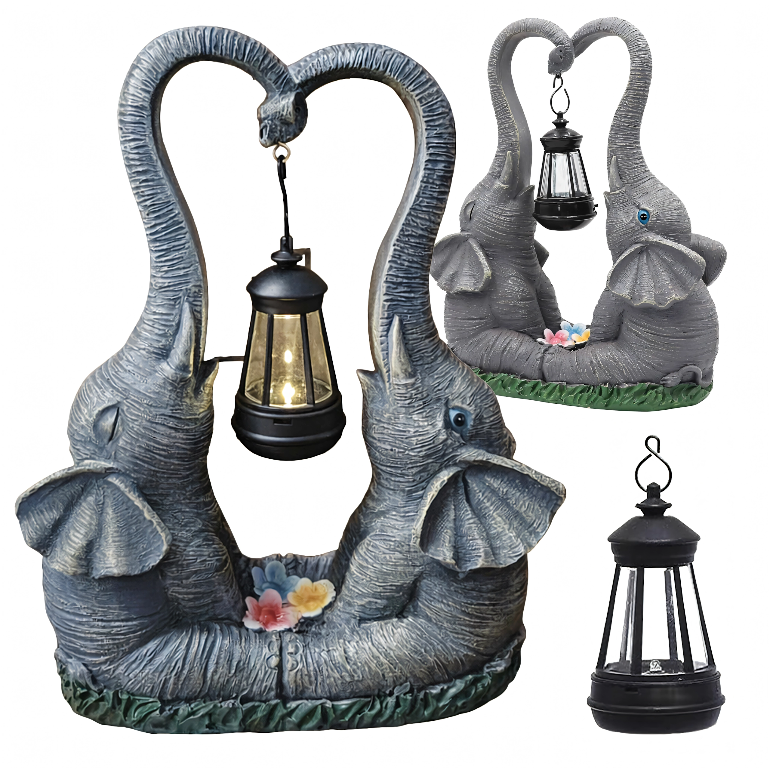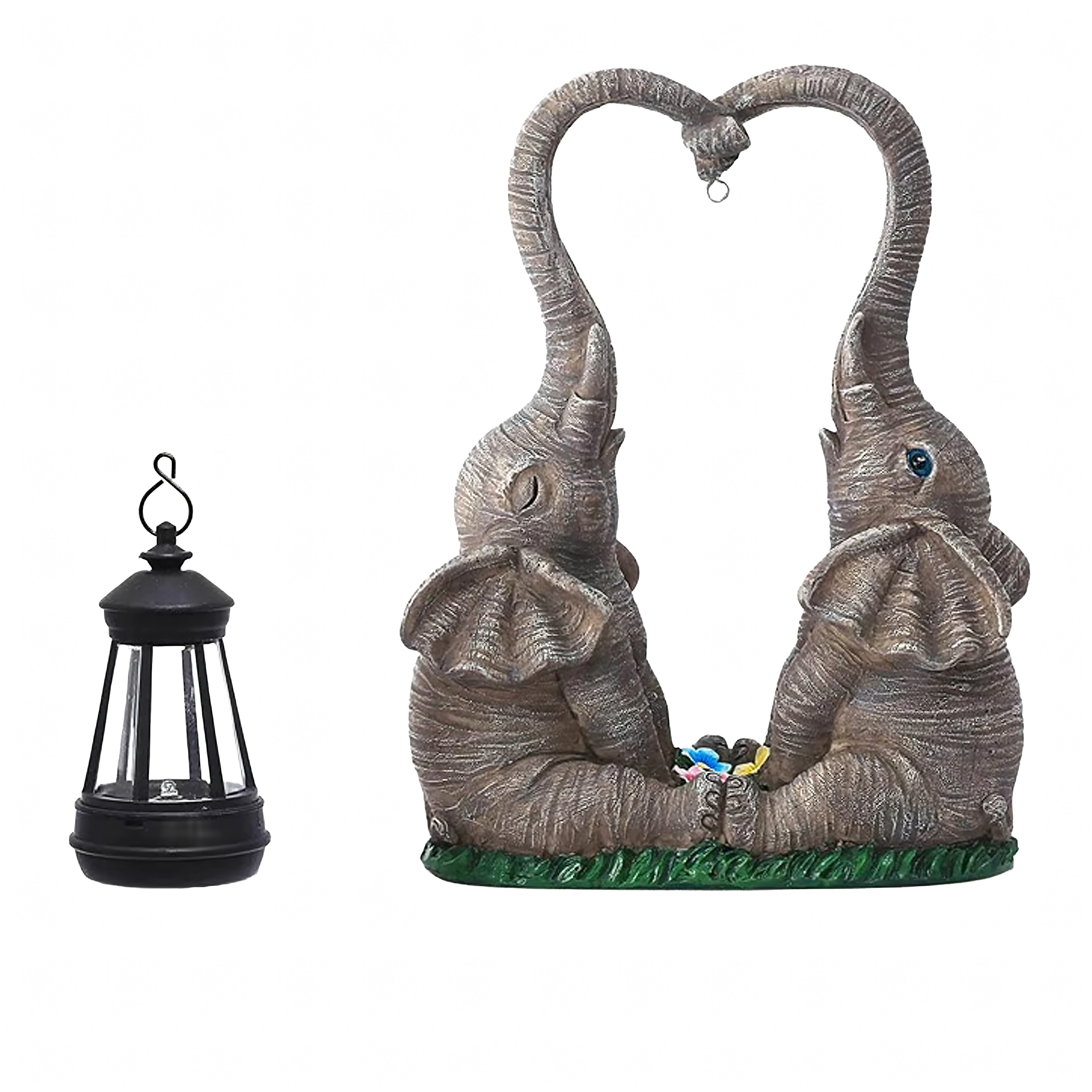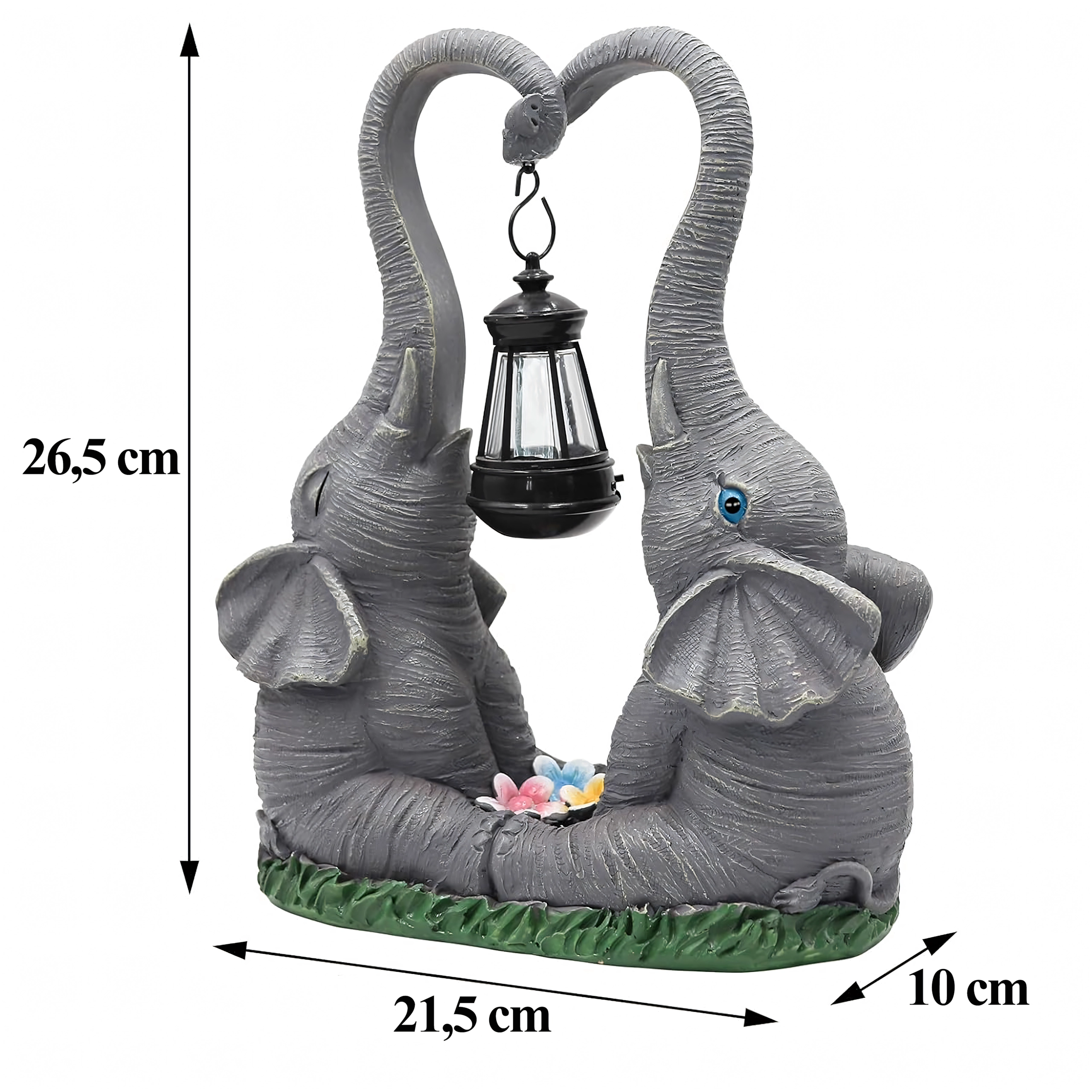 Ljubka vrtna dekoracija z dvema slonoma, katerih rilec tvori srce, nosi obešeno laterno s toplo LED svetlobo. Trpežna figurica iz smole je odlična za vrt, teraso in balkon ter zvečer ustvari prijetno vzdušje. Idealna kot darilni dodatek in stilski poudarek zunanje razsvetljave.