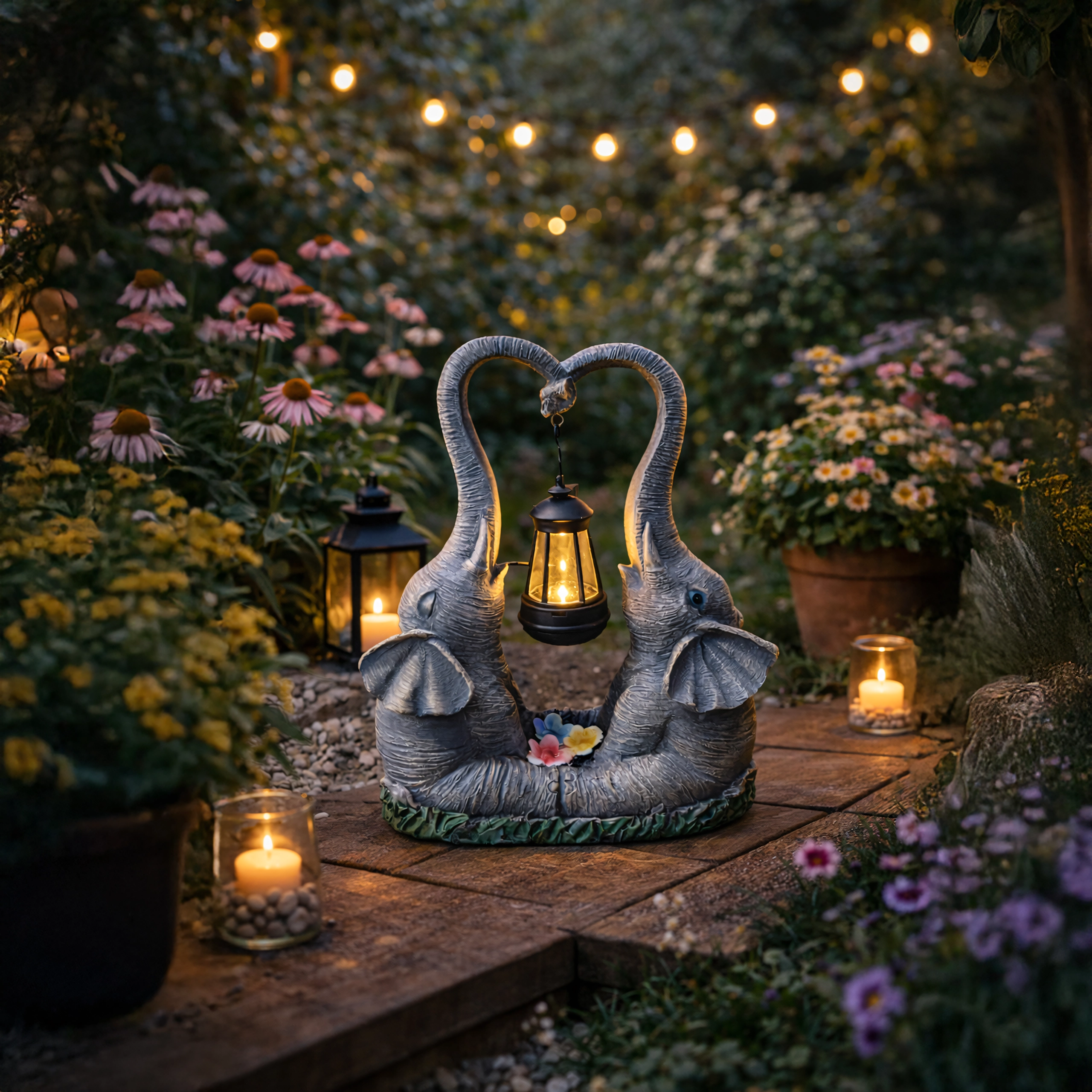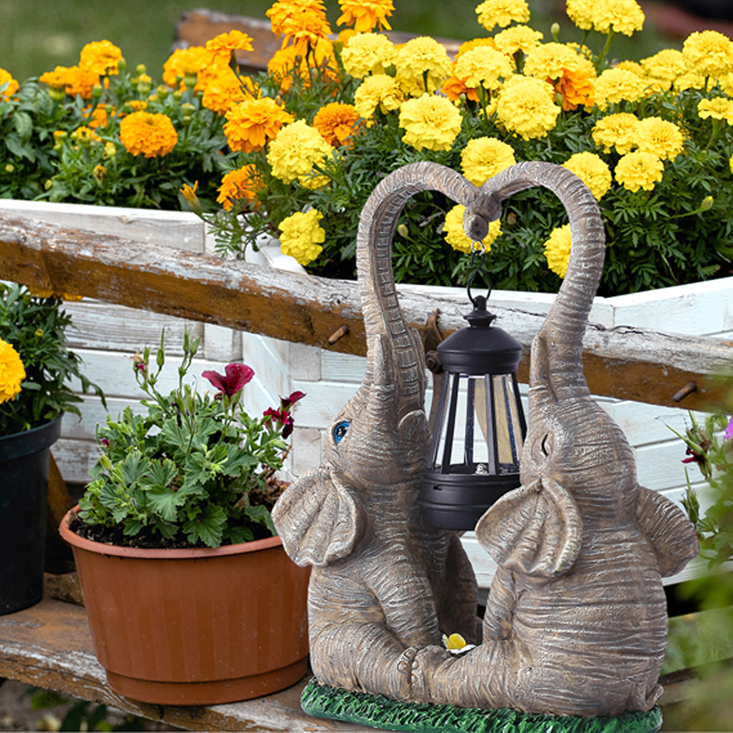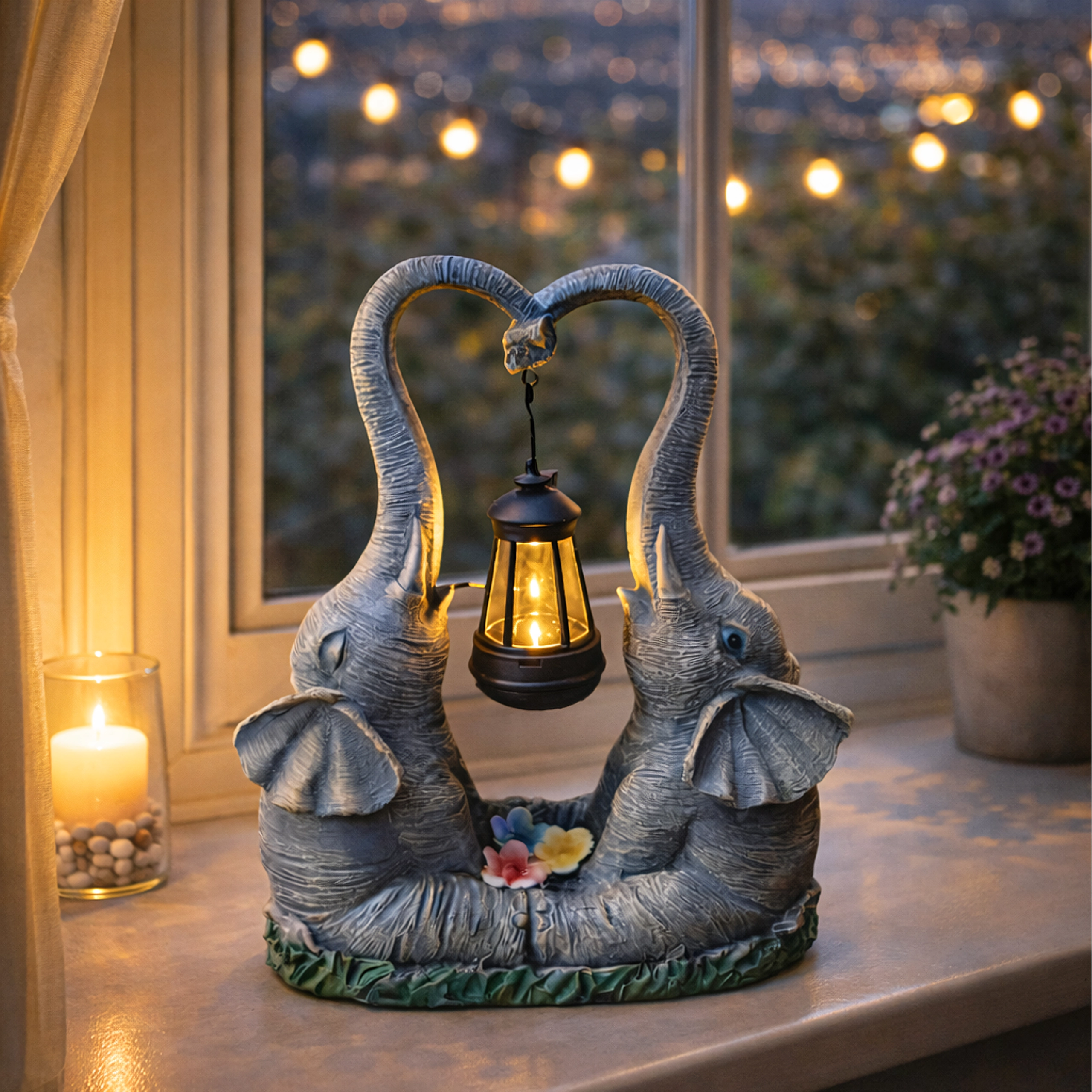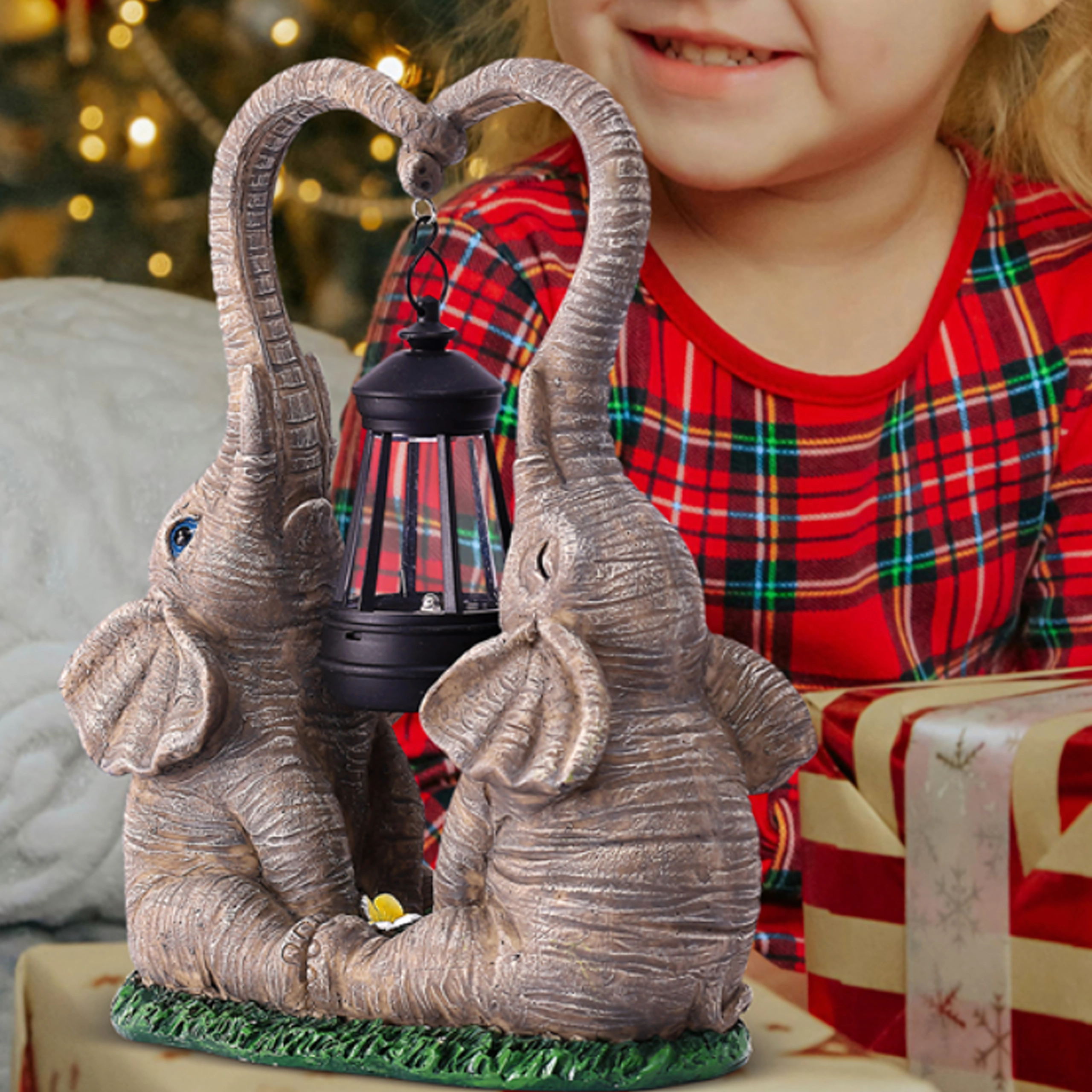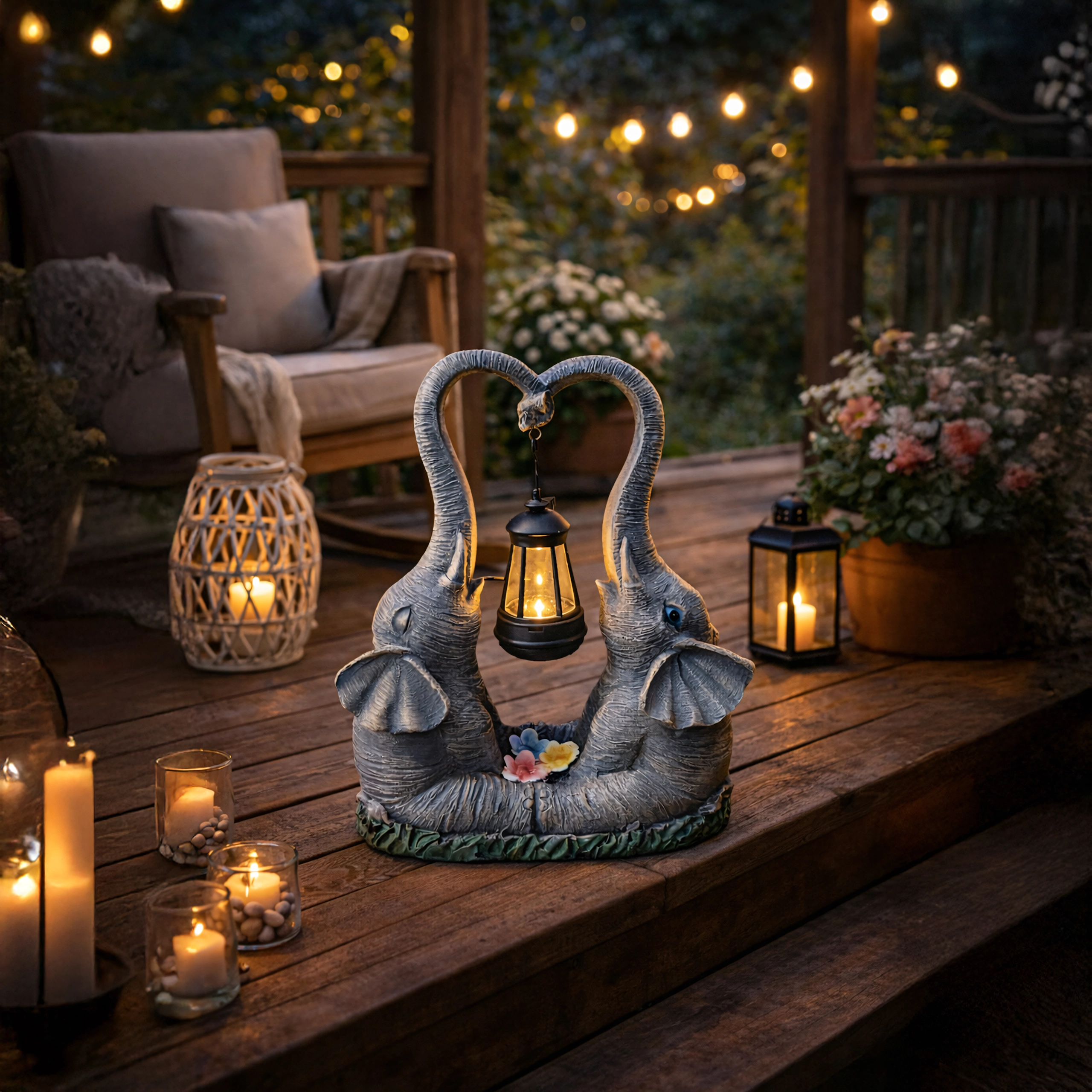 Ljubka vrtna dekoracija z dvema slonoma, katerih rilec tvori srce, nosi obešeno laterno s toplo LED svetlobo. Trpežna figurica iz smole je odlična za vrt, teraso in balkon ter zvečer ustvari prijetno vzdušje. Idealna kot darilni dodatek in stilski poudarek zunanje razsvetljave.
