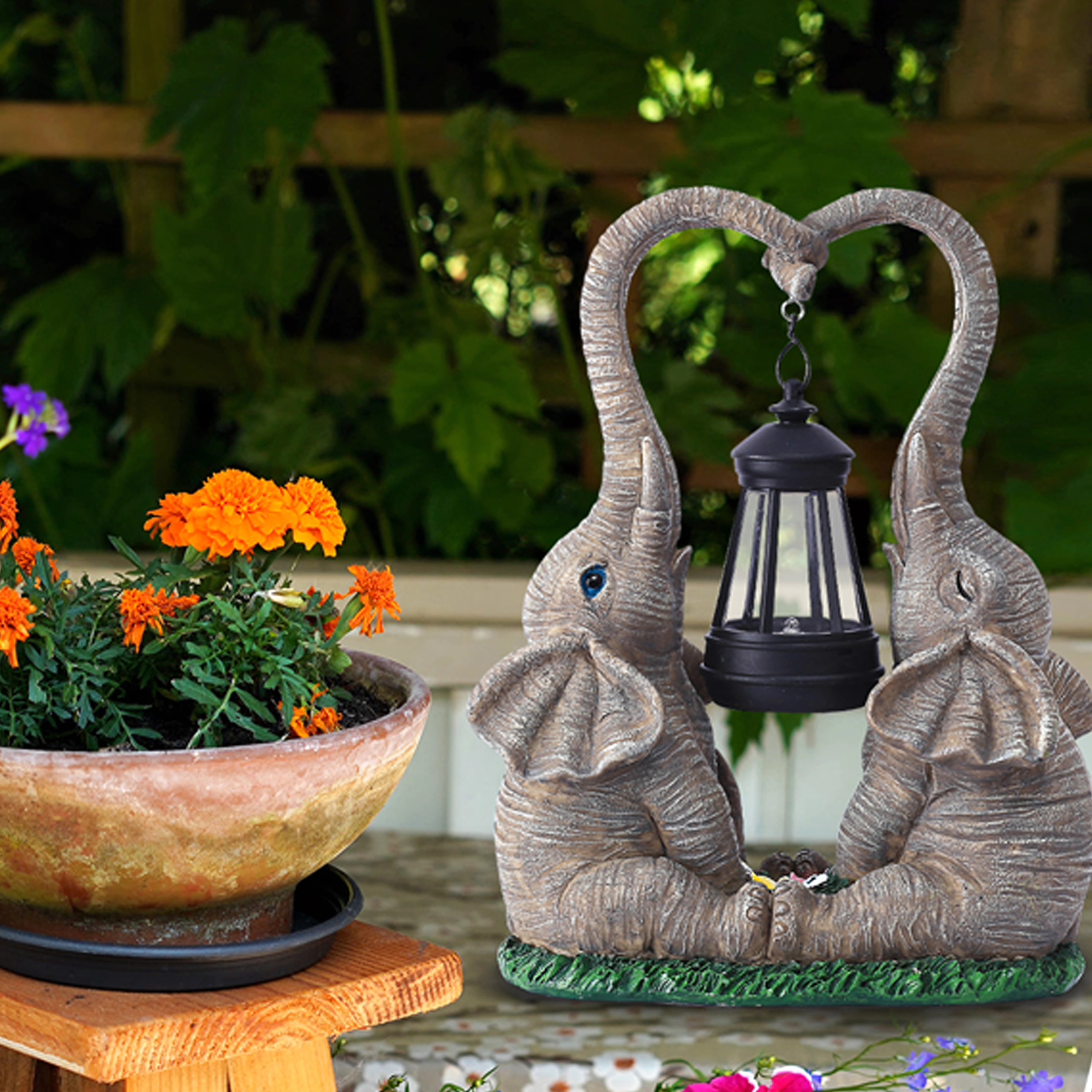 Ta dekorativna svetilka v podobi dveh slonov združuje čar vrtne skulpture in praktično ambientalno osvetlitev. Laterna, obešena med rilcema, oddaja topel sij, ki poudari cvetlične grede, okensko polico ali vrtni kotiček za sedenje.