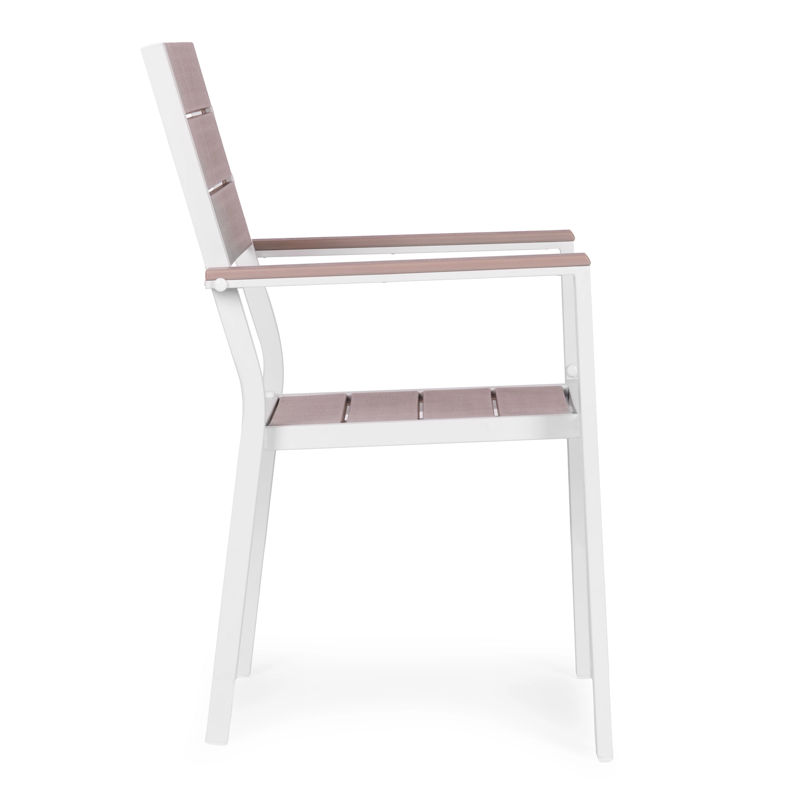 Konstrukcija iz prašno lakiranega jekla zagotavlja visoko odpornost proti koroziji in stabilnost, medtem ko so HDPE plošče z videzom lesa čvrste, hitro sušijo in enostavne za čiščenje. Širše sedalo in naslonjali za roke poskrbita za dodatno udobje tudi pri daljšem sedenju.
