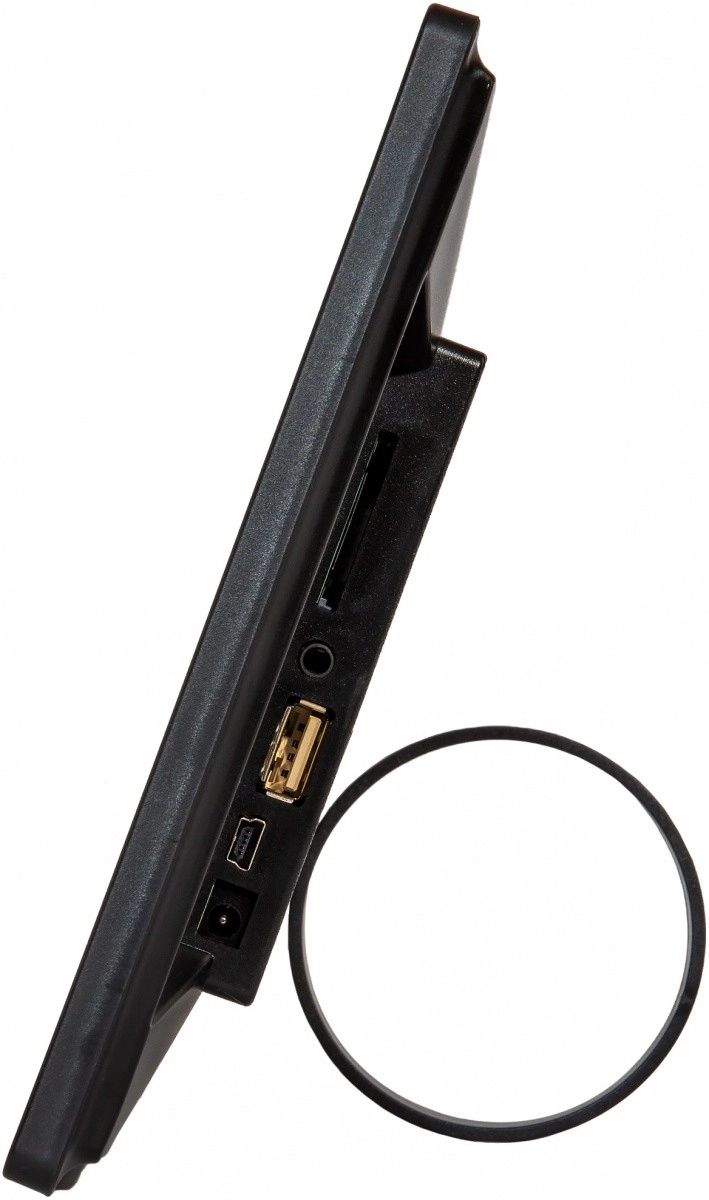 Povezljivost zagotavljata USB 2.0 in univerzalni čitalnik kartic (SD/SDHC/XD/MMC/MS). Vgrajeni zvočnik 2 W skrbi za zvok, za zasebno poslušanje je na voljo izhod za slušalke. Napravo lahko postavite na mizo ali namestite na steno – idealno tudi za diskretne predstavitve v trgovinah ali na recepcijah.