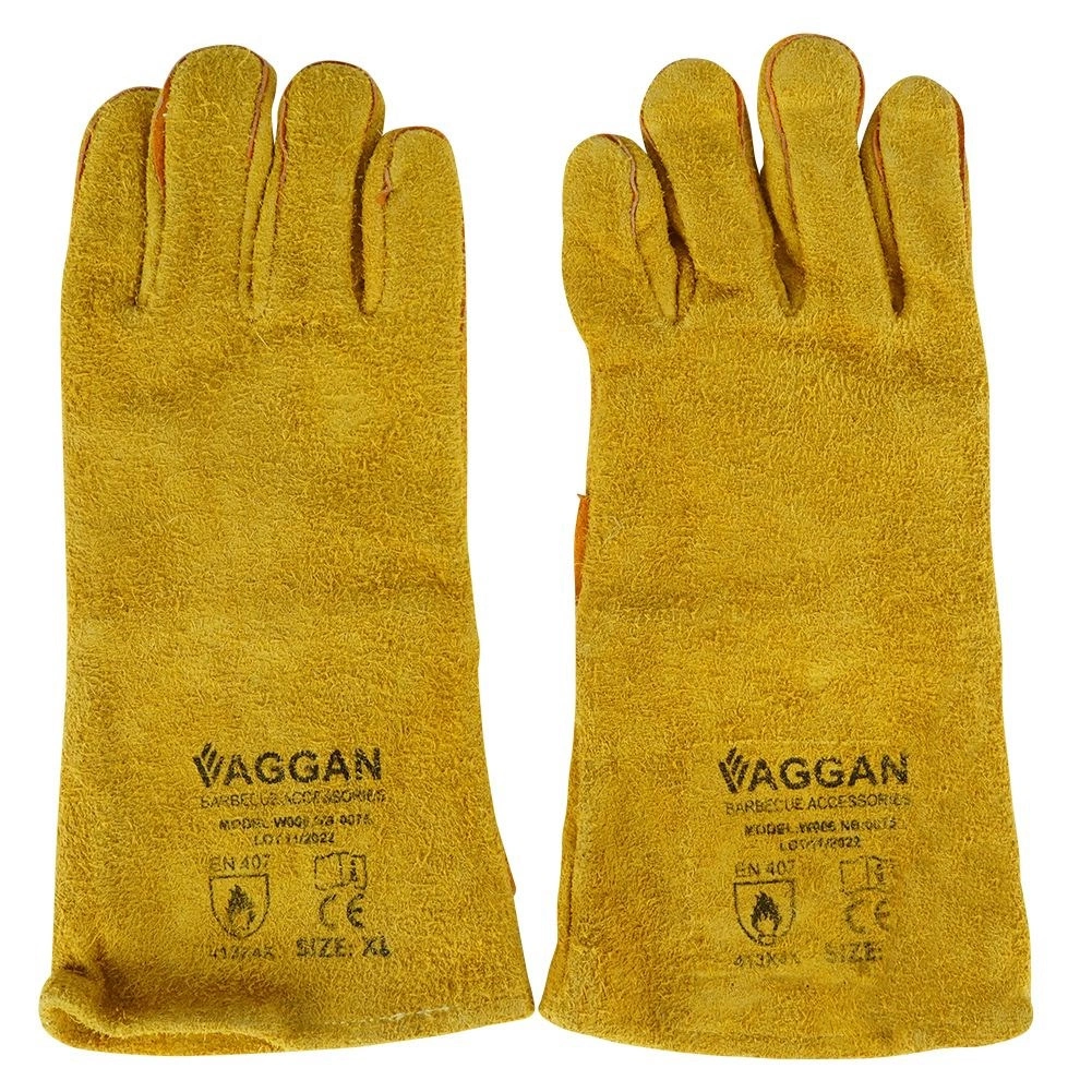 Par kakovostnih usnjenih rokavic za žar dolžine 34 cm in velikosti XL zanesljivo zaščiti roke in podlakti pred žarčenjem. Zaradi notranje flis podloge so udobne, iz mehke kože v gorčičnem odtenku pa hkrati odporne na visoke temperature. Izpolnjujejo standard EN 407 in razred BC, zato so primerne za žar, pečico in štedilnik.
