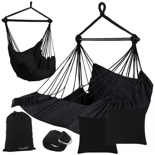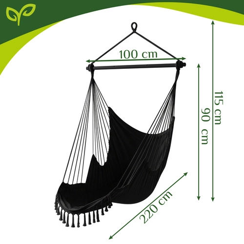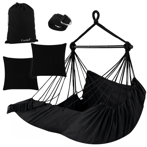 Brazilski viseči stol GARDLOV spremeni balkon, vrt in dnevno sobo v prijetno oazo miru. Trpežno bombažno blago 320 g/m², stabilna kovinska razpetna palica in nosilnost 150 kg zagotavljajo varnost in udobje. V paketu prejmete 2 mehki blazini, pašček za obešanje in transportno vrečo za enostavno prenašanje.