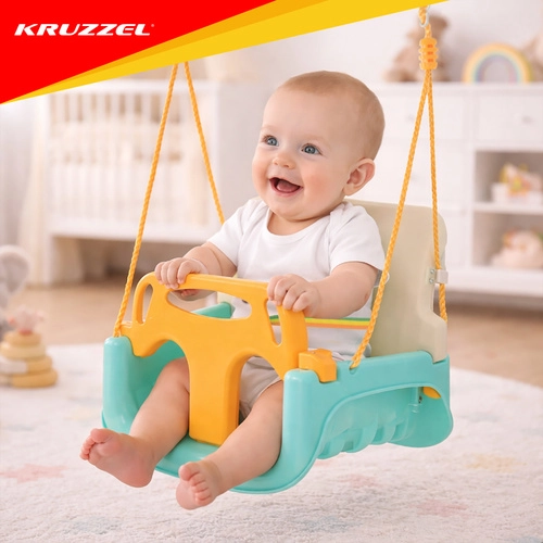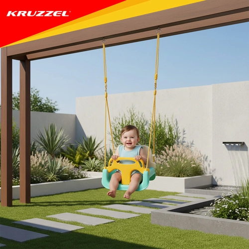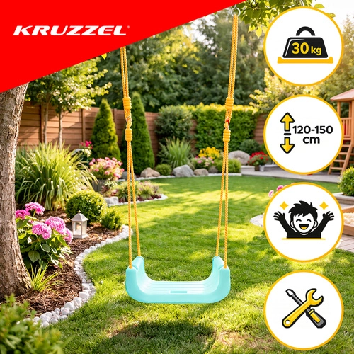 Univerzalna otroška gugalnica 3v1 KRUZZEL se prilagaja rasti otroka – od dojenčka do predšolskega otroka. Ponuja odstranljivo sprednjo ograjo in naslonjalo, varnostni pas, nastavljive vrvi (120–150 cm) in nosilnost 30 kg. Trpežna plastična konstrukcija je primerna za notranjo in zunanjo uporabo ter zagotavlja varno in udobno guganje vsak dan.