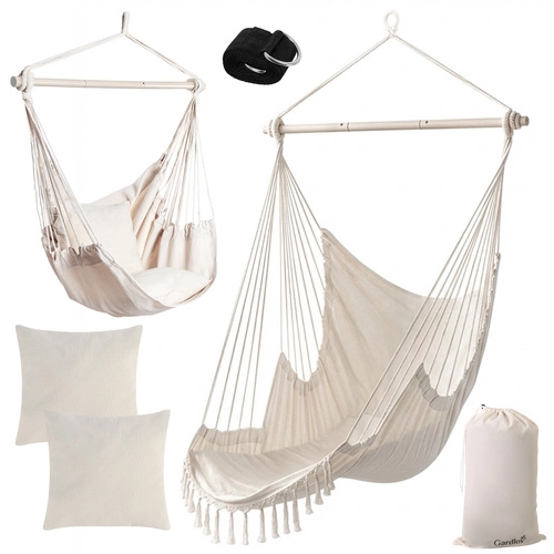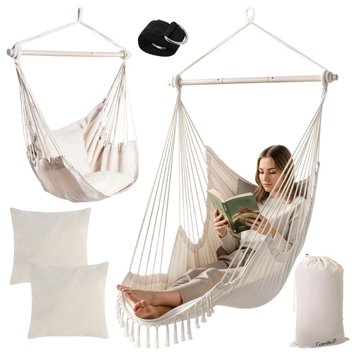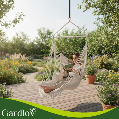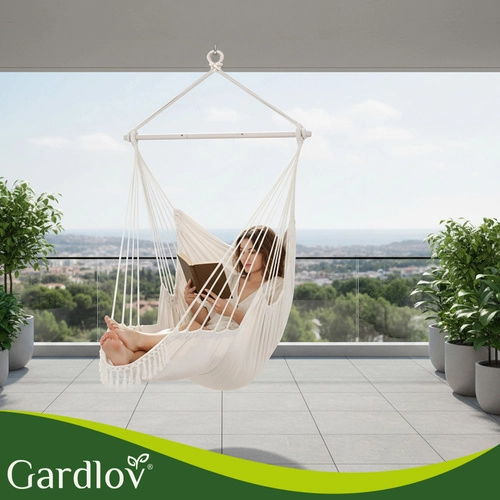Uživajte v mirnem guganju in udobnem sedenju v visečem stolu GARDLOV. Širok sedež iz trdnega bombaža s primesjo poliestra prijetno objame telo, kovinska razpiralna palica doda stabilnost, dva vzglavnika pa poskrbita za takojšnje udobje. Zahvaljujoč nosilnosti 150 kg je idealen za odrasle in najstnike – doma in na prostem.