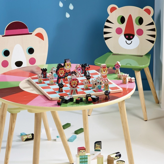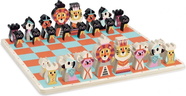 Šahovske figure so ilustrirane kot različne živali, kar naredi igro zanimivo in privlačno za majhne otroke.
