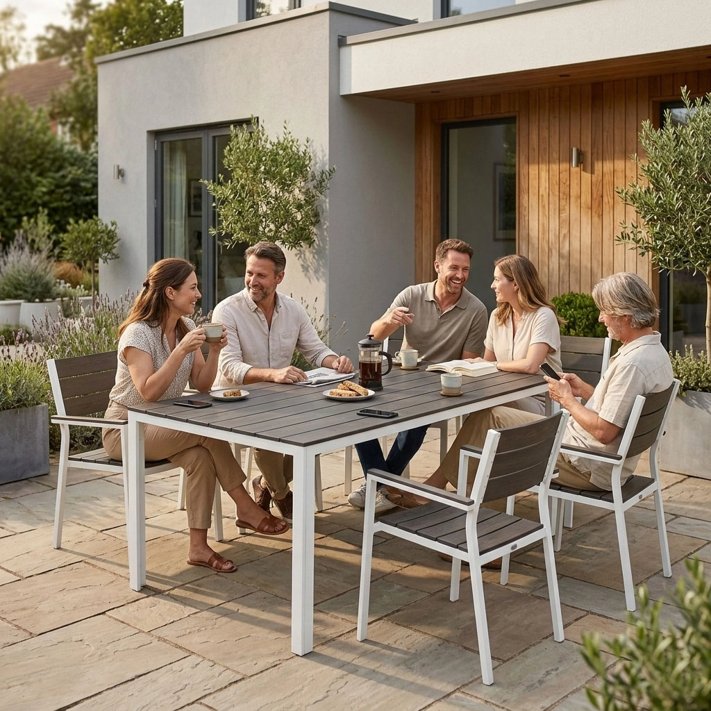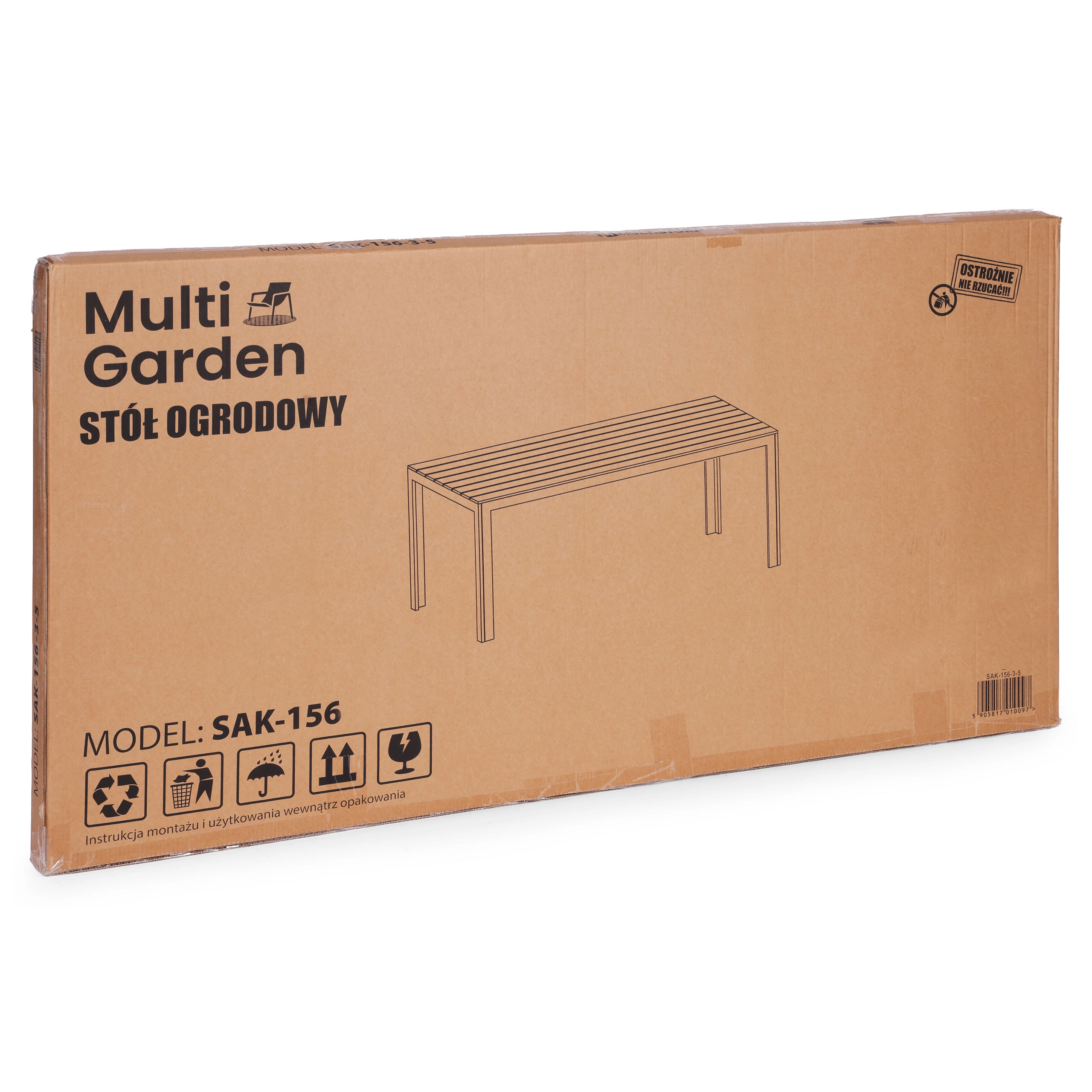 Moderna vrtna miza MULTIGARDEN ponuja udobno sedenje za 6 oseb in veliko ploščo 156 × 78 cm. Odporna jeklena konstrukcija s površinsko obdelavo ter plošča iz polywooda z imitacijo lesa zagotavljata odpornost na vremenske vplive, enostavno vzdrževanje in stabilnost do 150 kg. Idealna za teraso, balkon in vrt.