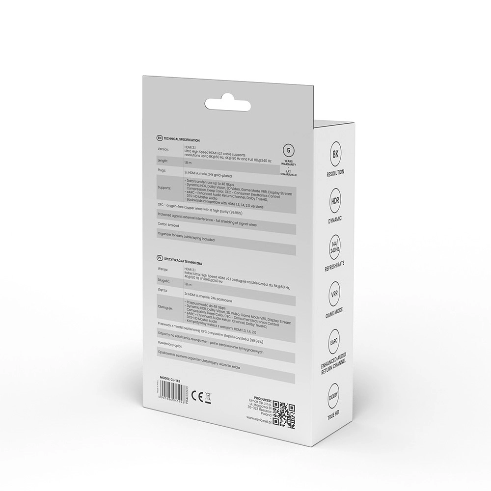 Vzdržljiv najlonski oplet z ojačitvijo proti lomljenju podaljšuje življenjsko dobo tudi pri pogostem priklapljanju. Kabel podpira sodobne standarde HDMI 2.1, kot so eARC, HDR, VRR, ALLM, 3D in Ethernet, zato je pripravljen na sedanje in prihodnje AV-naprave.
