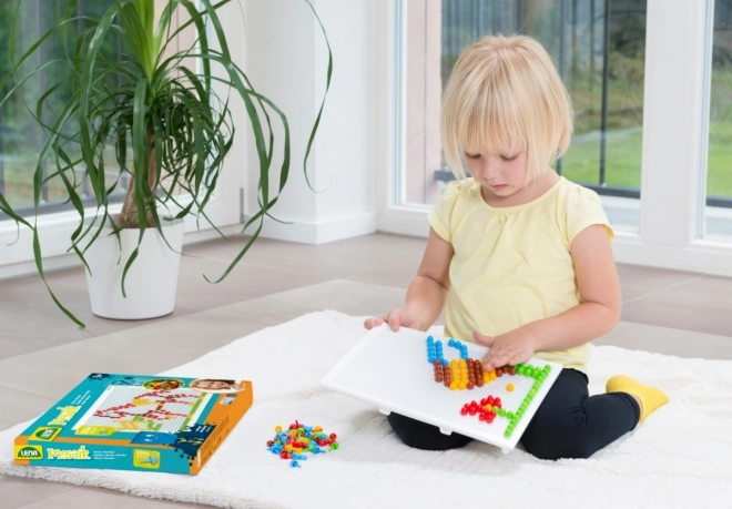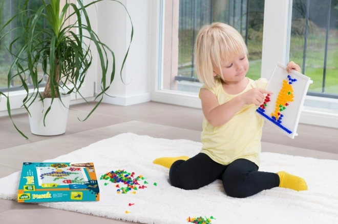 LENA mozaika s 100 barvnimi klobučki je odlična izbira za ustvarjalno igro doma ali v vrtcu. Zahvaljujoč preprostemu sistemu vstavljanja žebljičkov v perforirano ploščo si otroci urijo koordinacijske sposobnosti in potrpežljivost, medtem ko ustvarjajo lastne motive – živali, vozila ali domišljijske vzorce.