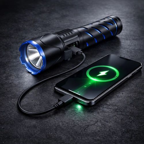 Zahvaljujoč akumulatorju 21700 s kapaciteto 5000 mAh svetilka zdrži do 3–12 ur delovanja (odvisno od načina). Polnjenje prek USB‑C je hitro in udobno, na voljo je tudi USB izhod za funkcijo powerbanka. Digitalni zaslon na ohišju prikazuje trenutno stanje baterije, zato vedno veste, kdaj je čas za polnjenje.