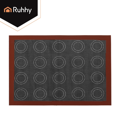 Praktična silikonska podloga RUHHY velikosti 30 × 40 cm olajša pripravo popolnoma hrustljavih sladic brez peki papirja in brez maščobe. Zahvaljujoč mikroperforaciji in ojačitvi iz steklenih vlaken zagotavlja enakomerno porazdelitev toplote, hitrejše odvajanje vlage ter neprijemljivo površino za lahko odstranjevanje peciva. Je dvostranska – ena stran za eklerje, druga za makrone – in predstavlja ekološko, večkrat uporabljivo alternativo enkratnim podlogam.