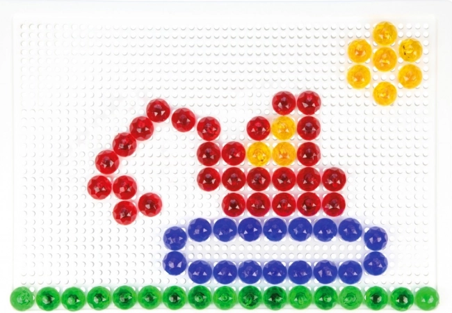 Ta barvita kristalna mozaika omogoča otrokom ustvarjanje izvirnih motivov – od živalic do hišk in prevoznih sredstev. Prosojni zatiči čudovito zasijejo in spodbujajo k nadaljnjemu sestavljanju, medtem ko stabilna mrežasta podlaga vse varno drži na mestu.