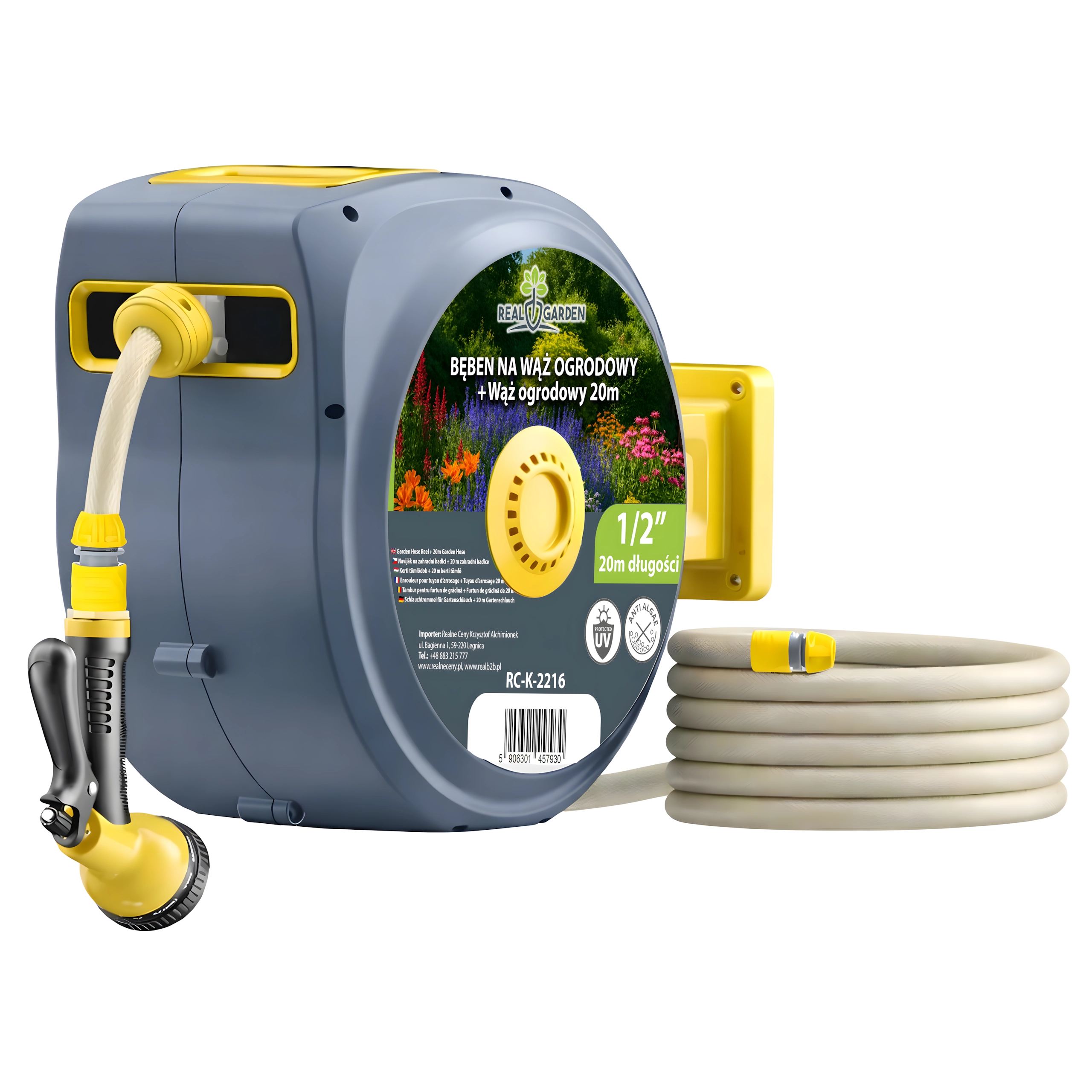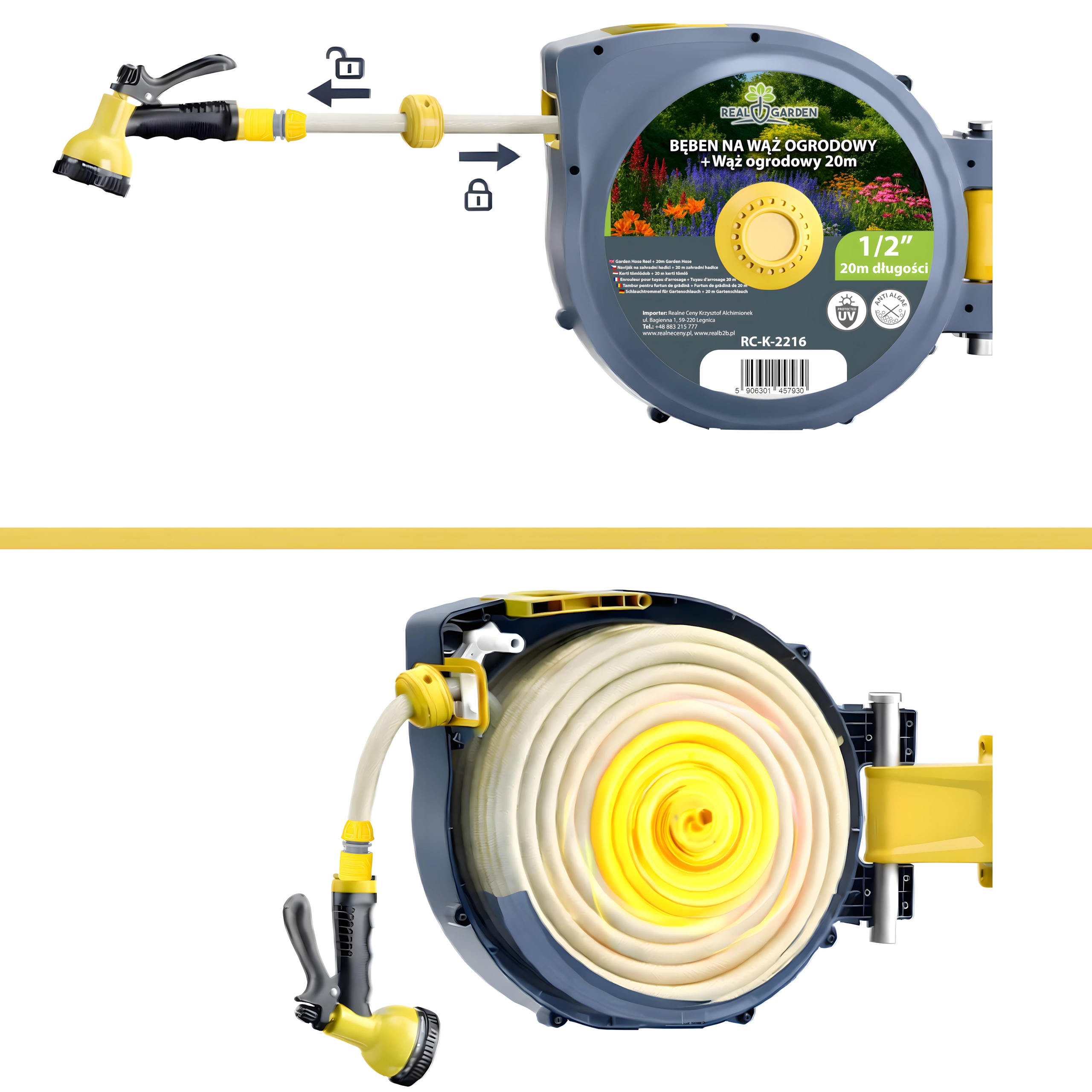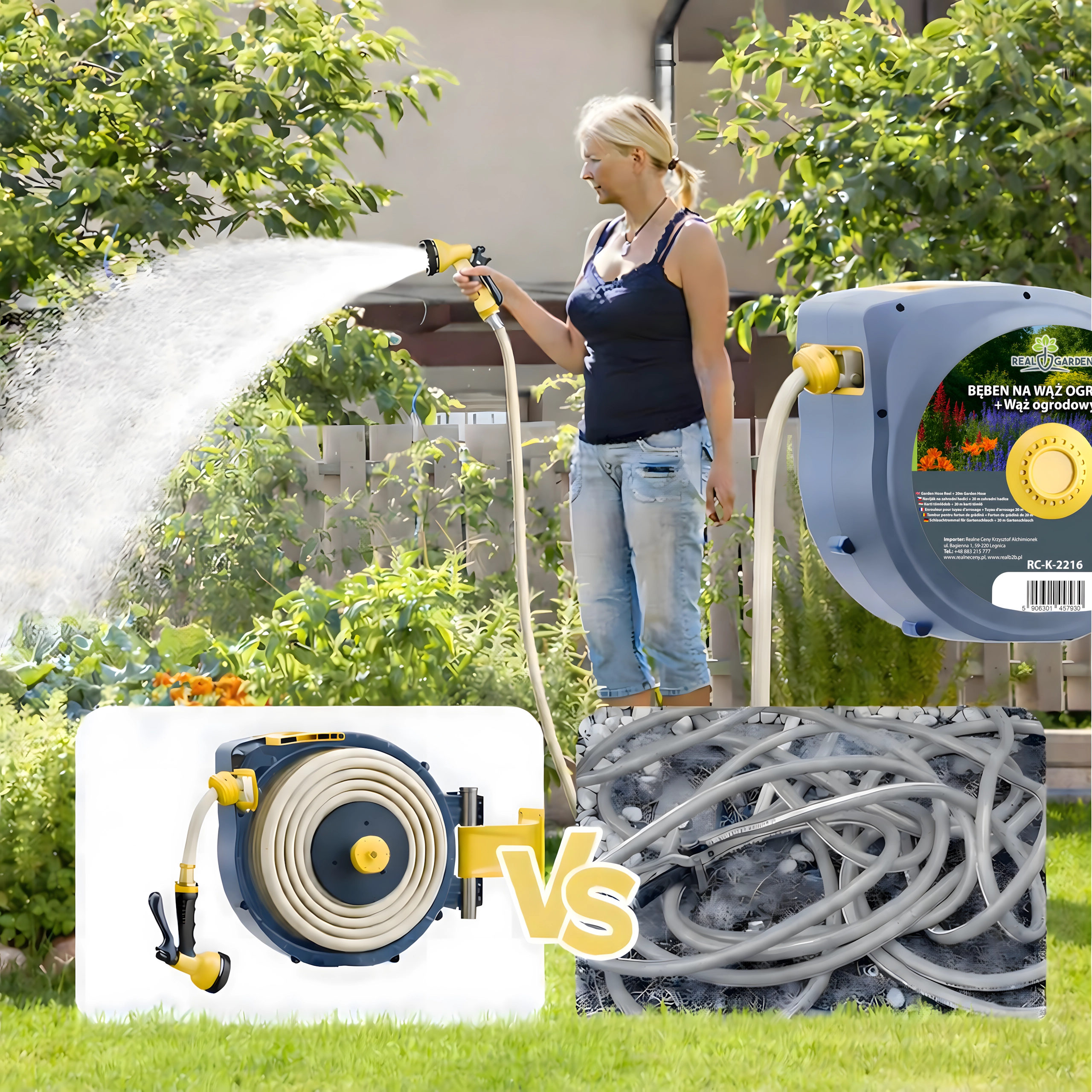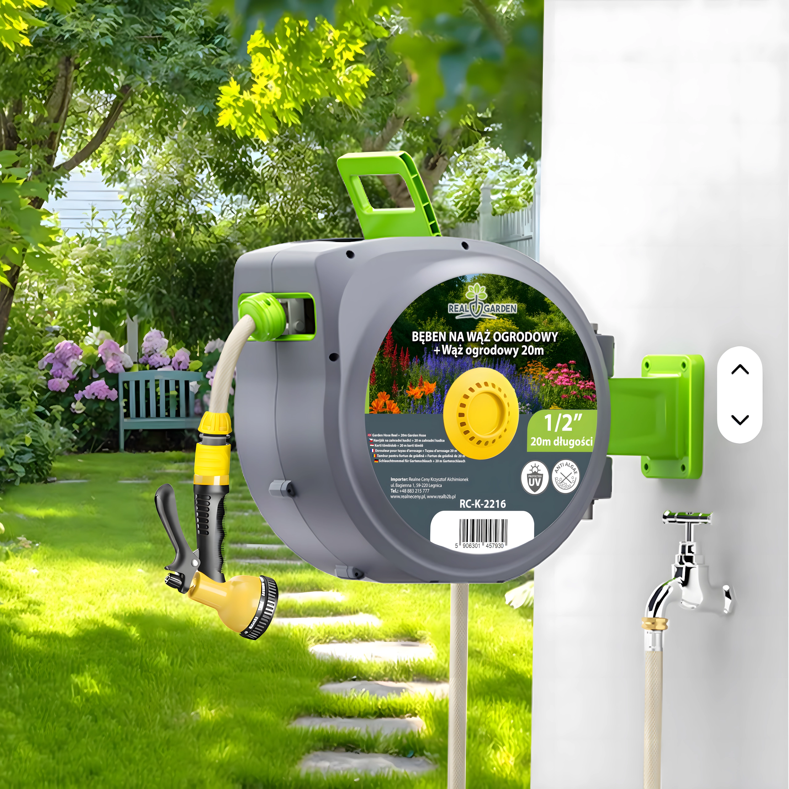 Ohranjajte vrt in dvorišče popolno urejena s tem stenskim nosilcem za cev. Ponuja samodejno navijanje, 20 m cev 1/2" vključno z razpršilnikom z več načini ter čisto shranjevanje brez zapletanja. Idealno za zalivanje, pranje avtomobila in čiščenje okoli hiše.