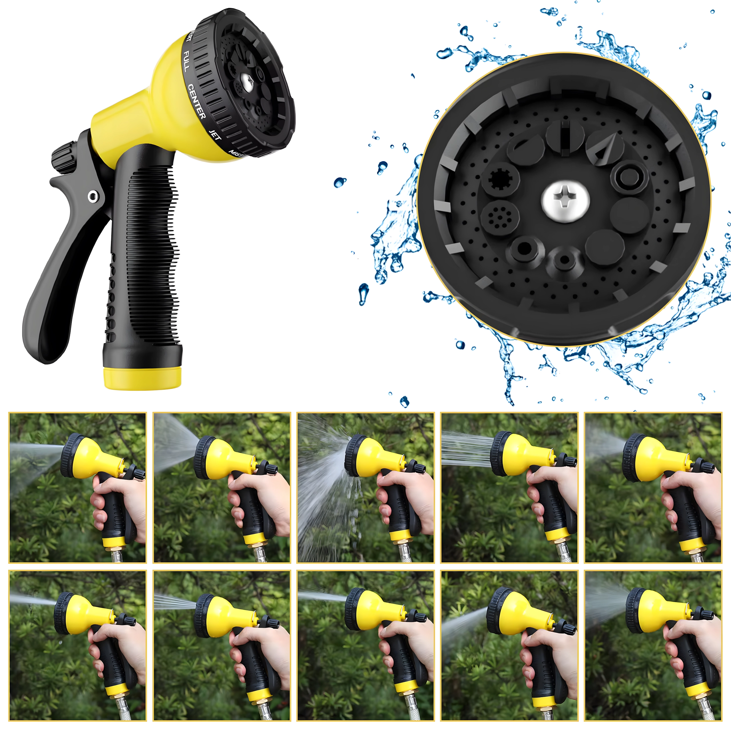 Priložena razpršilna pištola ponuja različne vzorce curka – od nežnega zalivanja do močnega curka za čiščenje, vse z udobnim sprožilcem.
