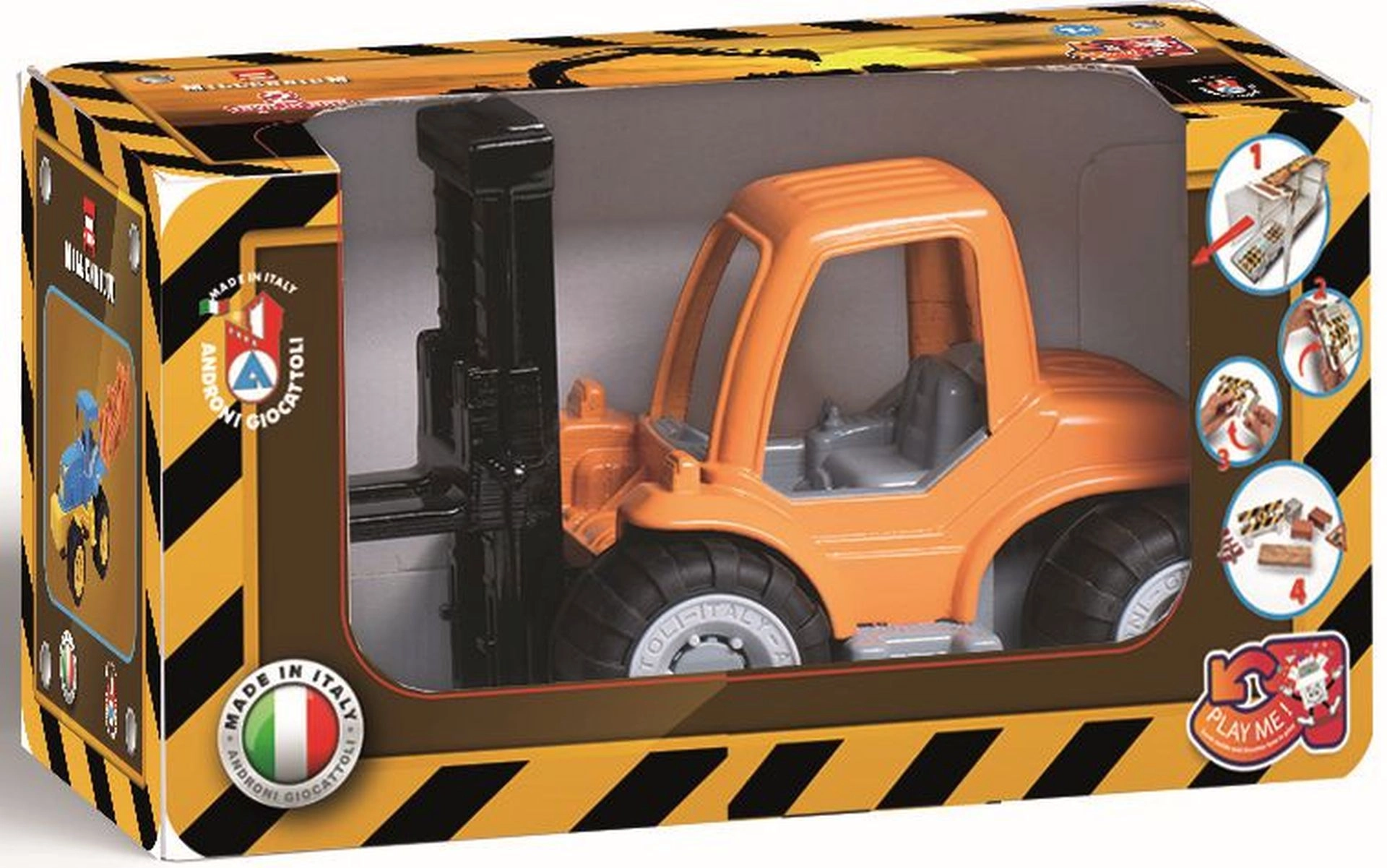 Robusten plastičen viličar iz serije Millennium znamke Androni bo razveselil male graditelje že od 10 mesecev starosti. Ima premične dvižne vilice, gumirana kolesa za stabilnost in je dobavljen z kartonskimi bloki za ustvarjanje igralnih scenarijev. Izdelano v Italiji iz kakovostnih plastik.