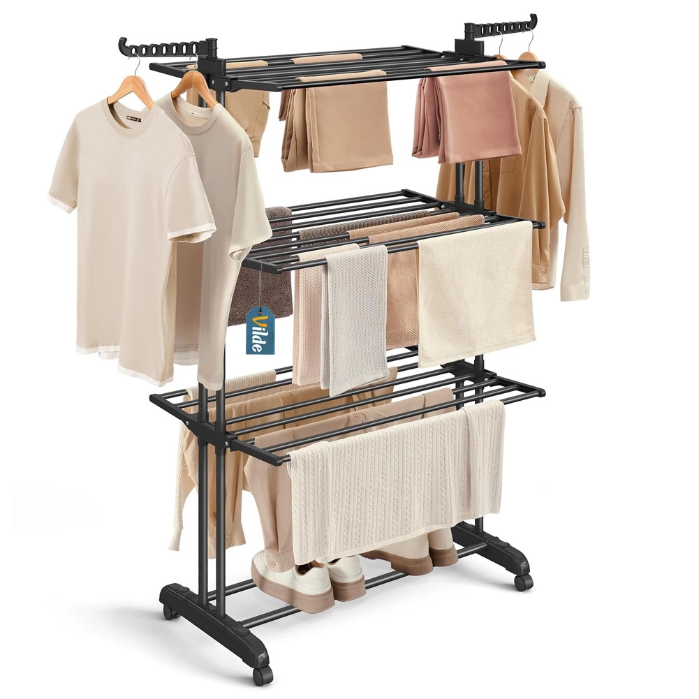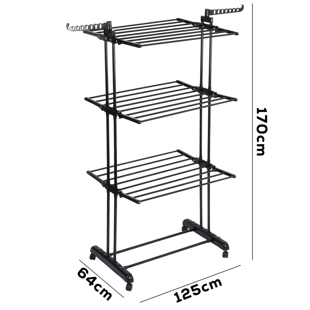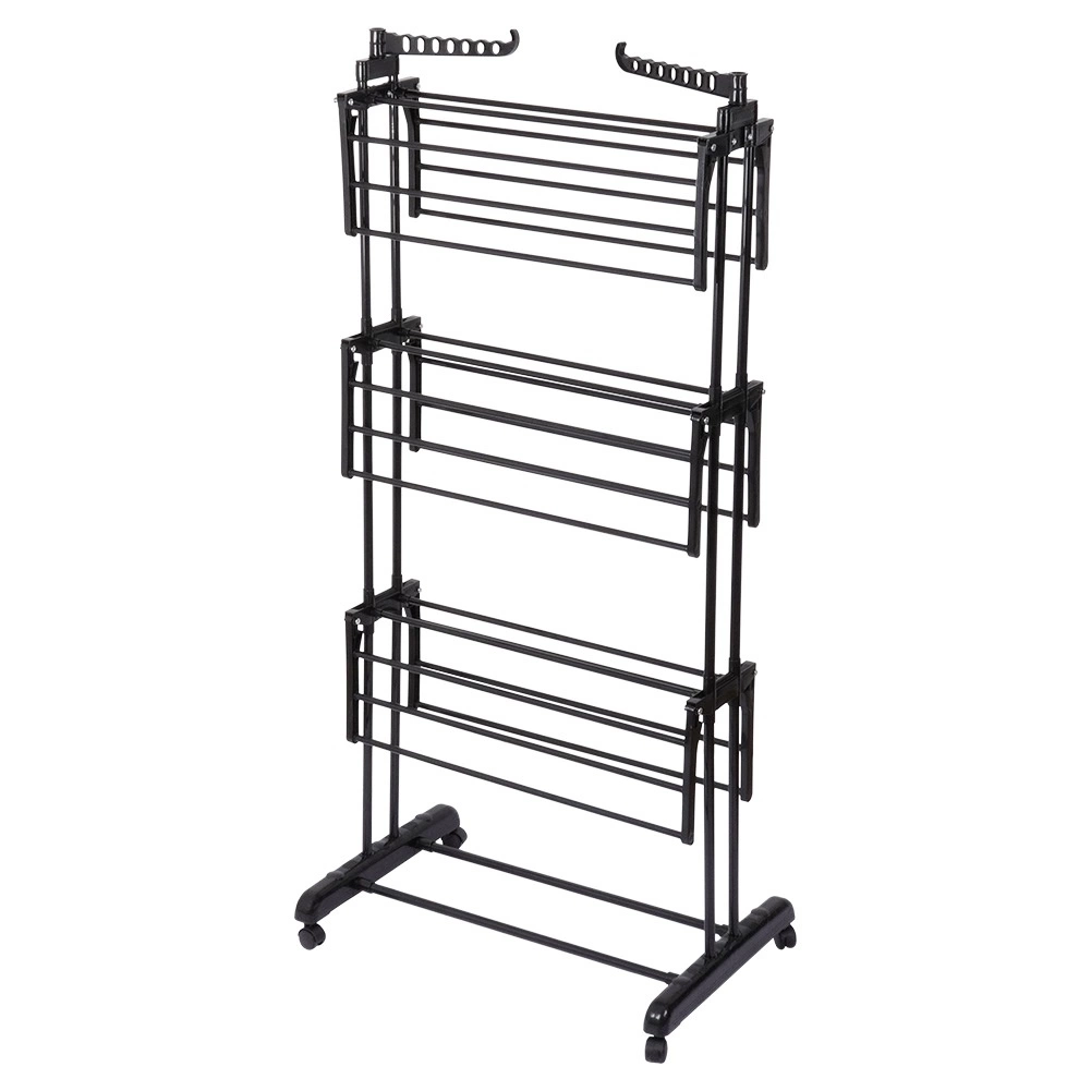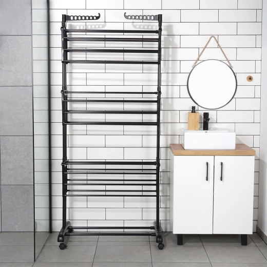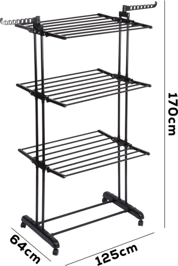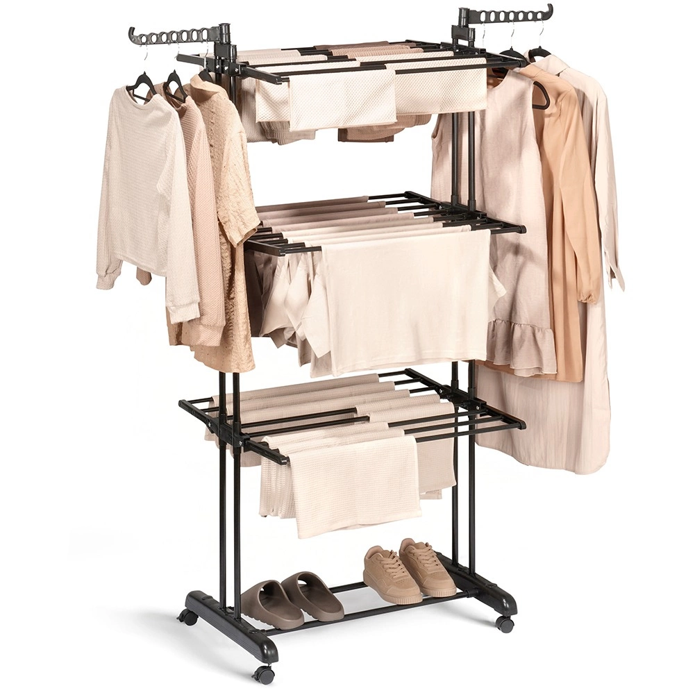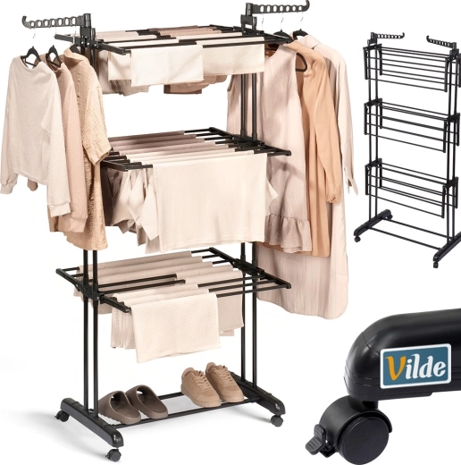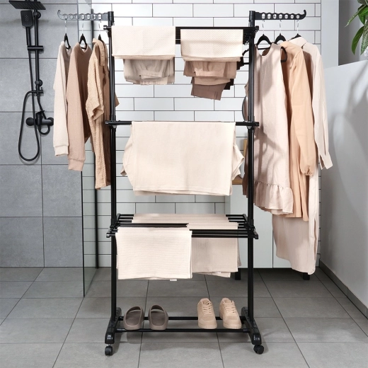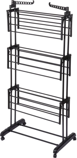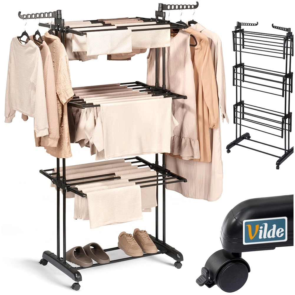 Praktično tristopenjsko stojalo za sušenje perila z robustno kovinsko konstrukcijo v črni barvi ponuja do 24 m sušilne površine, nosilnost 25 kg in udobna kolesca z zavoro. Zahvaljujoč vertikalni zasnovi prihrani prostor, ima zložljiva krila, stranski ročaji za obešalnike (14 mest) in spodnjo polico za obutev – idealno za stanovanje, balkon in teraso.