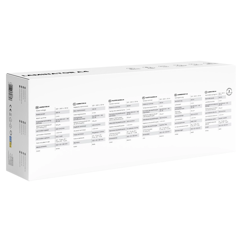 Kompakten laminator SAVIO LR-01/W ščiti dokumente, fotografije in certifikate pred poškodbami. Ponuja vročo in hladno laminacijo, hitro segrevanje v 2 minutah, hitrost do 320 mm/min ter podporo formatov A4, A5, A6. Stabilna moč 300 W in folije do 125 mikronov zagotavljajo gladek, profesionalen rezultat brez mehurčkov – idealno za pisarno in dom.