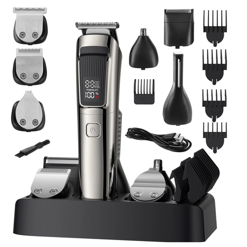 - večnamenska naprava; nastavki za striženje (0/3/6/9/12 mm); brivni nastavek (folija); nastavek za brado in brke (glavni 0 mm, val); telesni nastavek (0 mm + podaljšek); nastavek za zalizce 0 mm; nastavek za nos in ušesa; kabel USB–USB‑C; dvostranska čistilna krtačka; stojalo z organizatorjem; transportni vložek; večjezična navodila; barvna embalaža proizvajalca