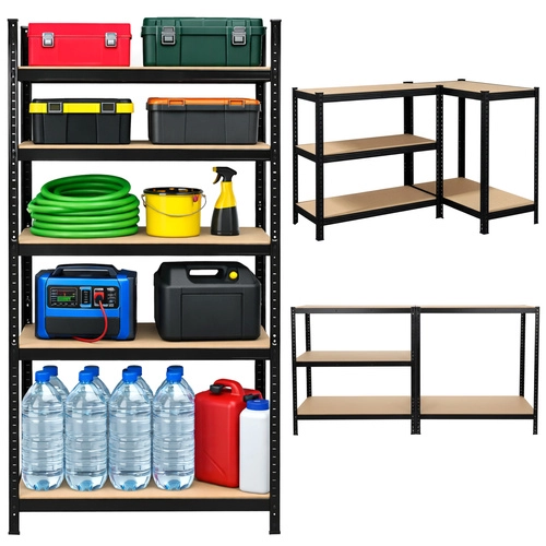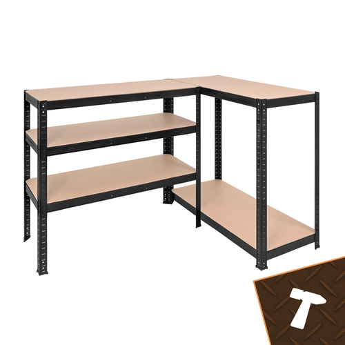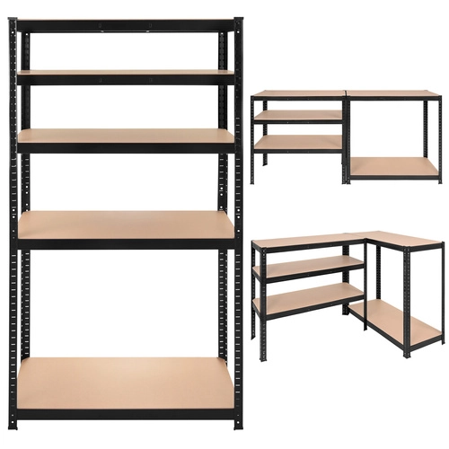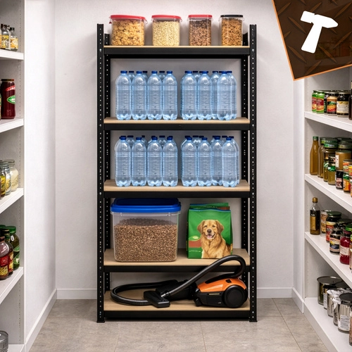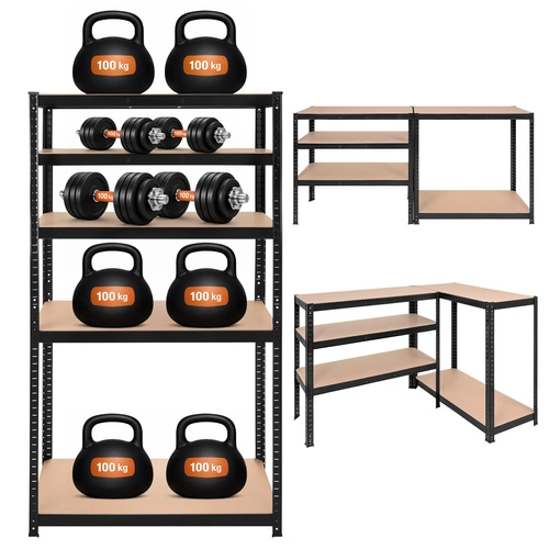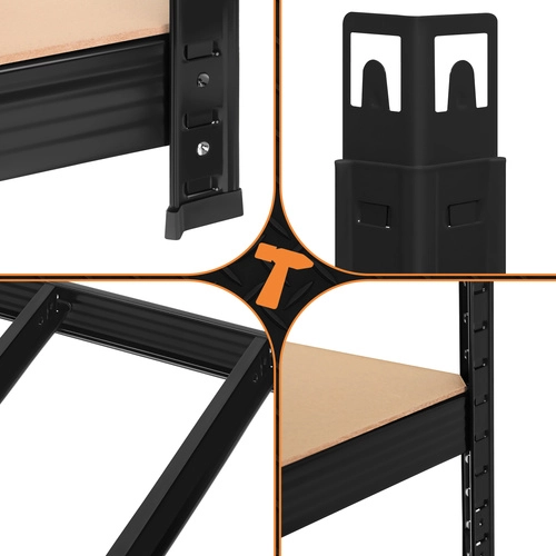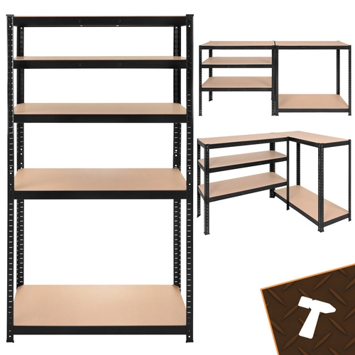Montaža je hitra in brez vijakov – posamezni elementi se med seboj zaskočijo, zadostuje gumijasto kladivo. Police je mogoče po višini nastavljati v korakih po 30 mm, zato zlahka shranite škatle, orodje, pnevmatike in zaloge. Sistem 3 v 1 omogoča postavitev visokega regala, razdelitev na dva nižja segmenta ali ustvarjanje kotne rešitve za maksimalen izkoristek prostora.