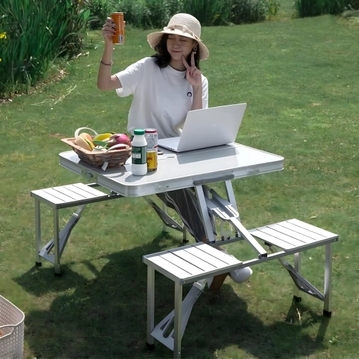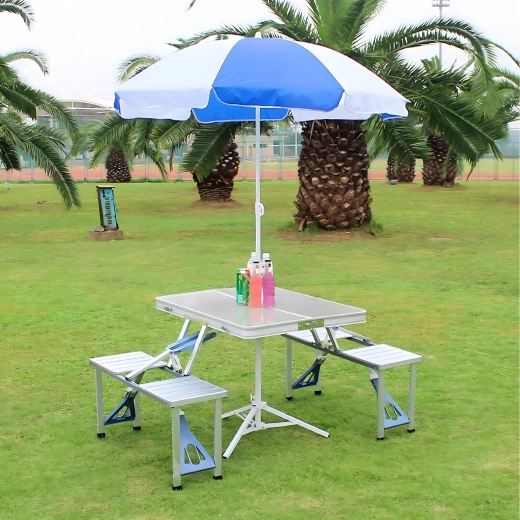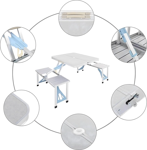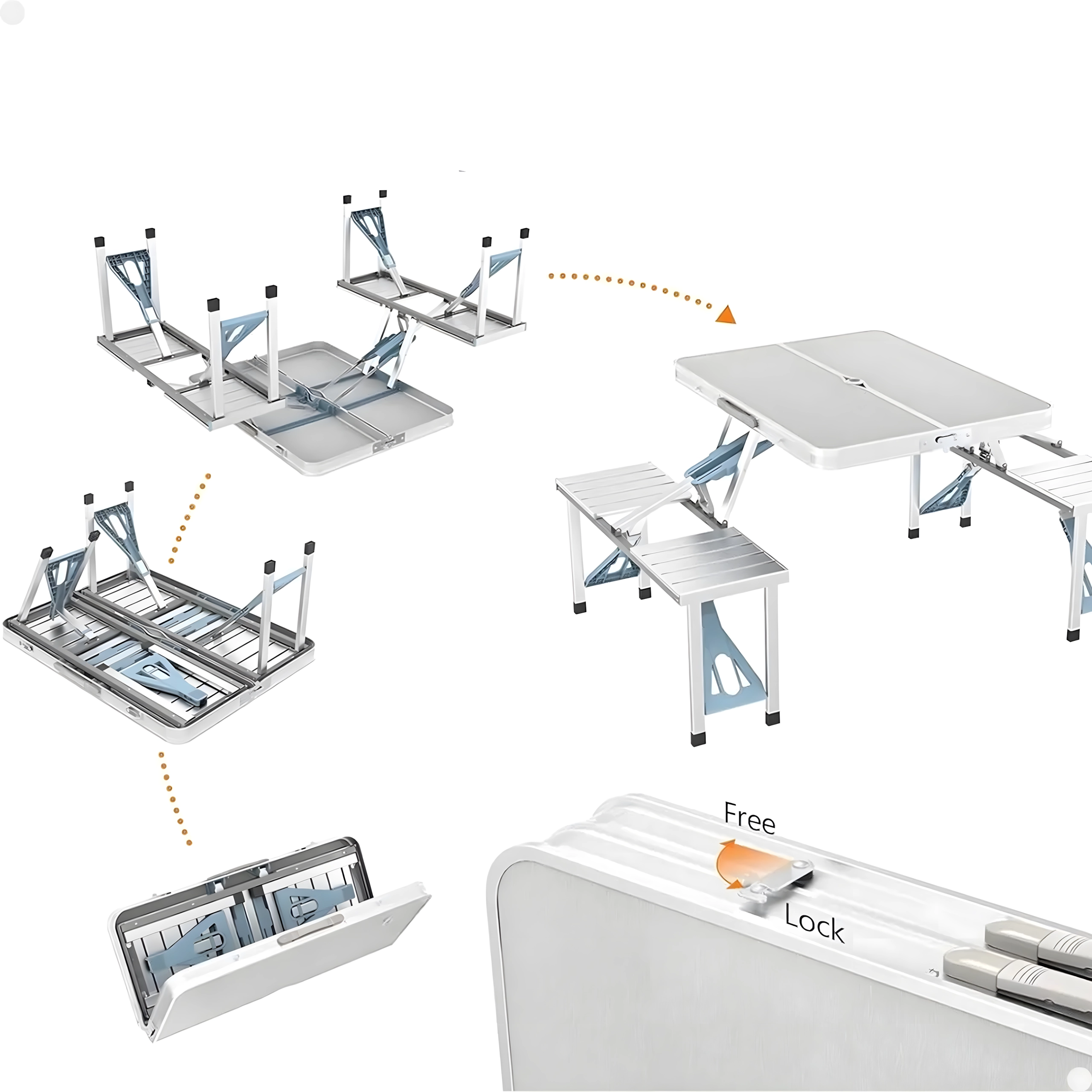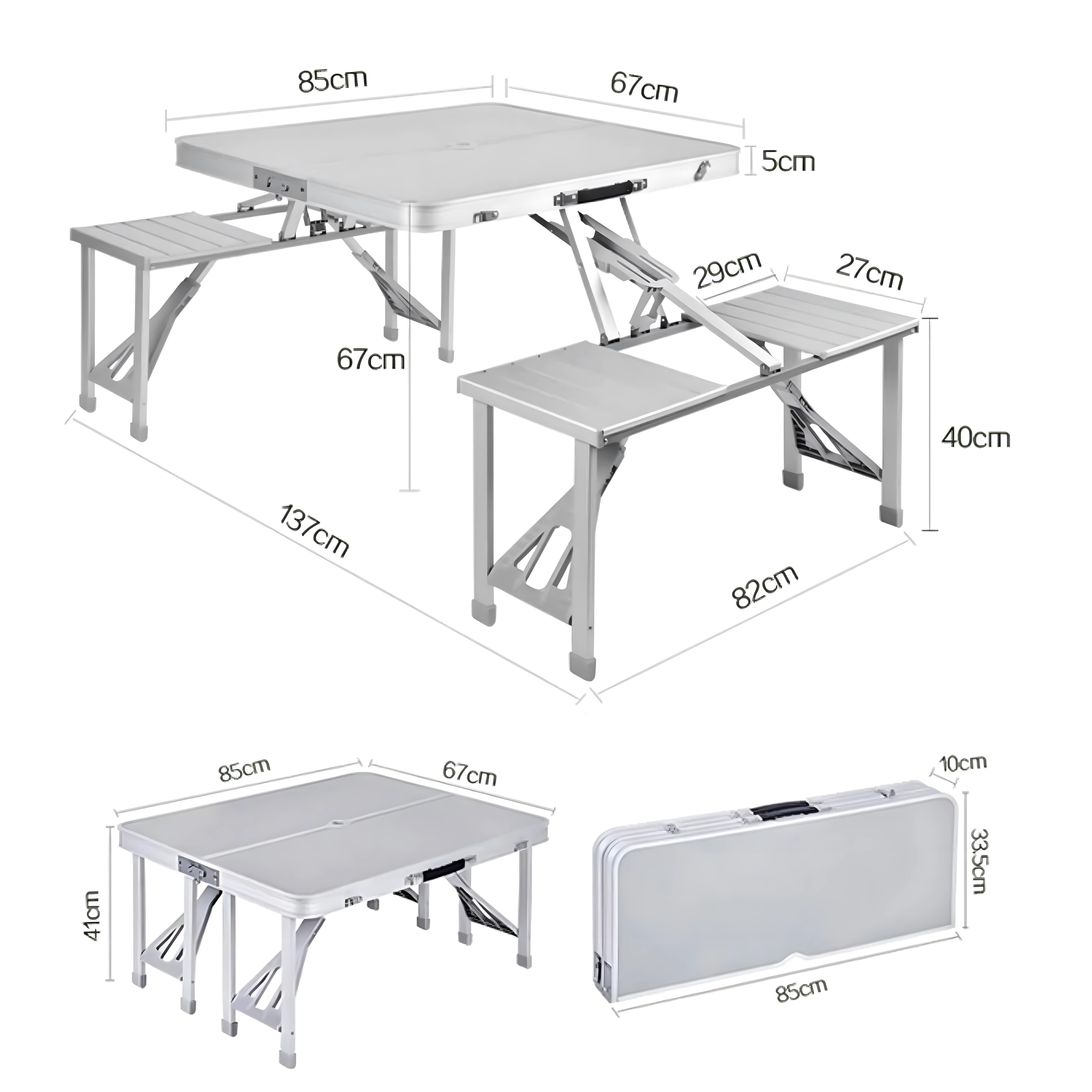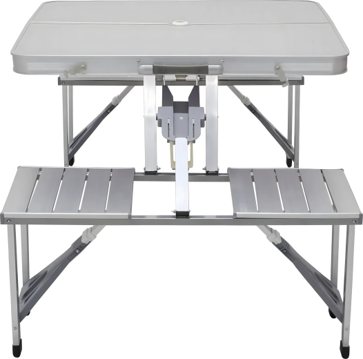 Praktična in lahka zložljiva kamping miza s 4 integriranimi sedeži je idealna za piknik, kampiranje, plažo in vrt. Trpežna kombinacija aluminija in PVC zagotavlja dolgo življenjsko dobo, po zlaganju se celoten set spremeni v kompakten kovček z ročajem. Miza ima odprtino za senčnik, zato boste uživali v prijetni senci tudi v vročih dneh.