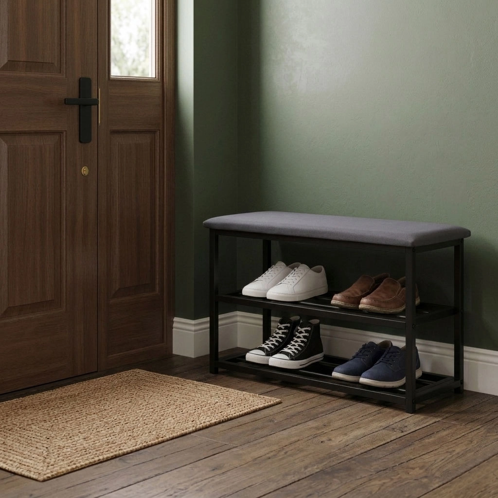 Sedež je sestavljen iz MDF plošče, plasti pene in prevleke iz žametne tkanine s skupno debelino približno 3 cm – prijeten na dotik, eleganten na pogled in udoben pri obuvanju ter sezuvanju. Odprt dizajn polic omogoča hiter dostop in boljše kroženje zraka, zato se obutev lažje suši in ostane sveža.